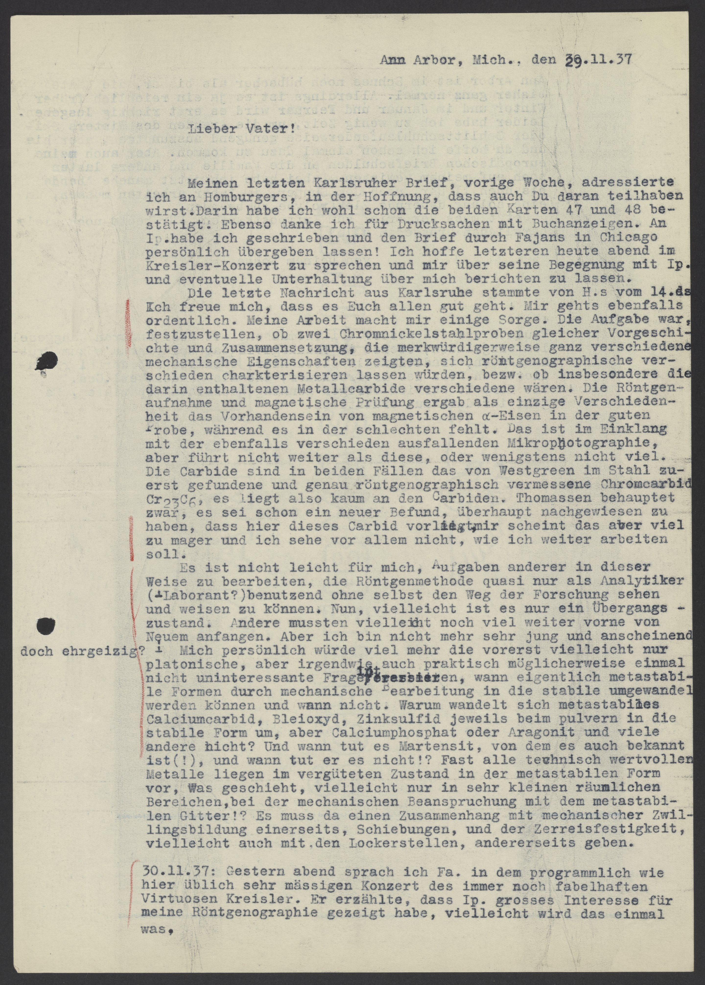 Letter from Max Bredig to Georg Bredig, November 29, 1937
