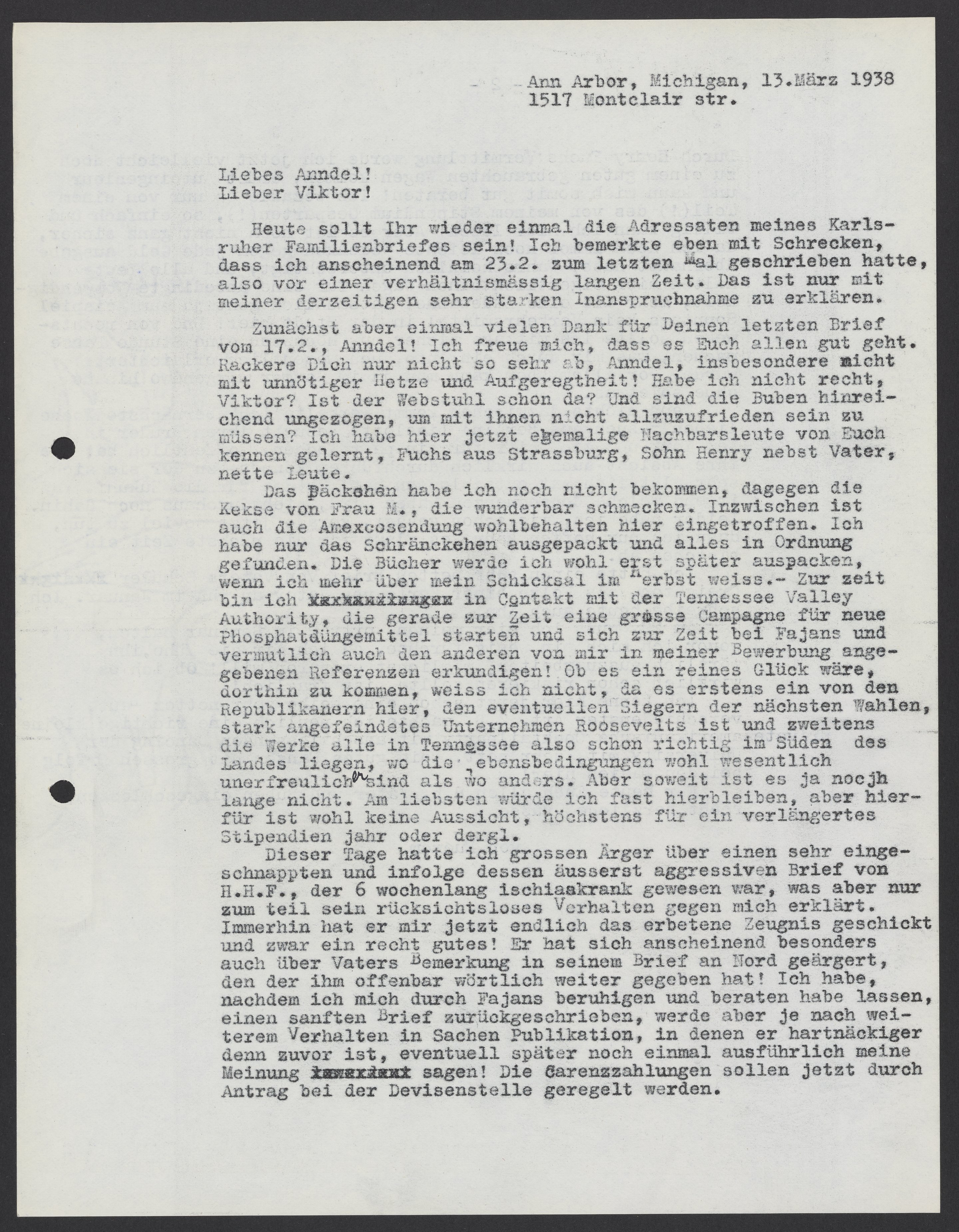 Letter from Max Bredig to Marianne and Viktor Homburger, March 13, 1938