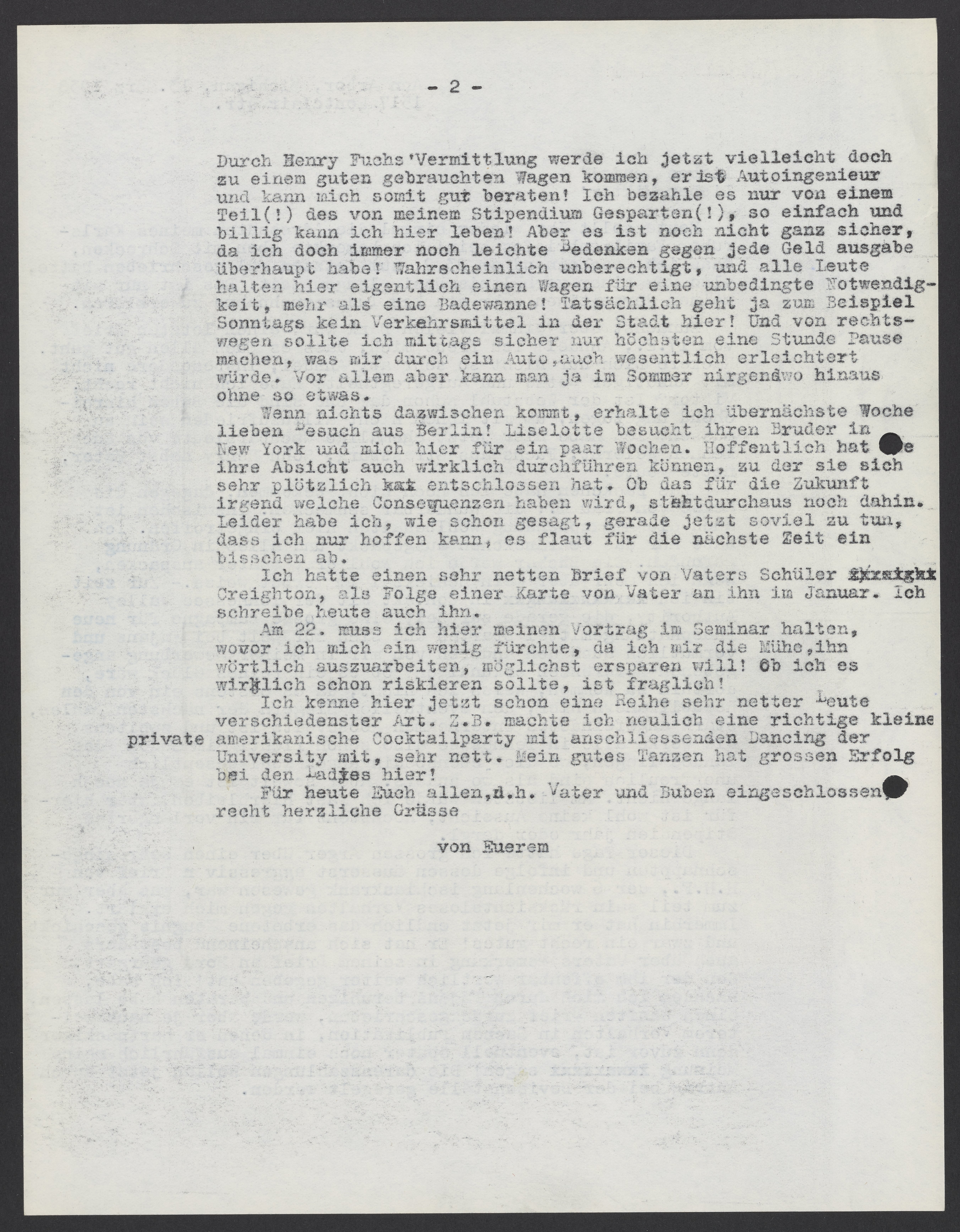 Small JPG1200 x 1541px — 379 KBLarge JPG2880 x 3698px — 2.0 MBFull-sized JPG5389 x 6919px — 6.2 MBOriginal fileTIFF — 5389 x 6919px — 107 MBMax Bredig (1902-1977) updates his family in Germany on his social and professional life at the University of Michigan in Ann Arbor, Michigan in the spring of 1938. He plans to buy a new car and give his first lecture at the university in English.