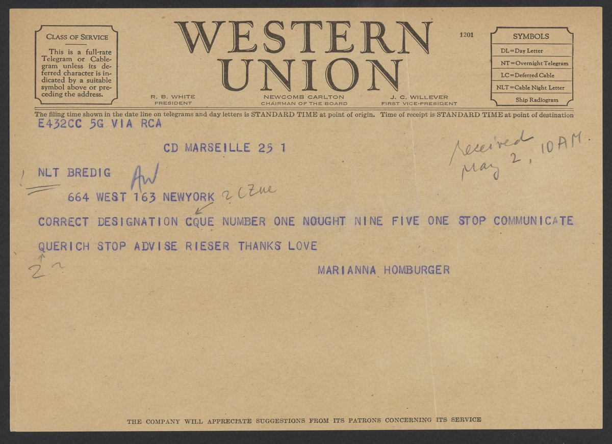 Telegram from Marianne Homburger to Max Bredig, April 1941