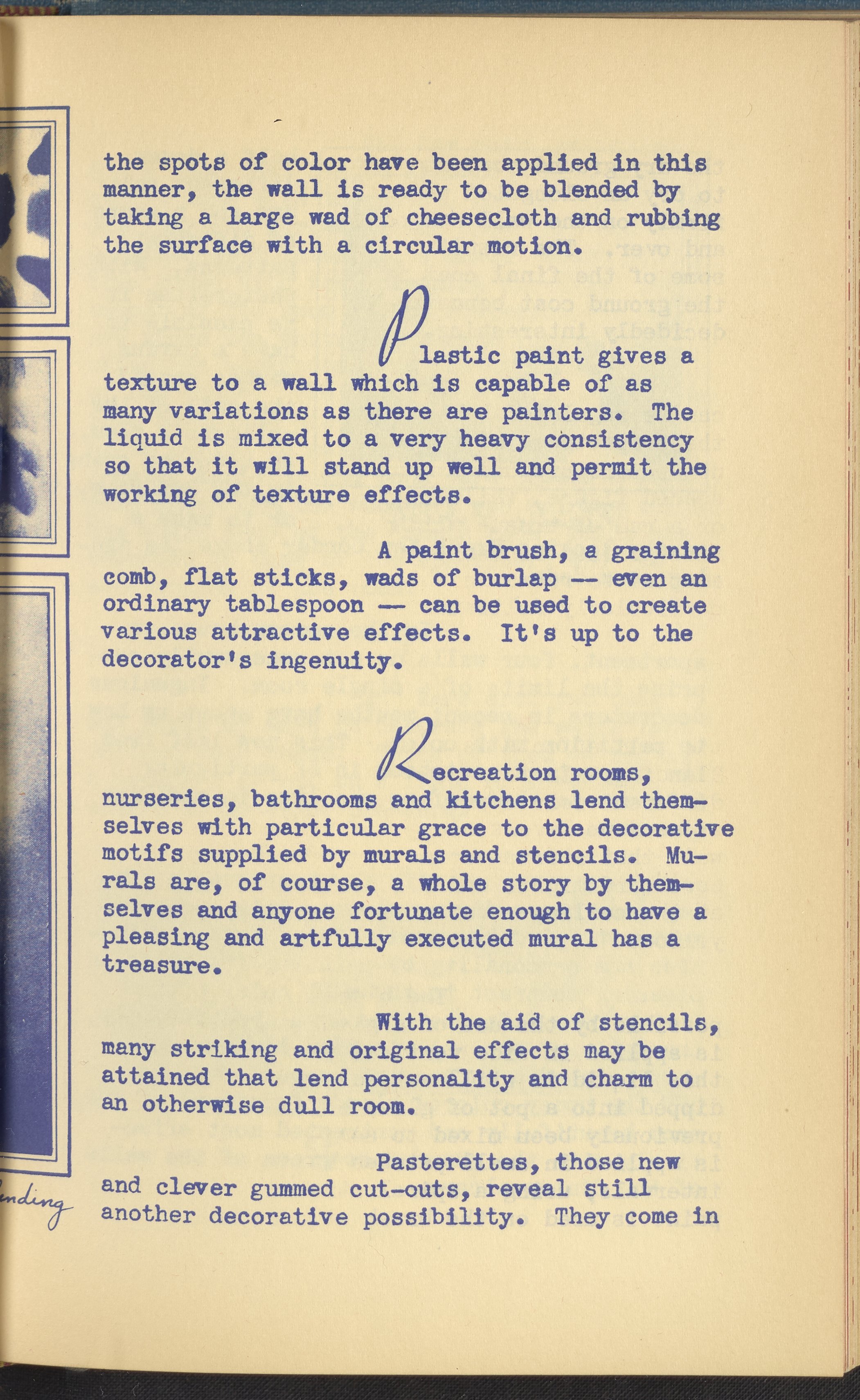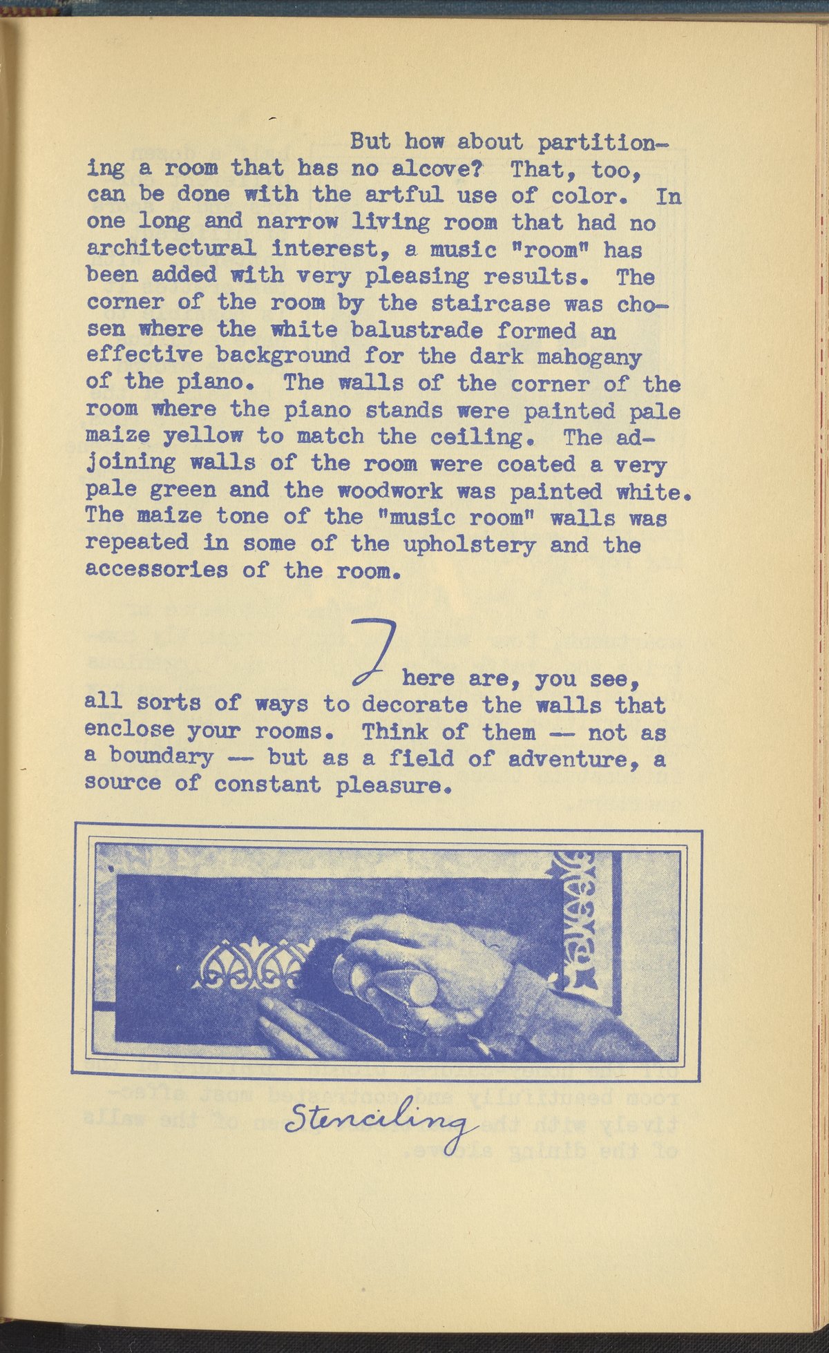 Booklet corresponding to a radio broadcast program created by the National Paint, Varnish, and Lacquer Association. The booklet discusses various methods to decorate one's walls. These methods include stippling, scumbling, murals, plastics, pasterettes, and stenciling. Describes each technique and where it is most effectively employed. Includes small stylized illustrations throughout and decorated covers.
