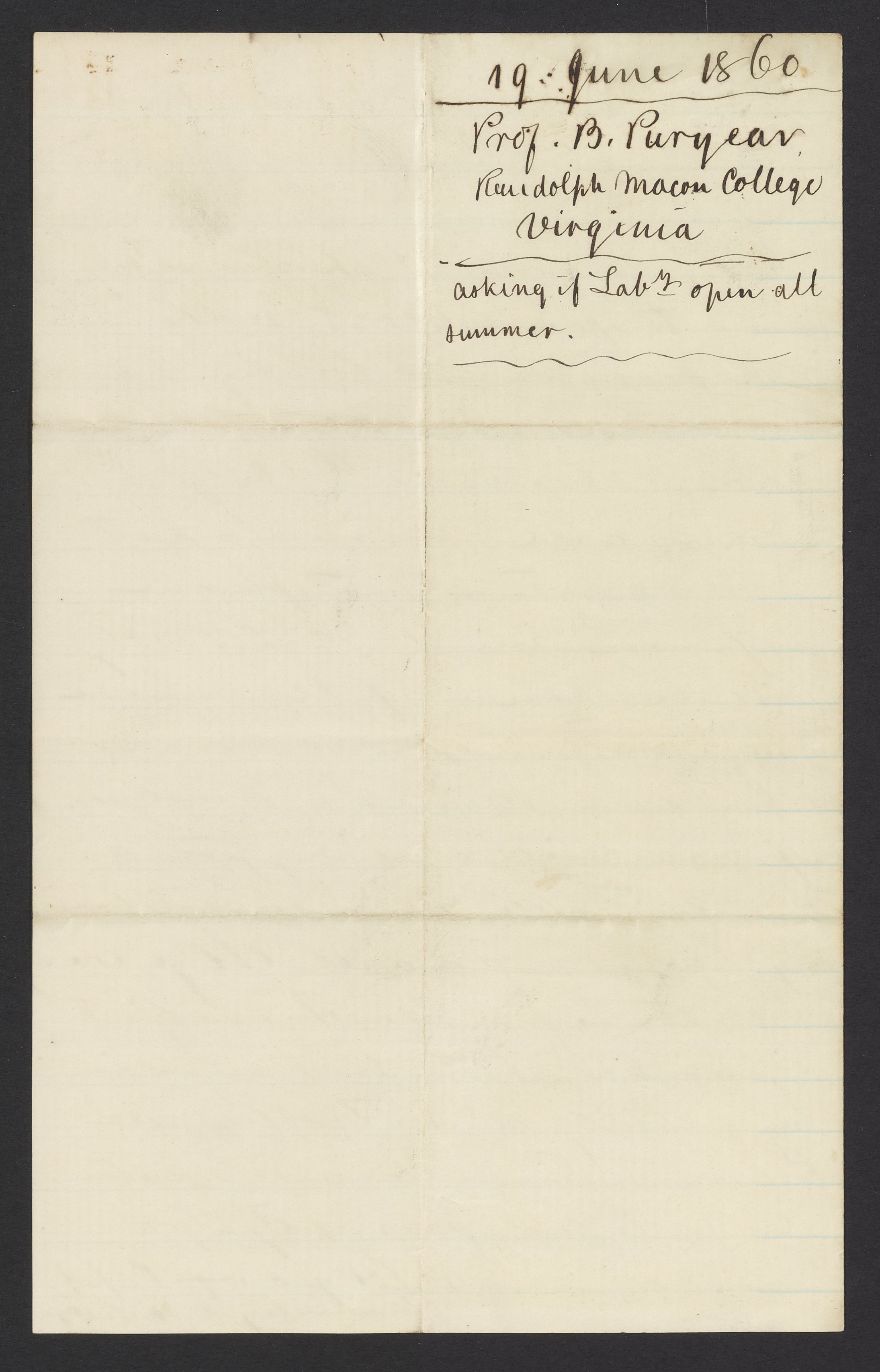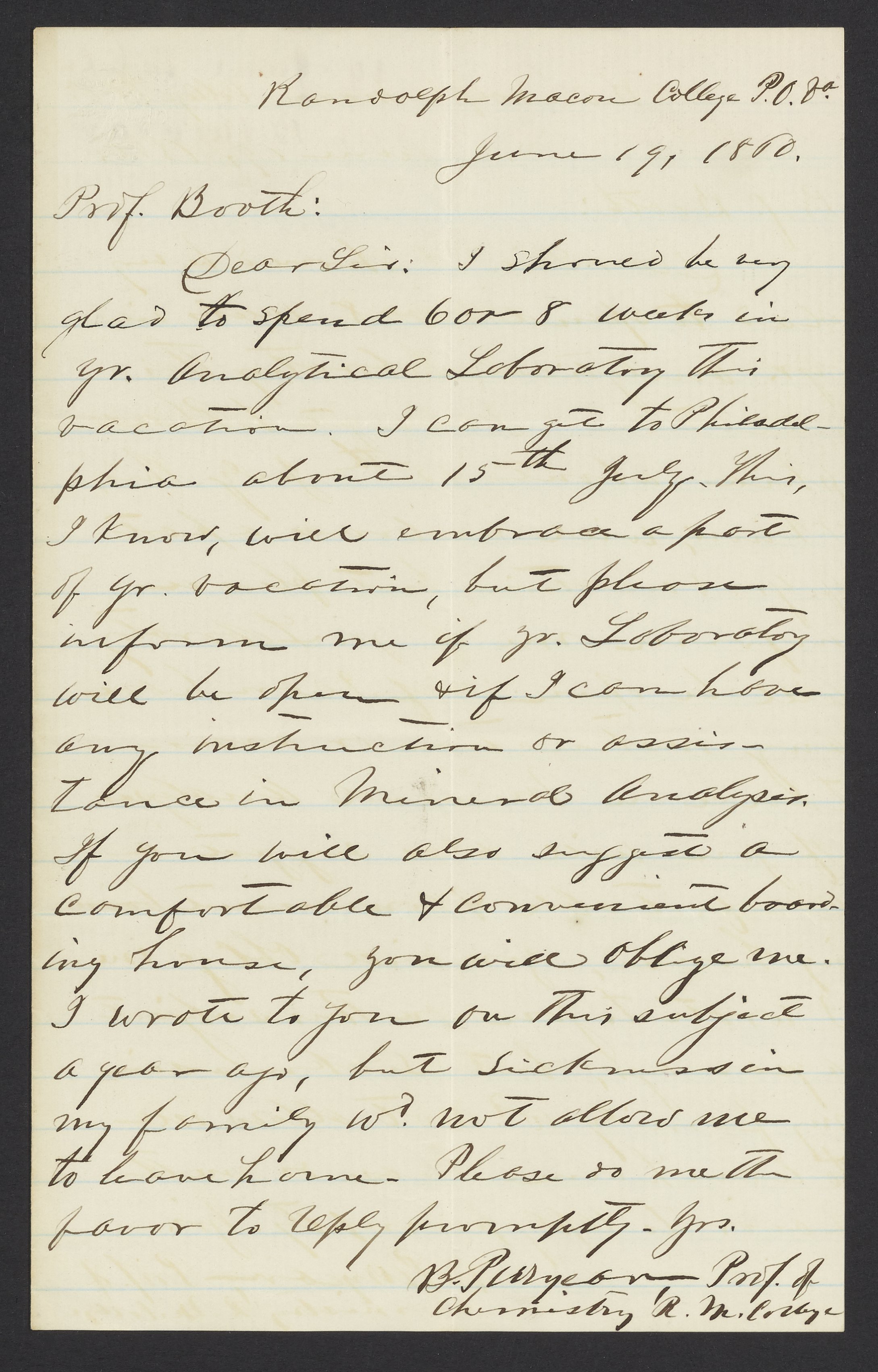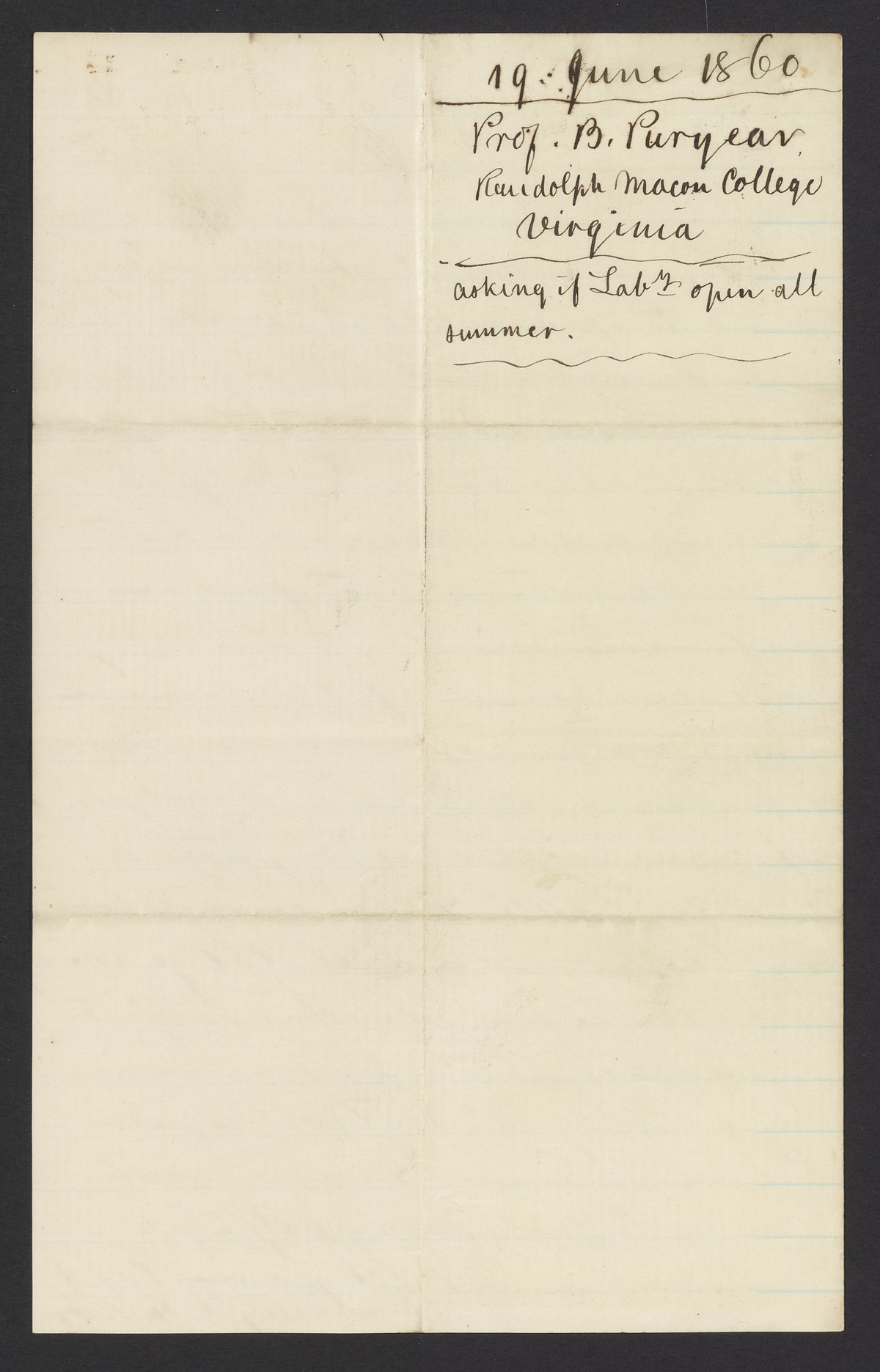 Professor B. Puryear asks James Curtis Booth (1810-1888) if his laboratory will be open all summer.