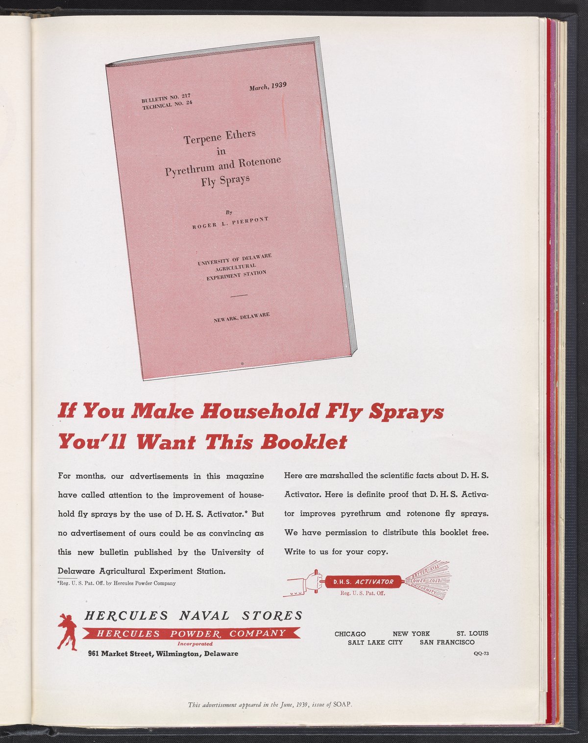 Hercules Incorporated. “If You Make Household Fly Sprays You'Ll Want This Booklet.” 1939 Hercules Advertisements, 1939. Records of Hercules Incorporated, Volume 1939. Science History Institute. Philadelphia. https://digital.sciencehistory.org/works/q524jp559.