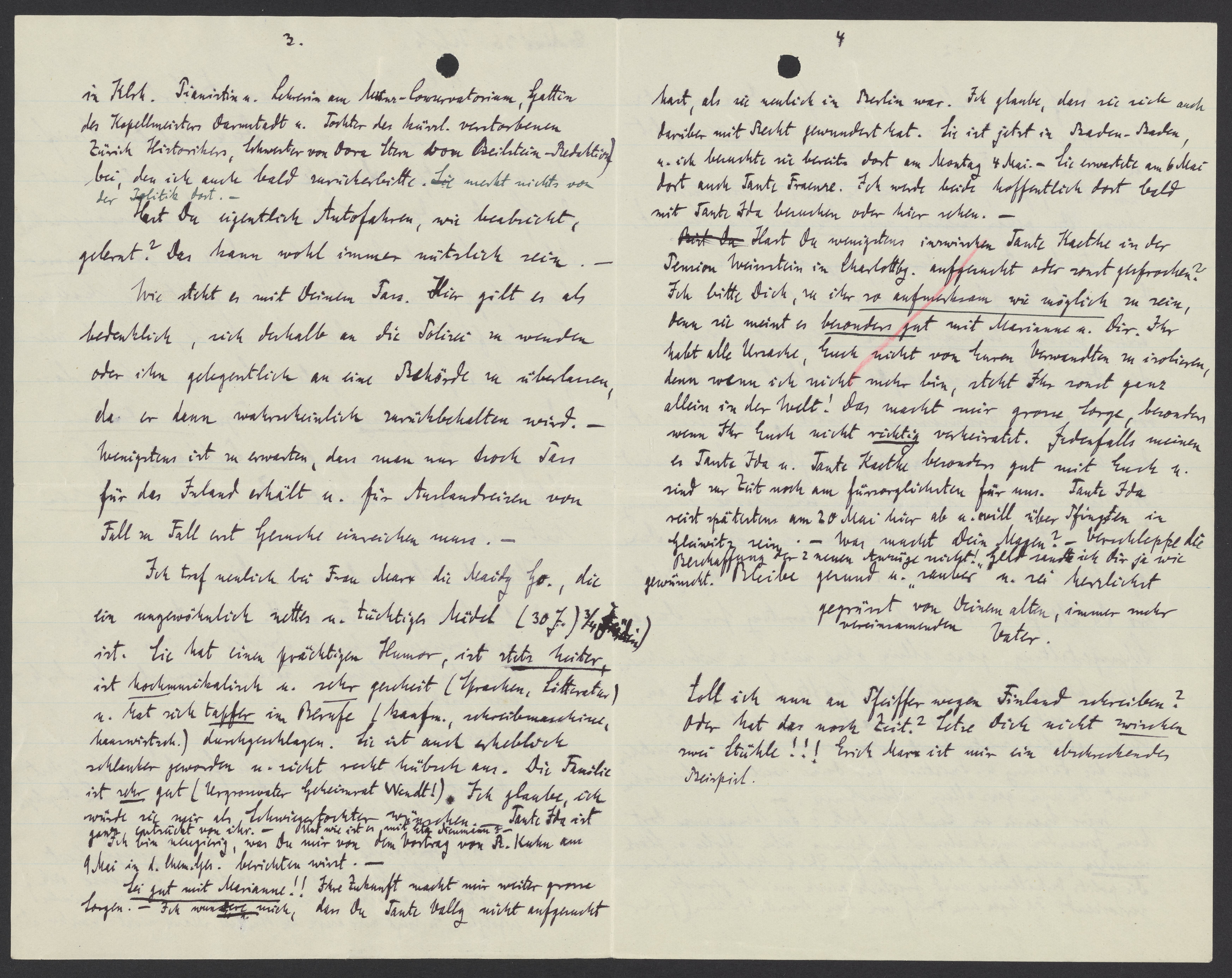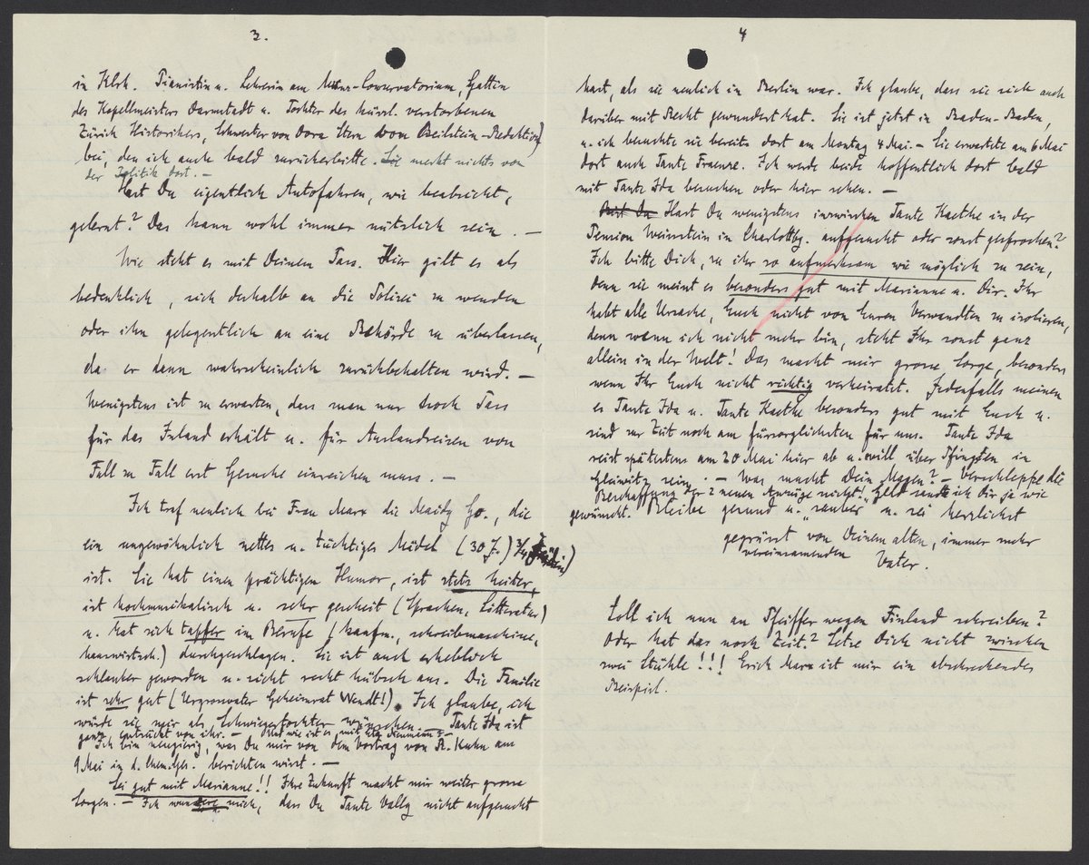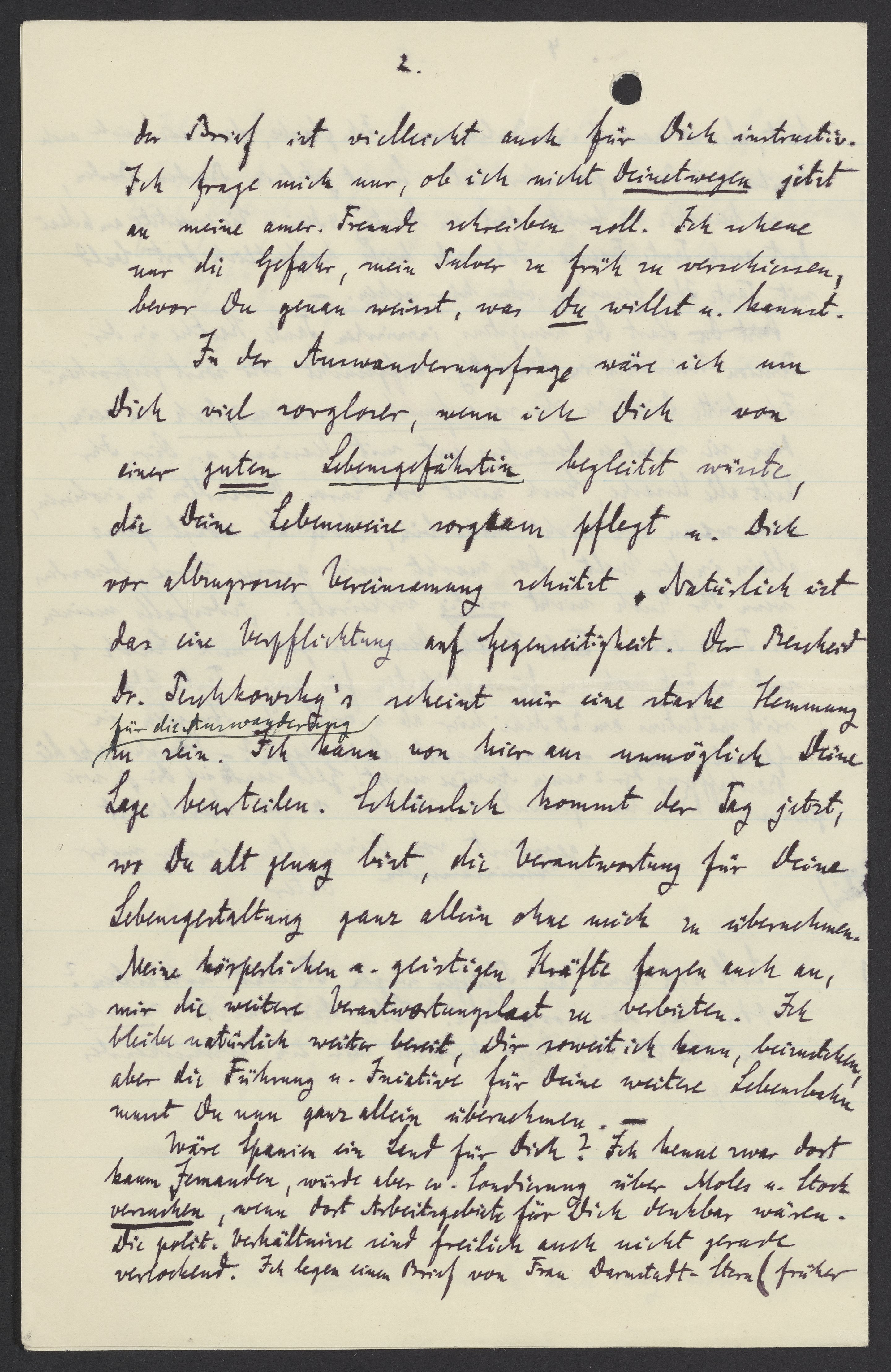 Regarding emigration, I would be much less concerned about you if I knew you were accompanied by a good life partner who can carefully take care of your needs and protect you from being too lonely. Of course, this is a mutual obligation. Dr. Peschkowsky's decision seems to me to be a large obstacle to emigration. It’s impossible for me to assess your situation from here. The day is finally here when you are old enough to take responsibility for your life independently without me. My physical and mental strength are also beginning to prevent me from bearing any further responsibility. Of course, I remain ready to help you as much as I can, but you must now take the lead and initiative for your further life path independently.