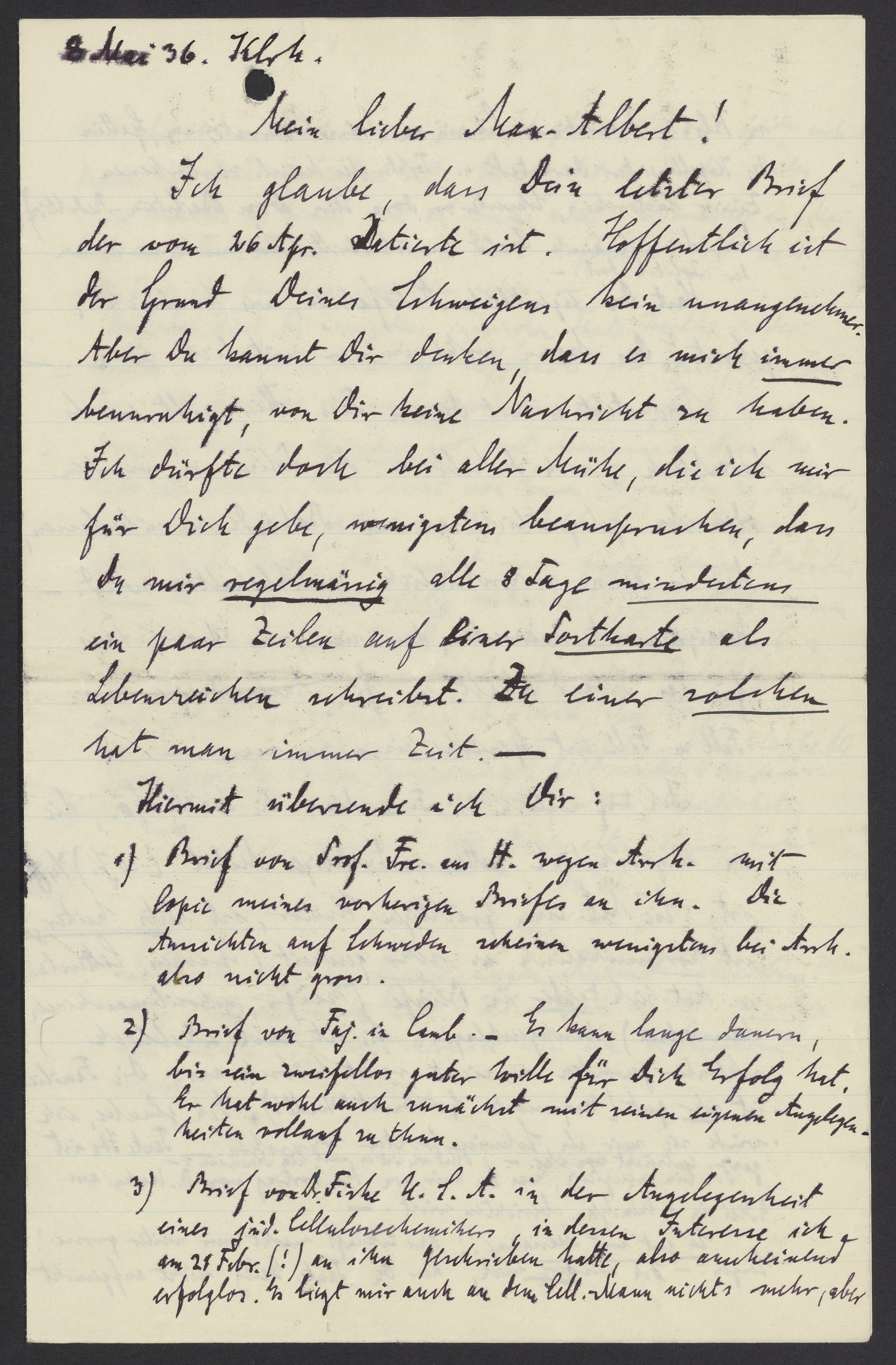 Bredig, Georg. “Letter from Georg Bredig to Max Bredig, May 8, 1936,” May 8, 1936. Papers of Georg and Max Bredig, Box 7, Folder 12. Science History Institute. Philadelphia. https://digital.sciencehistory.org/works/q5jej4r.