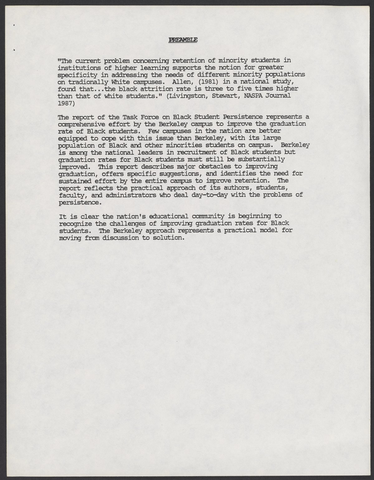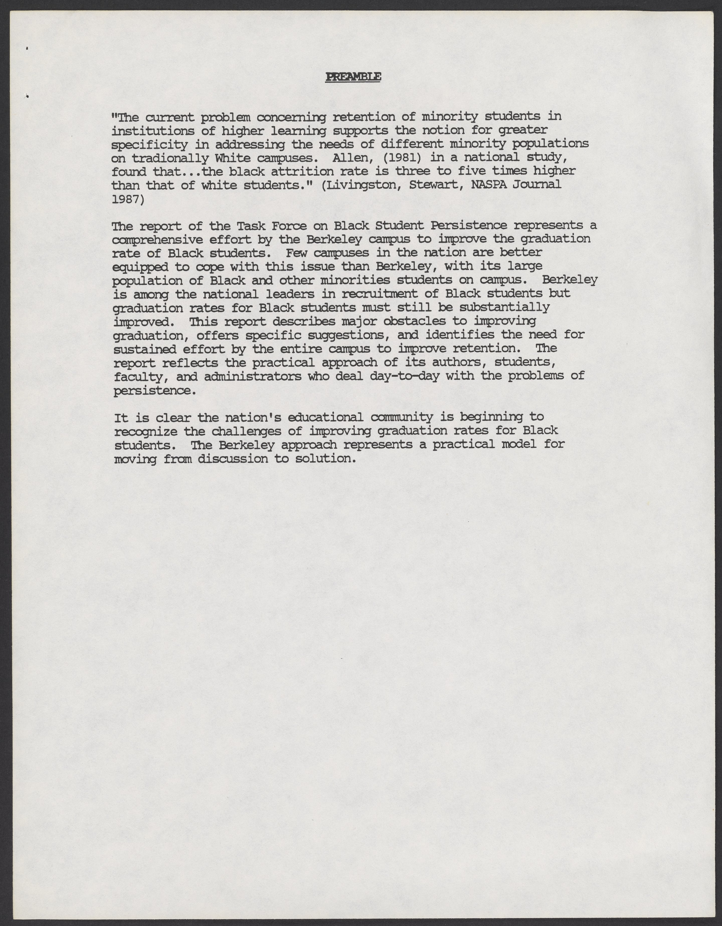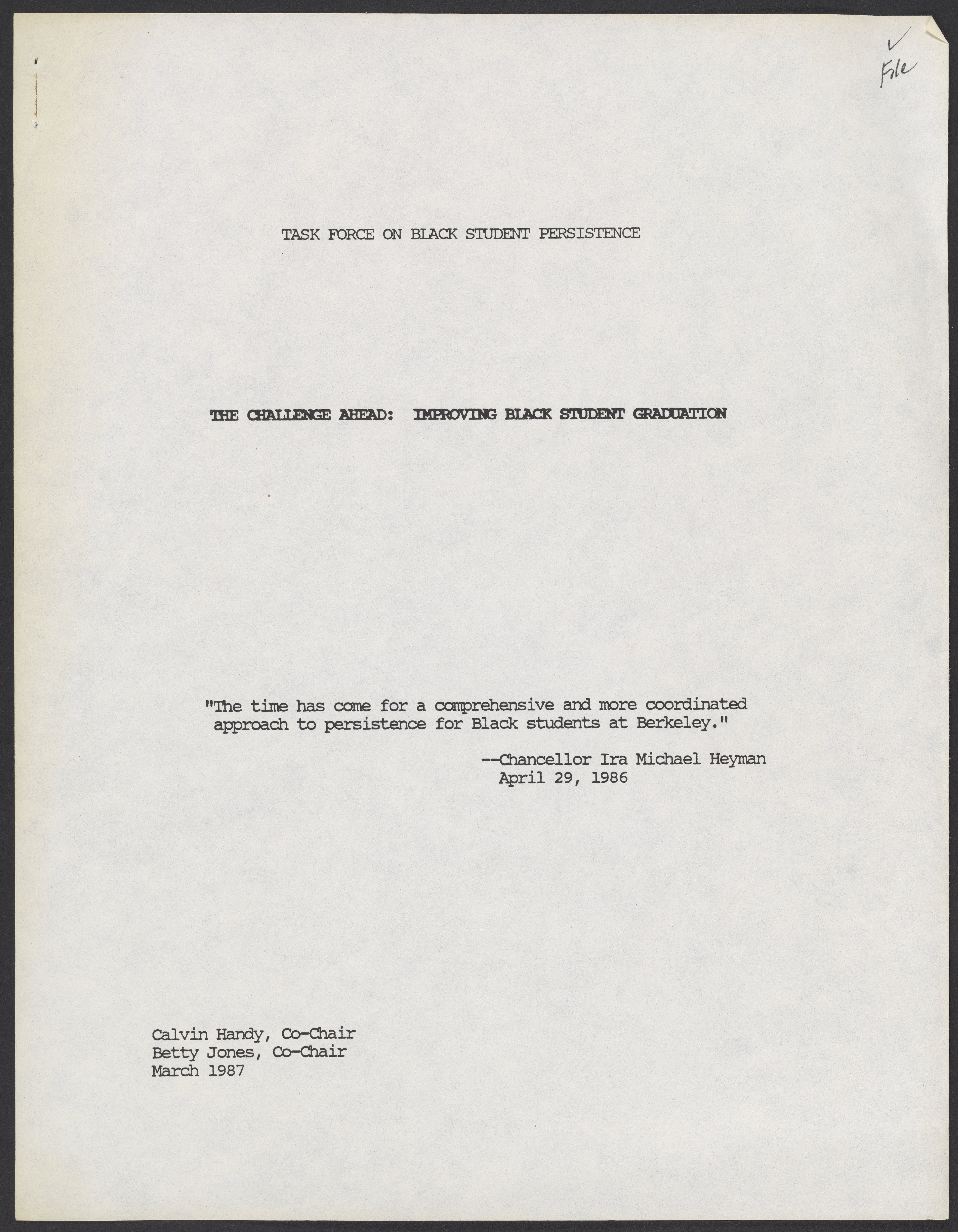 Small JPG1200 x 1543px — 166 KBLarge JPG2880 x 3704px — 1.3 MBFull-sized JPG5346 x 6876px — 5.1 MBOriginal fileTIFF — 5346 x 6876px — 105 MBA report by the University of California, Berkeley's Task Force on Black Student Persistence about Black and minority student graduation. The Task Force was co-chaired by Calvin Handy and Betty Jones. The report makes recommendations including but not limited to establishing a faculty coordinator to support Black students, and implementing policies that support minority students.