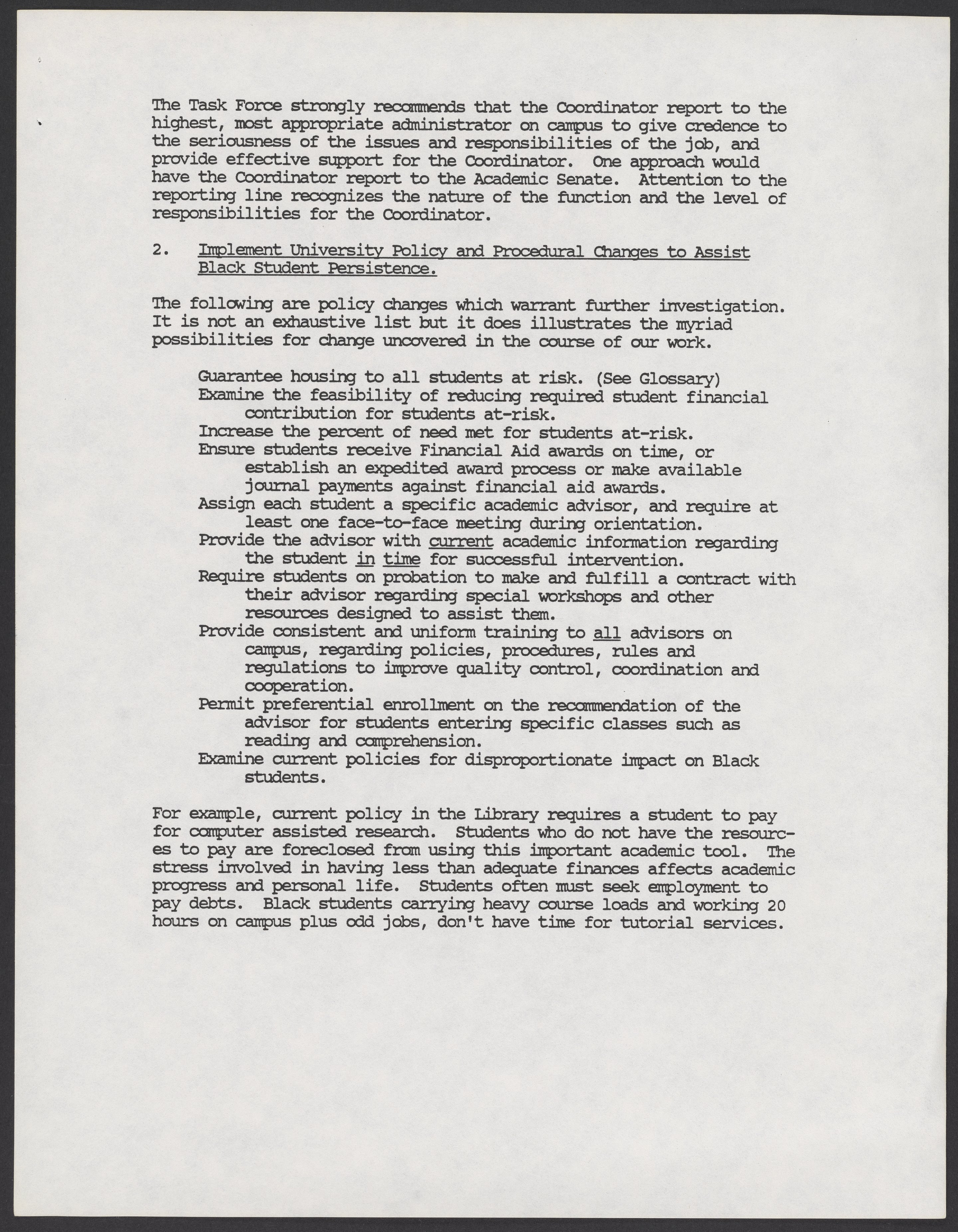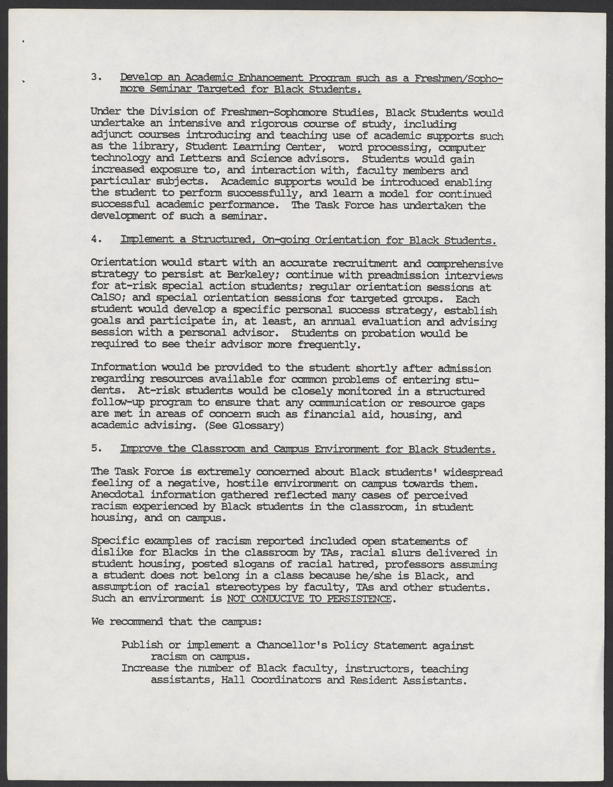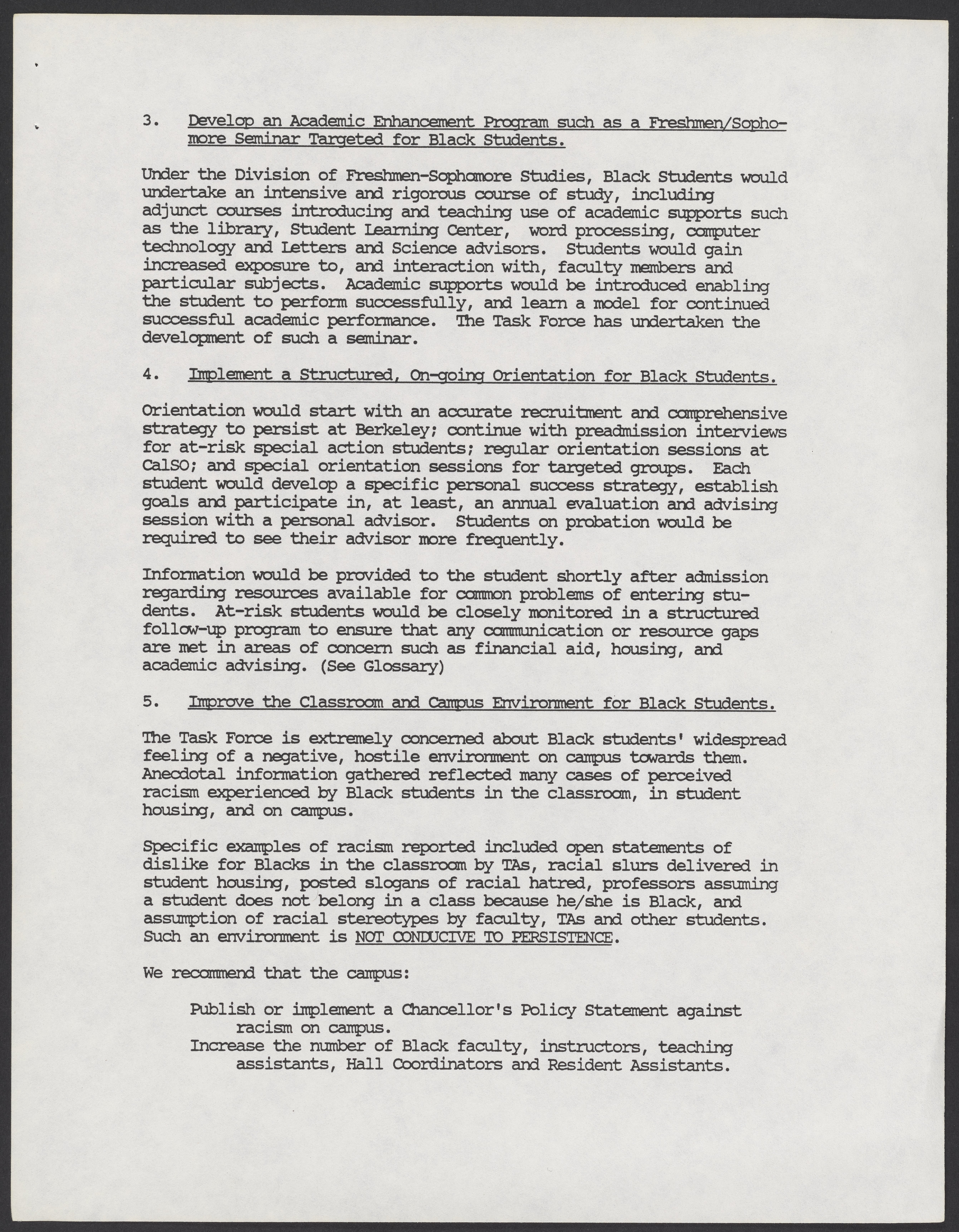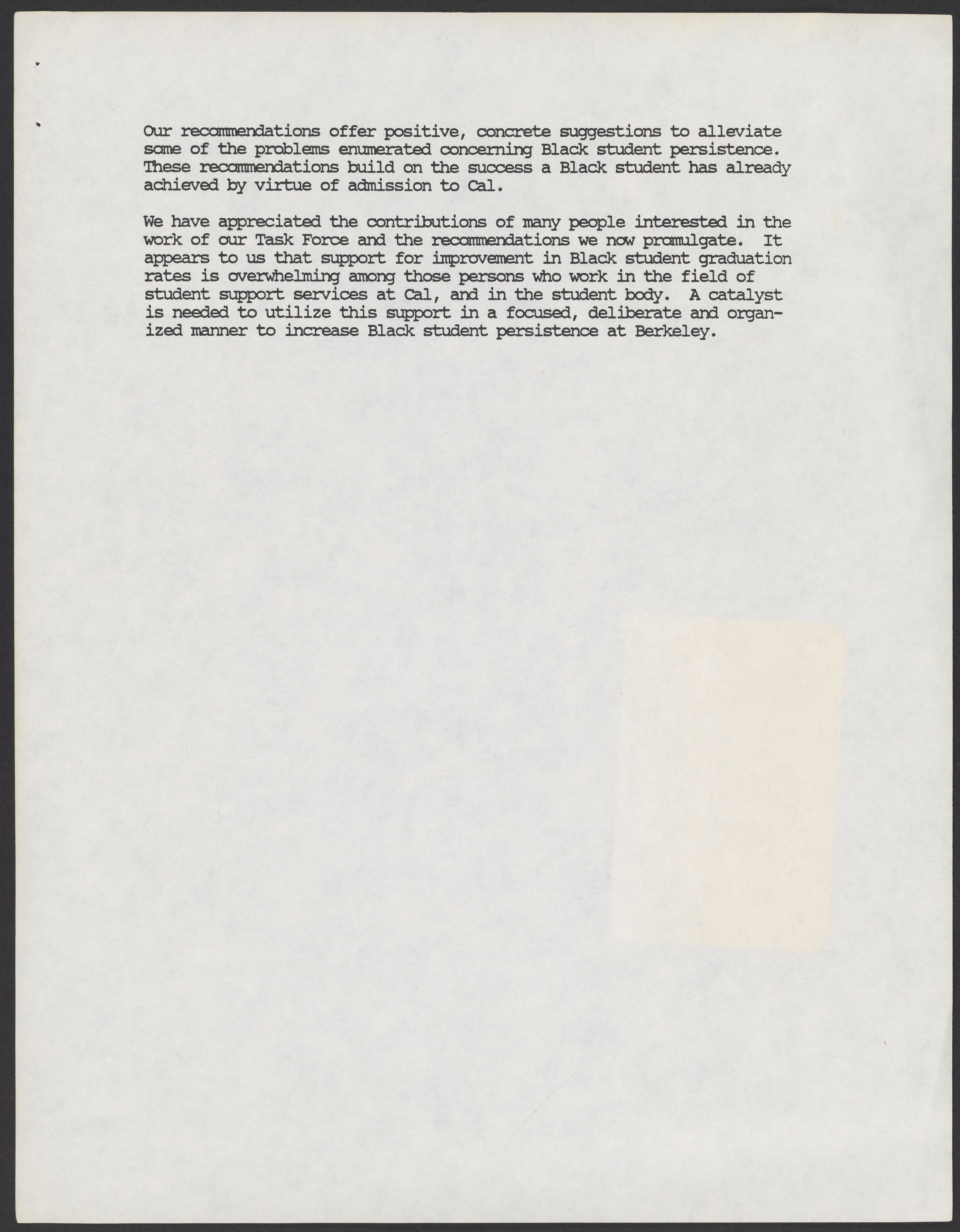 Small JPG1200 x 1543px — 166 KBLarge JPG2880 x 3704px — 1.3 MBFull-sized JPG5346 x 6876px — 5.1 MBOriginal fileTIFF — 5346 x 6876px — 105 MBA report by the University of California, Berkeley's Task Force on Black Student Persistence about Black and minority student graduation. The Task Force was co-chaired by Calvin Handy and Betty Jones. The report makes recommendations including but not limited to establishing a faculty coordinator to support Black students, and implementing policies that support minority students.
