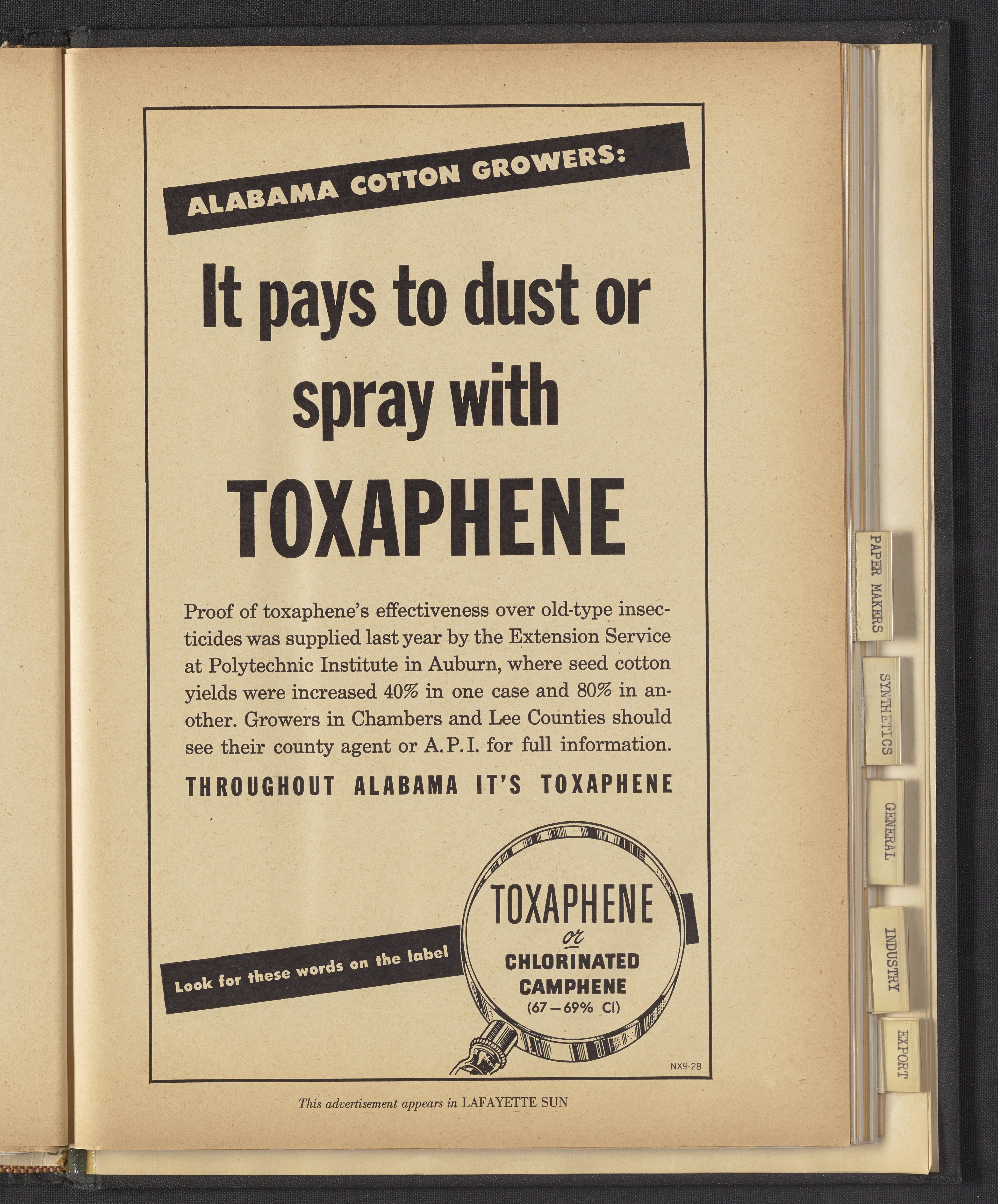 Hercules Incorporated. “Alabama Cotton Growers: It Pays to Dust or Spray with Toxaphene.” 1949 Hercules Advertisements, 1949. Records of Hercules Incorporated, Volume 1949. Science History Institute. Philadelphia. https://digital.sciencehistory.org/works/q811kk416.