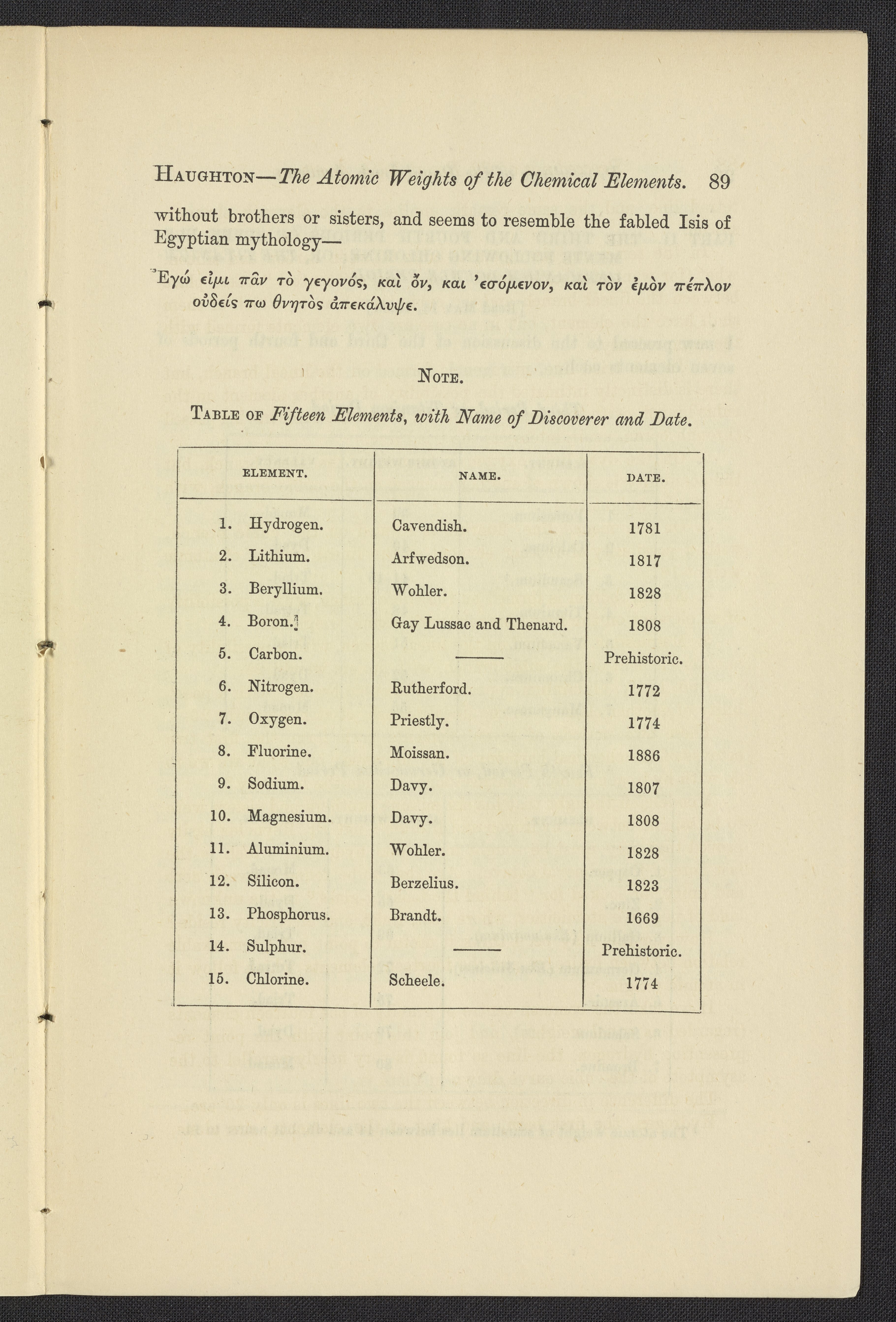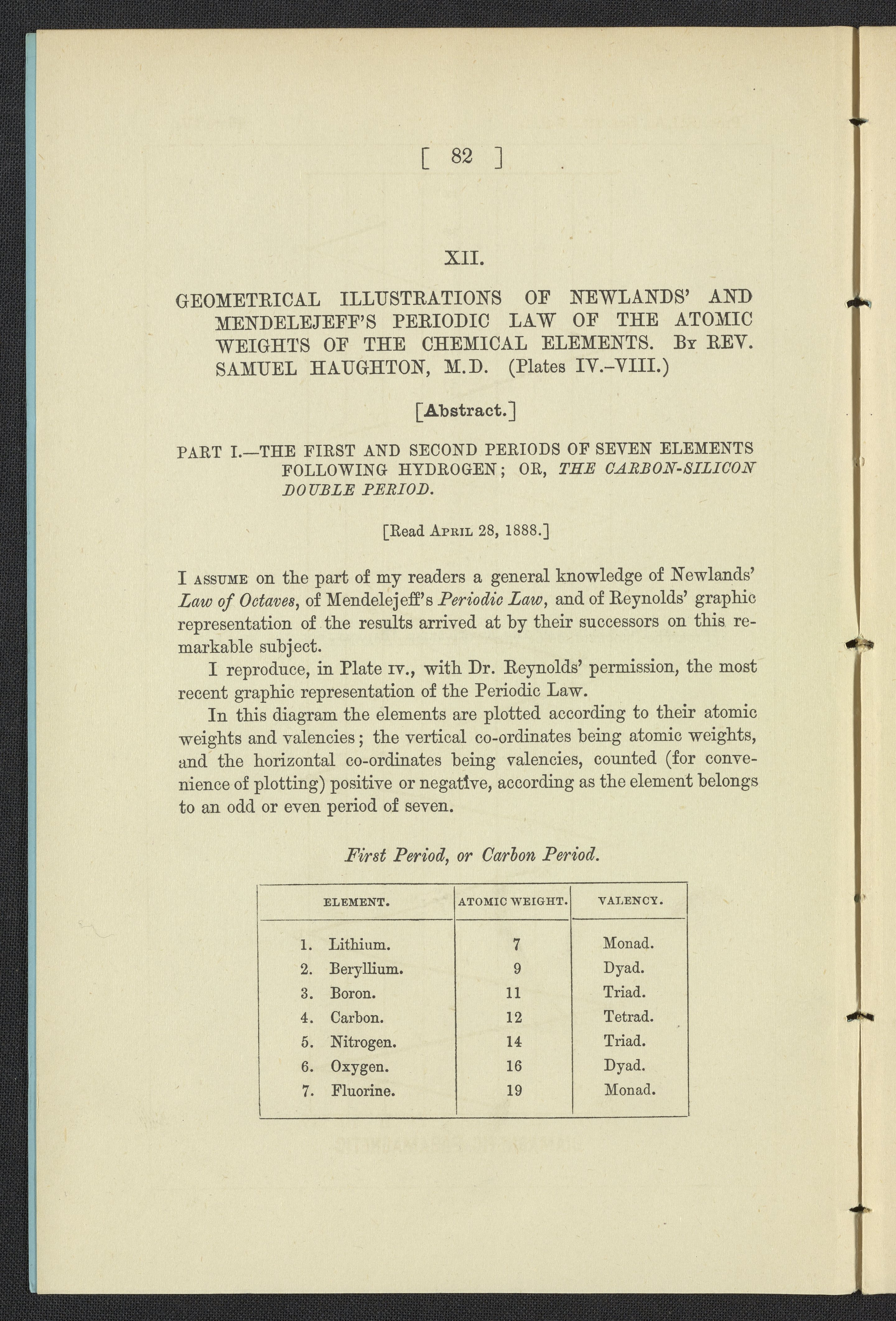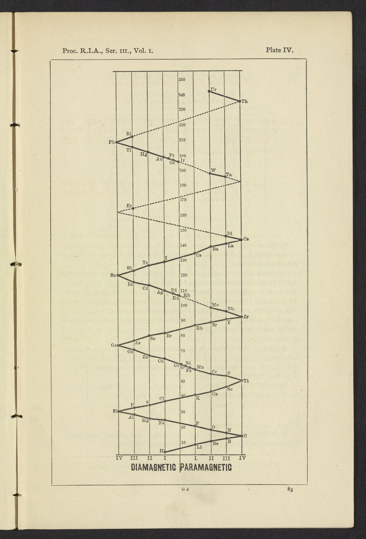 Haughton, Samuel. “Geometrical Illustrations of Newlands' and Mendelejeff's Periodic Law of the Atomic Weights of the Chemical Elements.” Dublin, Ireland, 1889. https://digital.sciencehistory.org/works/q811kk751.
