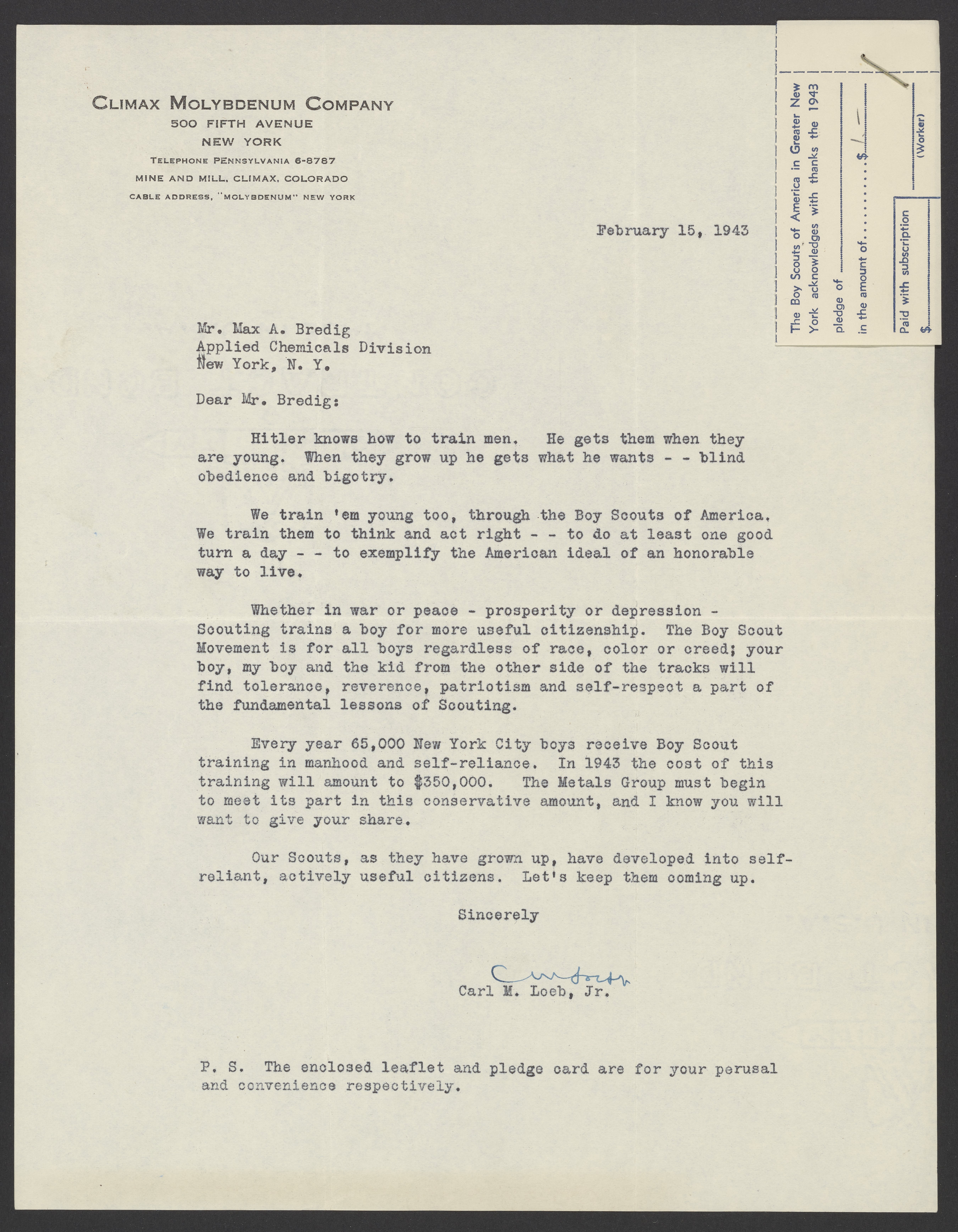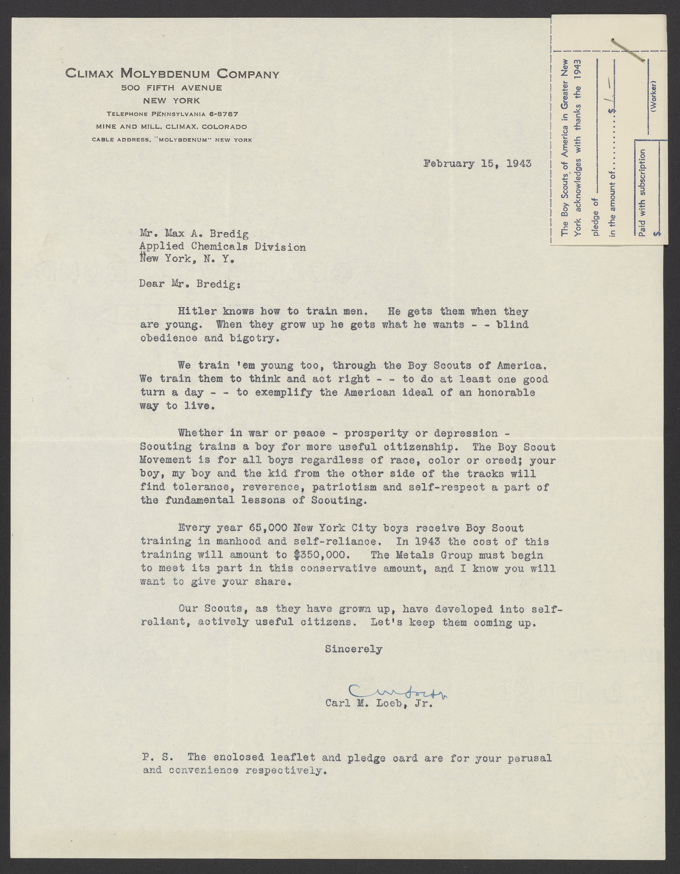 Letter requesting financial support of the Boy Scouts of America from Max Albert Bredig (1902-1977).
