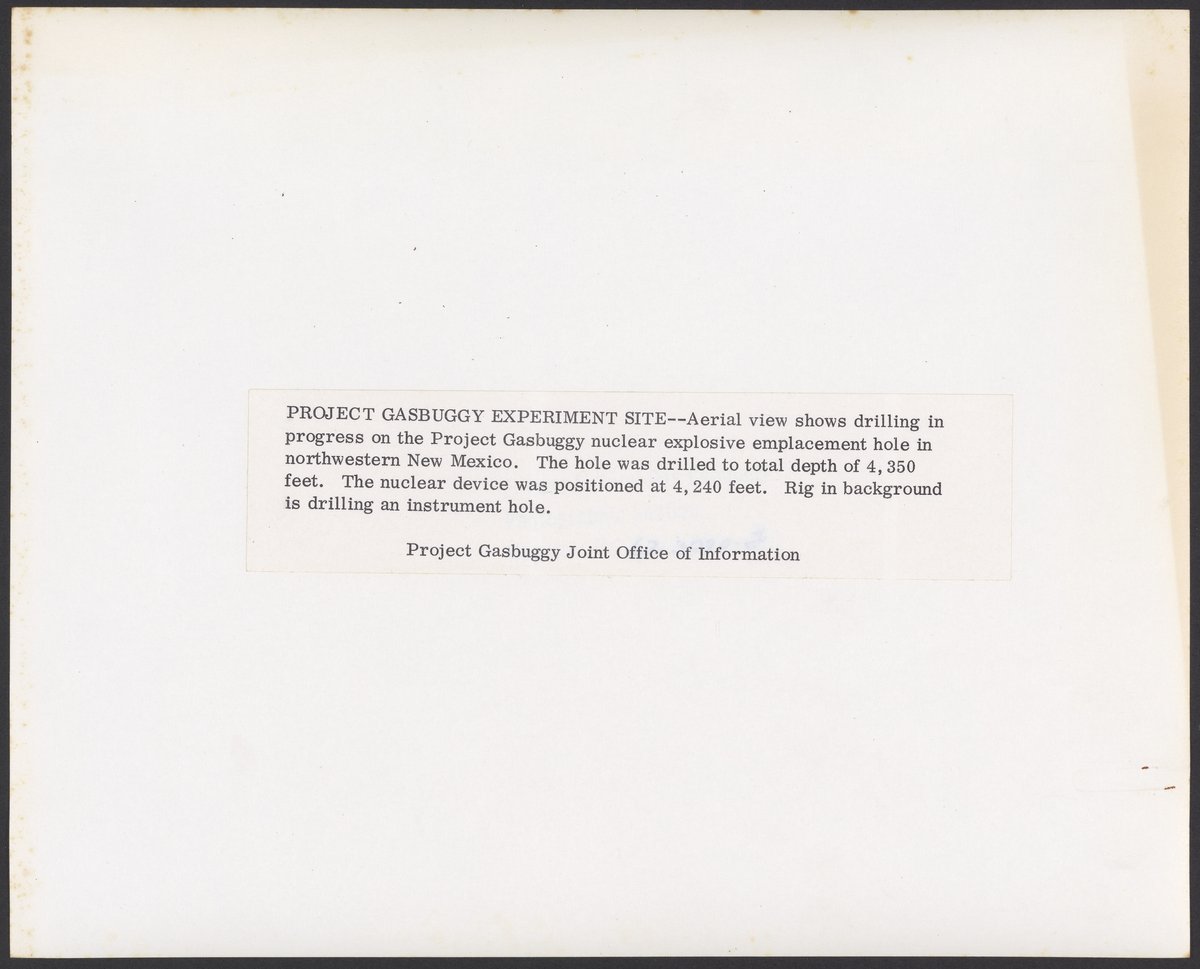 Small JPG1200 x 968px — 226 KBLarge JPG2880 x 2323px — 961 KBFull-sized JPG6237 x 5030px — 3.1 MBOriginal fileTIFF — 6237 x 5030px — 89.8 MBBlack and white photograph of the Project Gasbuggy experiment site. Aerial view shows rig and drilling in progress.