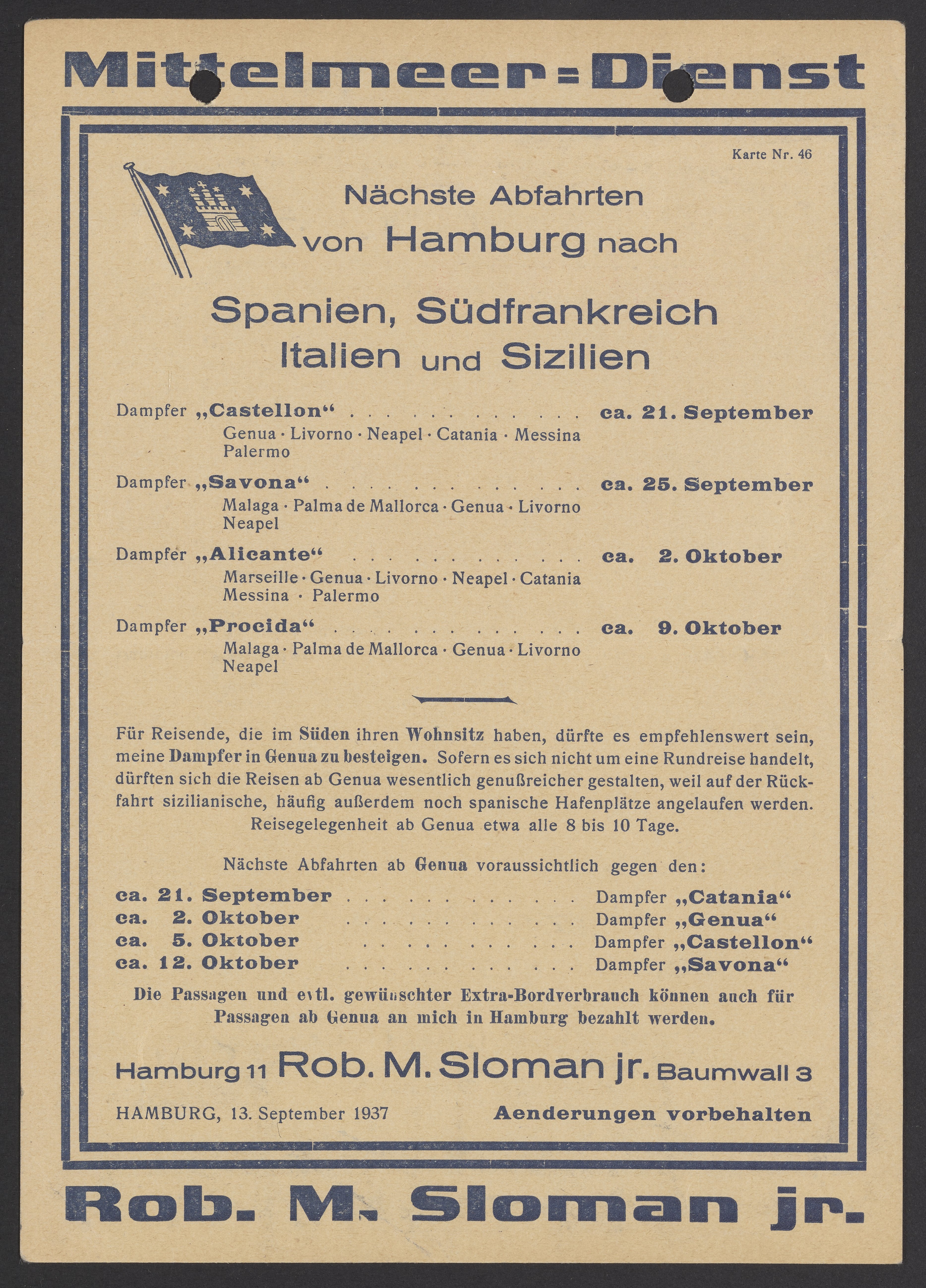 Small JPG1200 x 858px — 167 KBLarge JPG2880 x 2058px — 1022 KBFull-sized JPG3754 x 2683px — 1.6 MBOriginal fileTIFF — 3754 x 2683px — 28.9 MBListings of Mediterranean Service departures from the company, Rob. M. Sloman Jr. The record includes departure times for the steamships Castellon, Savona, Alicante, and Procida . The ships departed from Hamburg, Germany, for travel to Spain, Southern France, Italy, and Sicily.