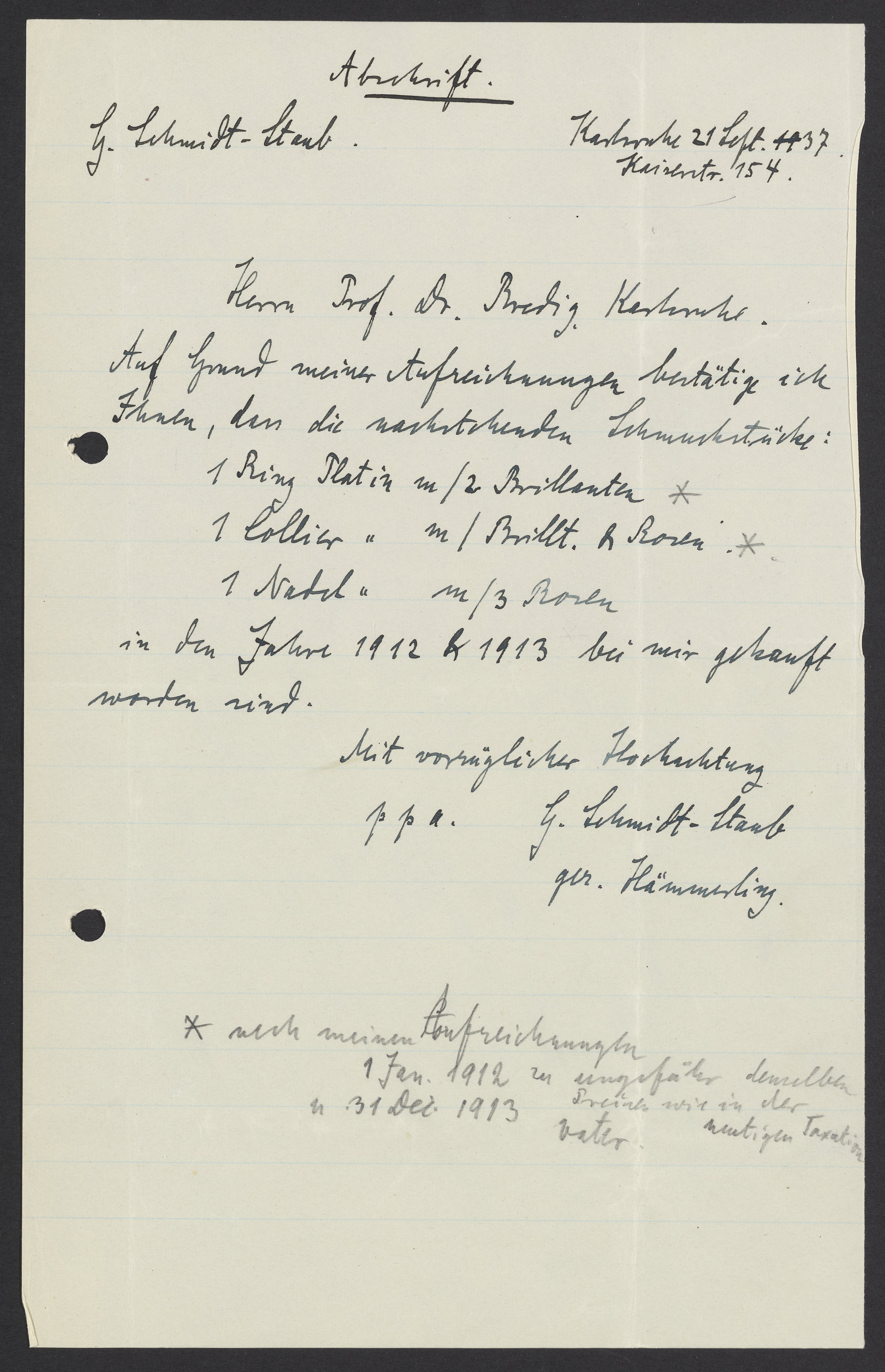 Small JPG1200 x 1860px — 269 KBLarge JPG2880 x 4465px — 1.5 MBFull-sized JPG3584 x 5556px — 2.3 MBOriginal fileTIFF — 3584 x 5556px — 57.0 MBG. Schmidt-Staub, a jeweler in Karlsruhe, informs Georg Bredig (1868-1944) of the value of four jewelry pieces that he would like to sell.