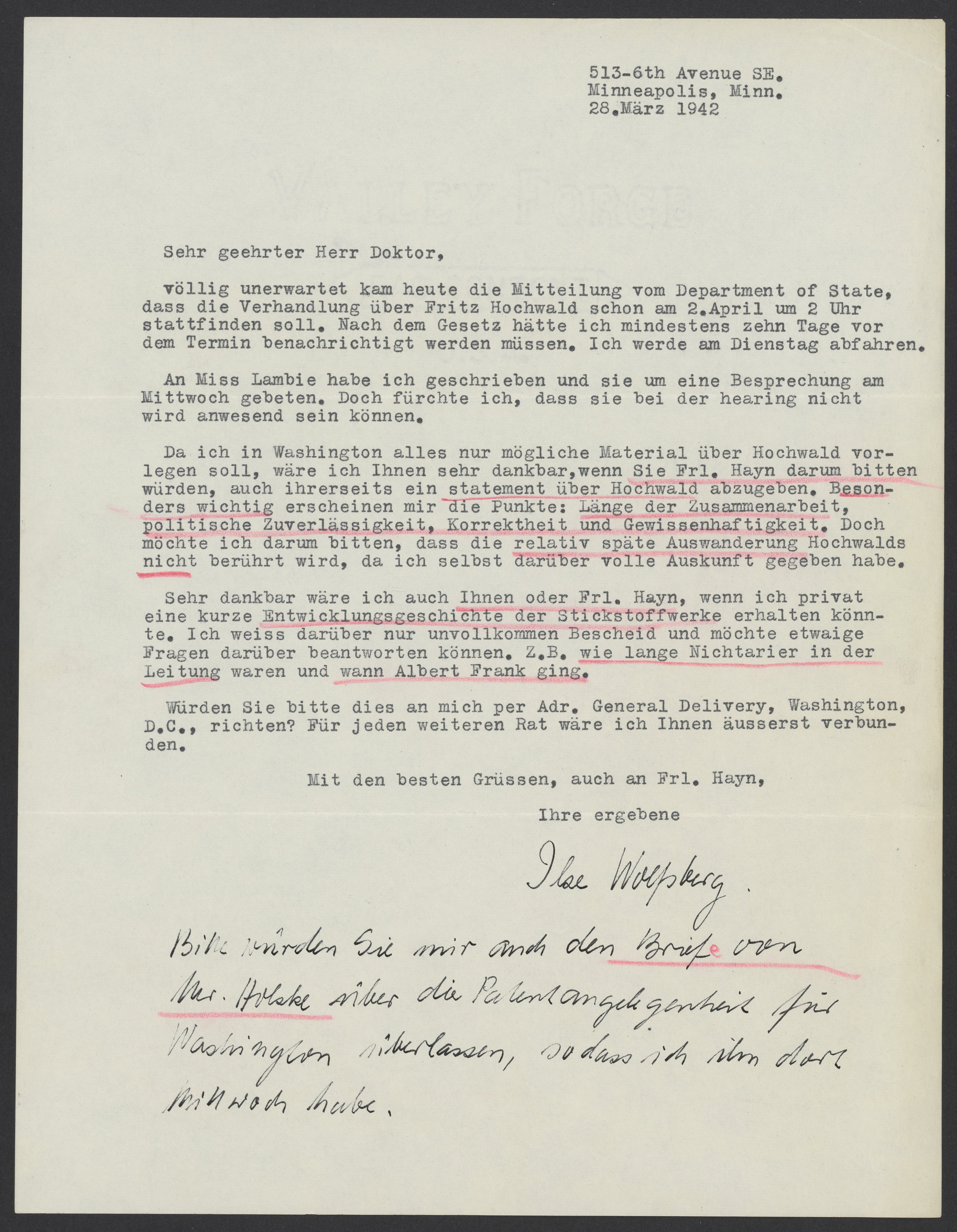 Small JPG1200 x 1545px — 279 KBLarge JPG2880 x 3708px — 1.4 MBFull-sized JPG5384 x 6931px — 4.4 MBOriginal fileTIFF — 5384 x 6931px — 107 MBIlse Wolfsberg tells Max Albert Bredig (1902-1977) that Fritz Hohwald (1897-1968) has a hearing on April 2, 1942, related to his immigration to the United States. Wolfsberg asks Bredig to provide a history of the Bavarian Nitrogen Works, where Bredig and Hochwald formerly worked.