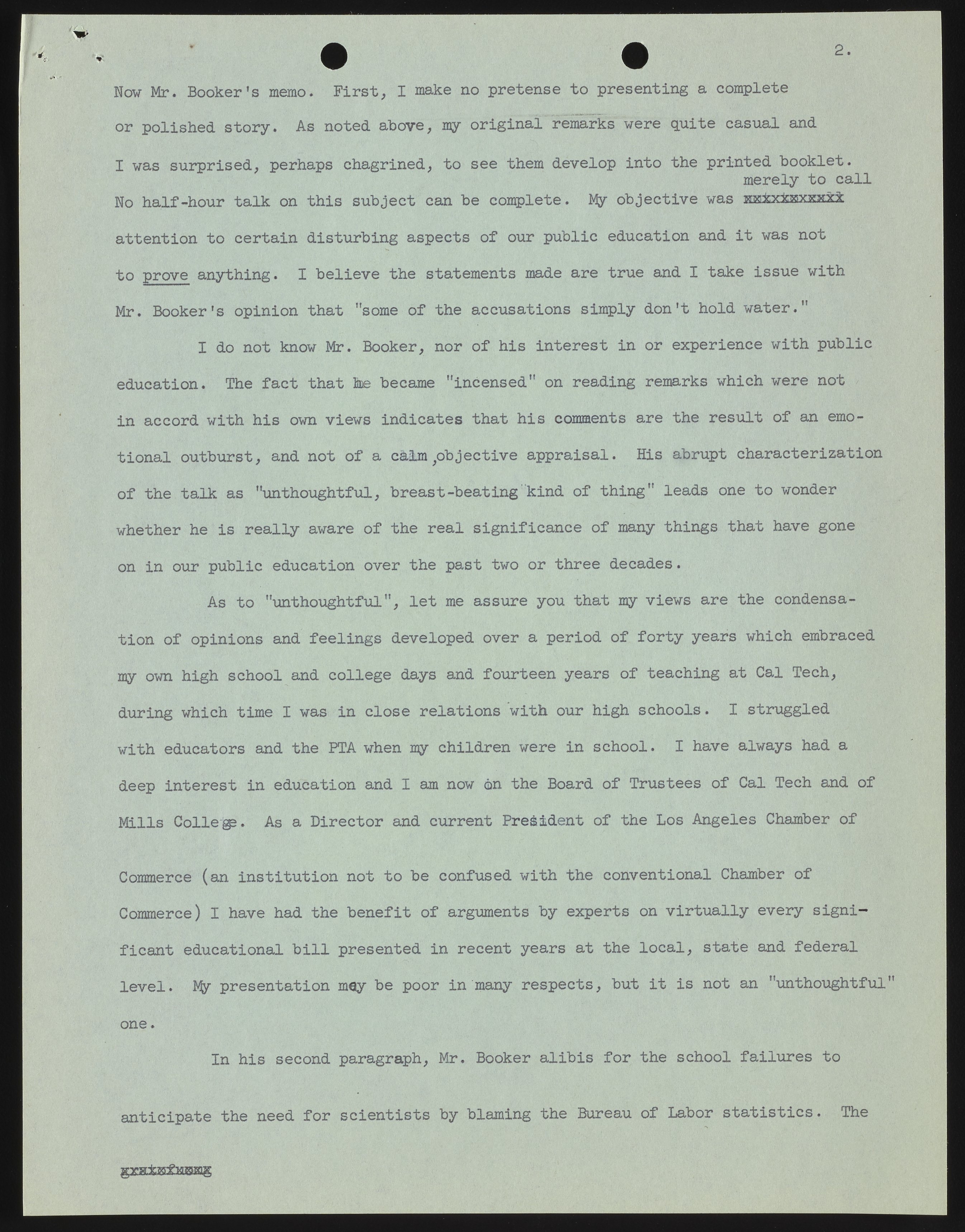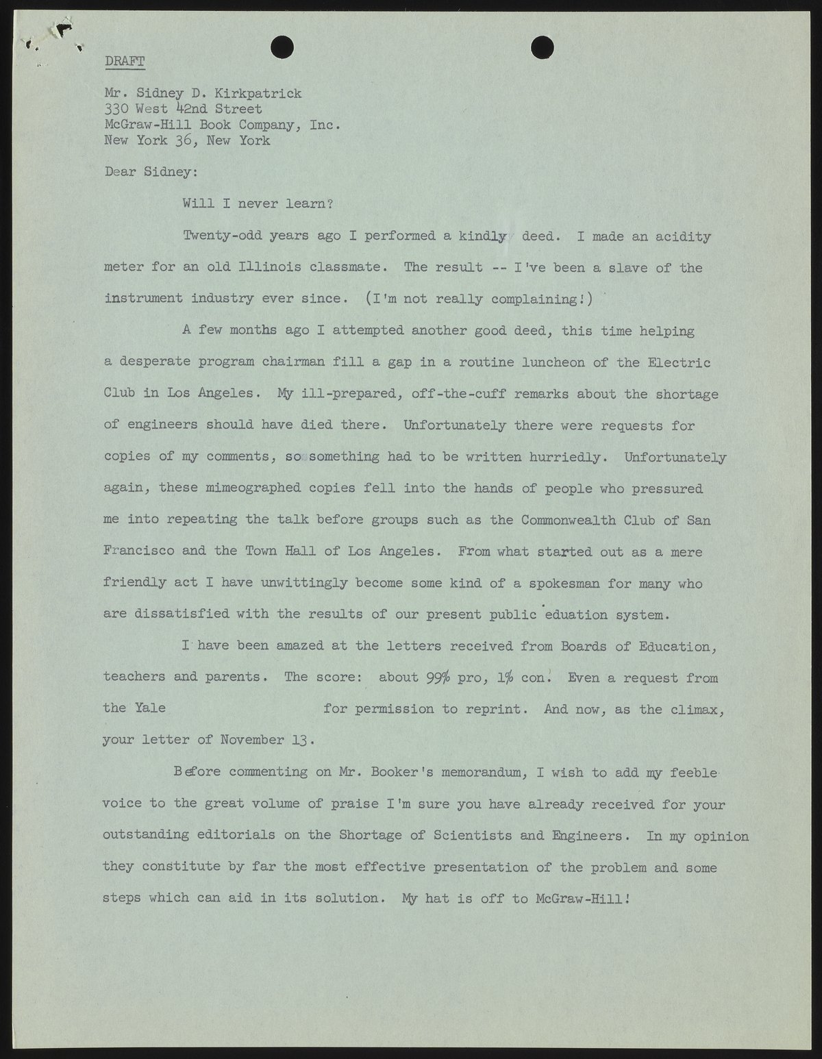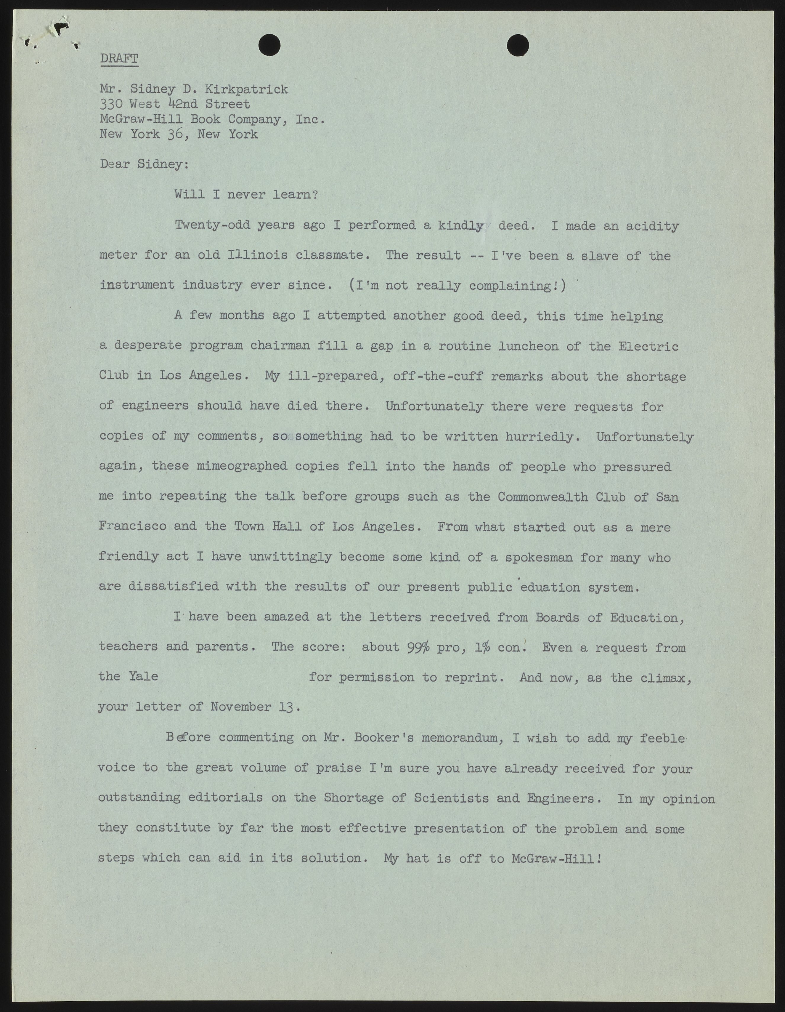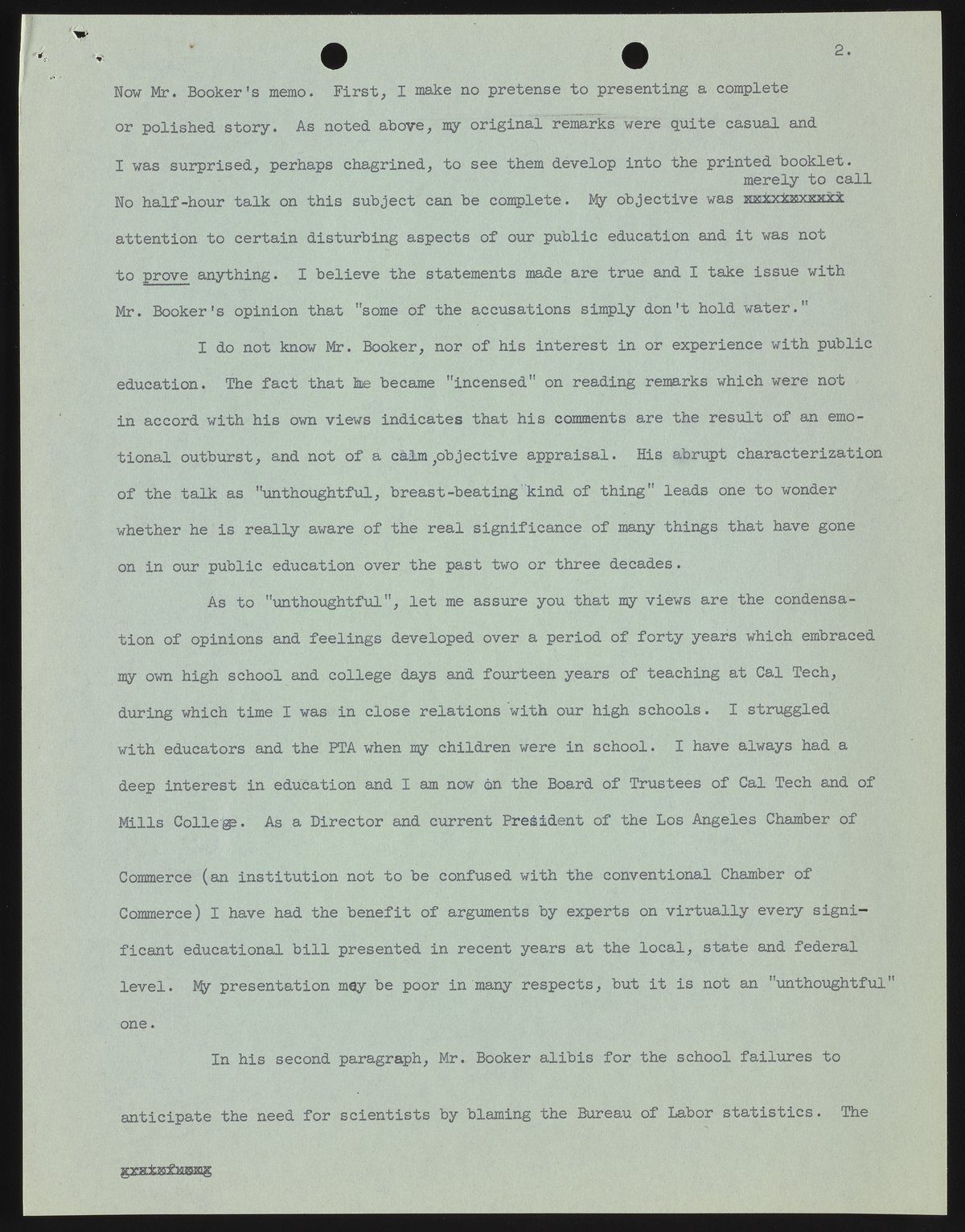 Small JPG1200 x 1546px — 270 KBFull-sized JPG2651 x 3416px — 1.2 MBOriginal fileTIFF — 2651 x 3416px — 26.0 MBIn this draft, Arnold Beckman describes the chain of events that lead up to his speech on the subject of public education and states that the vast majority of feedback received has been positive. He then addresses the criticism offered in a memorandum written by a Mr. Booker.