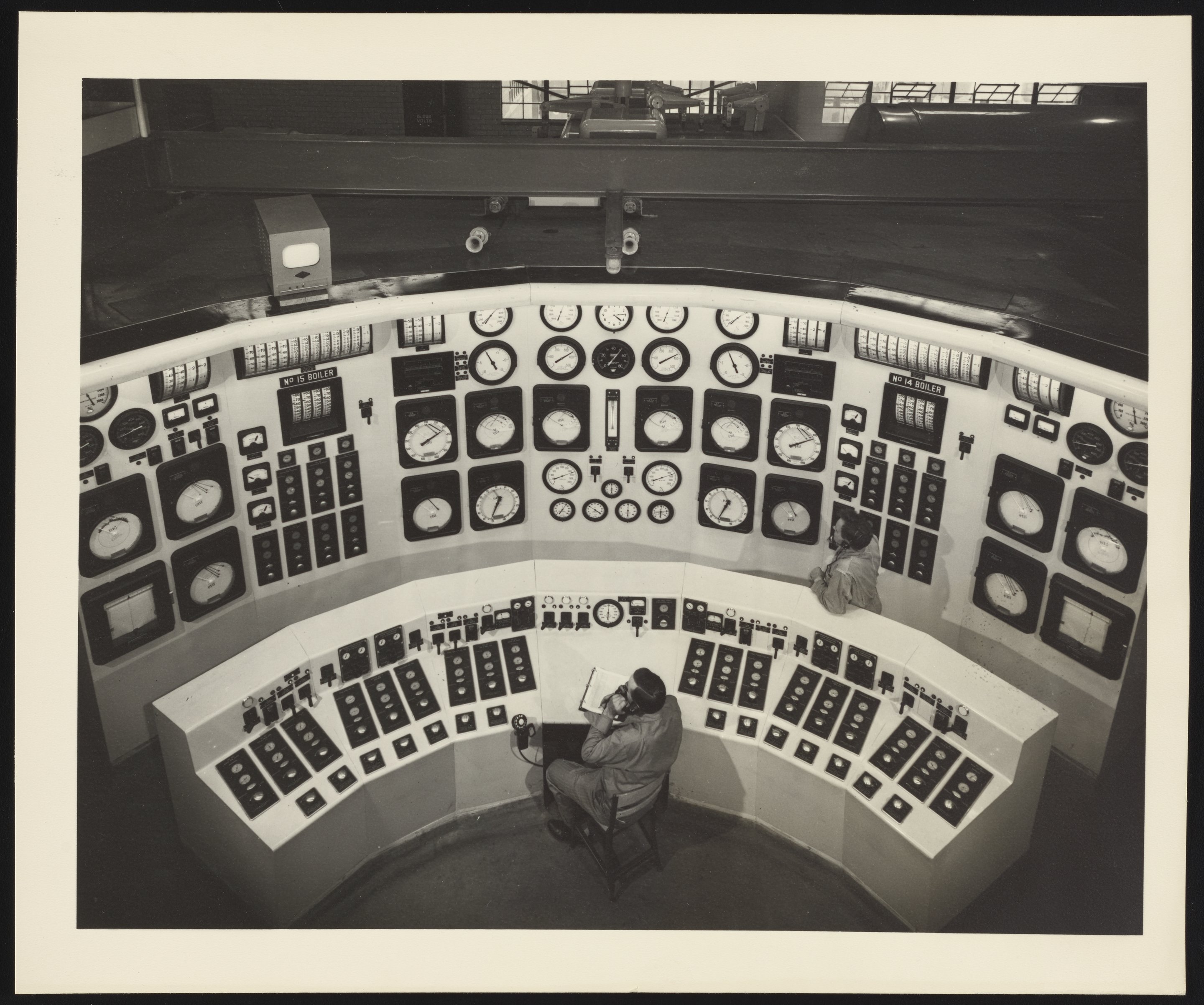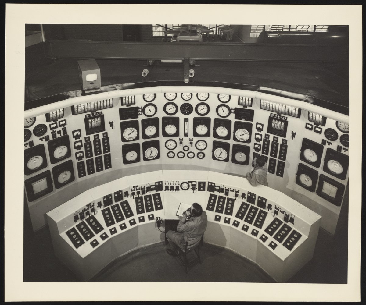 Interior view of a section of the South Side Power House at a Dow Chemical Company plant in Midland, Michigan, showing a control panel and two unidentified employees.