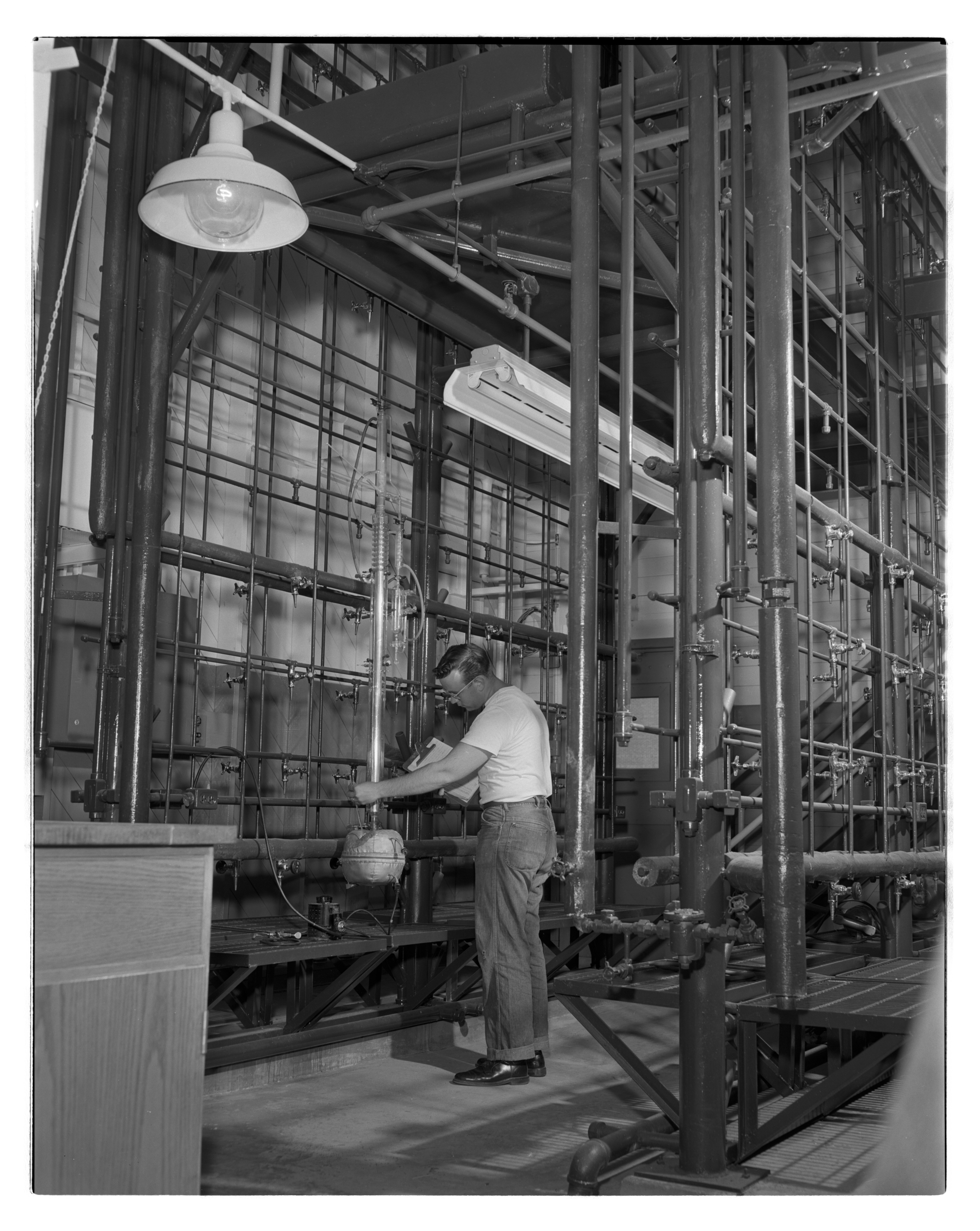 General view of Richard Bayne testing distillation and miniplant operations at the Dow Chemical Company's Plastics Production Laboratory. Established in 1953 as an outgrowth of Dow's Physical Research Laboratory, the Plastics Production Laboratory was devoted to improving plastic processes and products. The facility boasted laboratory areas dedicated to research in physical chemistry, catalytic and high temperature reactions, physical development, small scale polymers and co-polymers, high polymer studies, purification methods, and instrumentation, as well a semi-plant area.