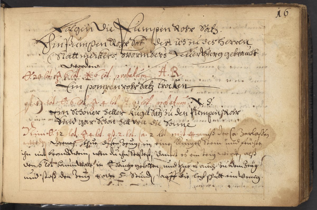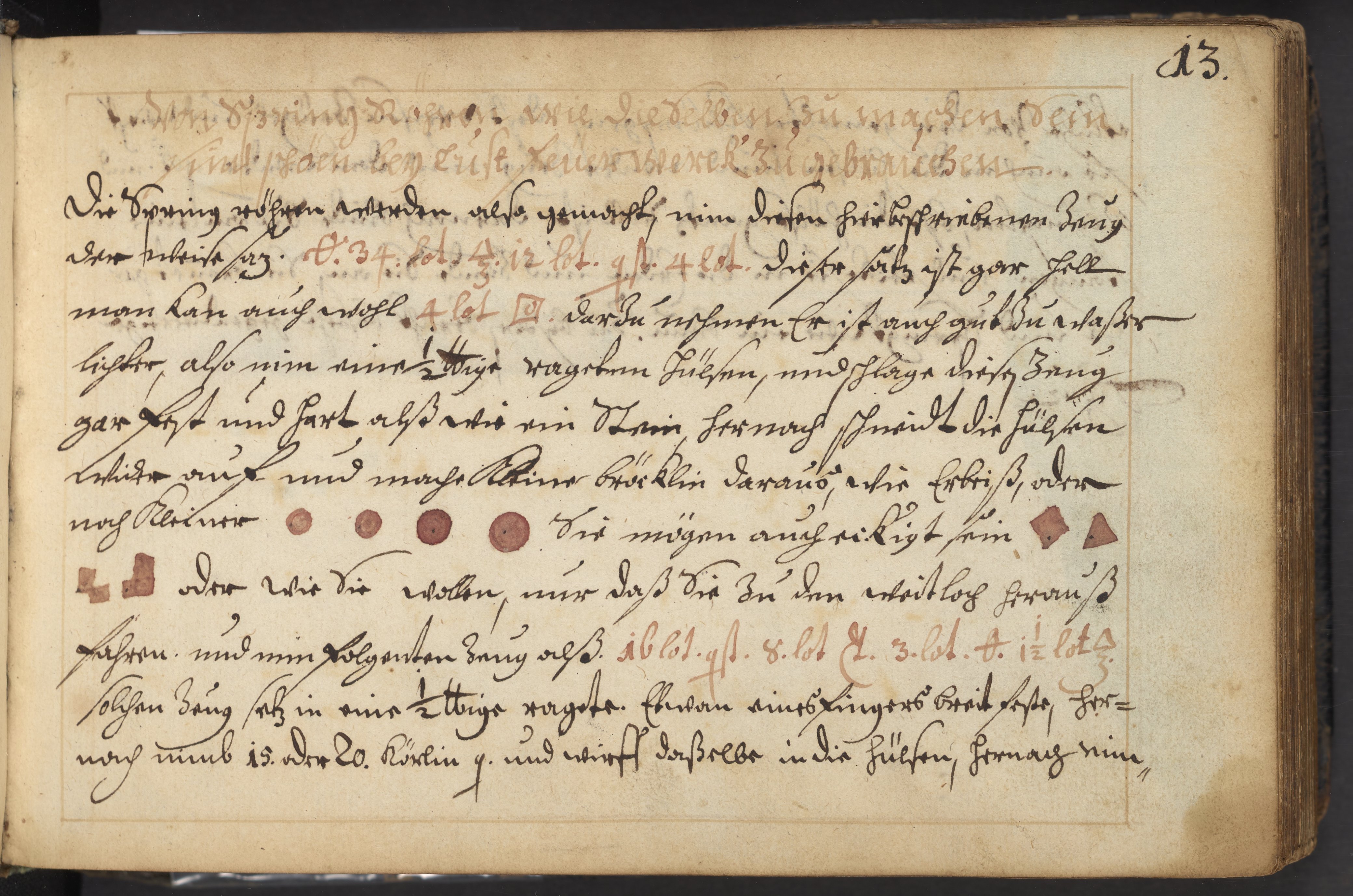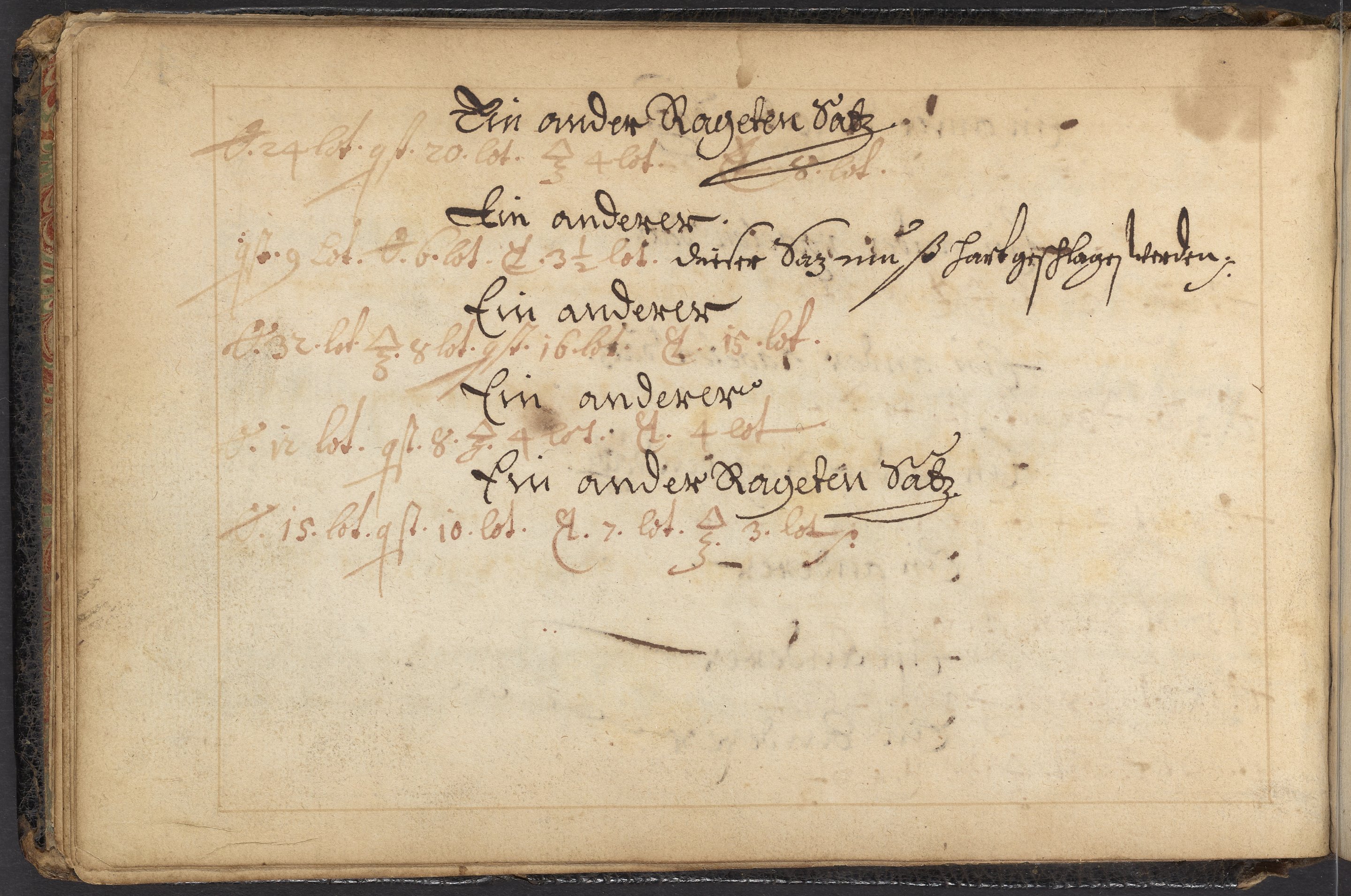 Small JPG1200 x 819px — 251 KBLarge JPG2880 x 1966px — 1.3 MBFull-sized JPG4200 x 2867px — 2.5 MBOriginal fileTIFF — 4200 x 2867px — 34.5 MBA manuscript work from Andreas Räbel, a 17th-century pyrotechnician, containing formulas and recipes for the creation of fireworks, explosives, rockets, detonators, flares, bombs, and other armament. The recipes call for ingredients ranging from metallic and metalloid elements such as antimony, tin, and mercury, to naturally occurring minerals and substances such as orpiment, chalk, coal, tree oil, and resin. The work is handwritten in German, cursive script, and includes colored ink drawings labeled with reference numbers and letters. The work also contains Räbel's description of the wedding of Emperor Leopold von Habsburg (1640-1705) to Margarita Teresa of Spain (1651-1673) on December 12, 1666. Work is digitized in its entirety.