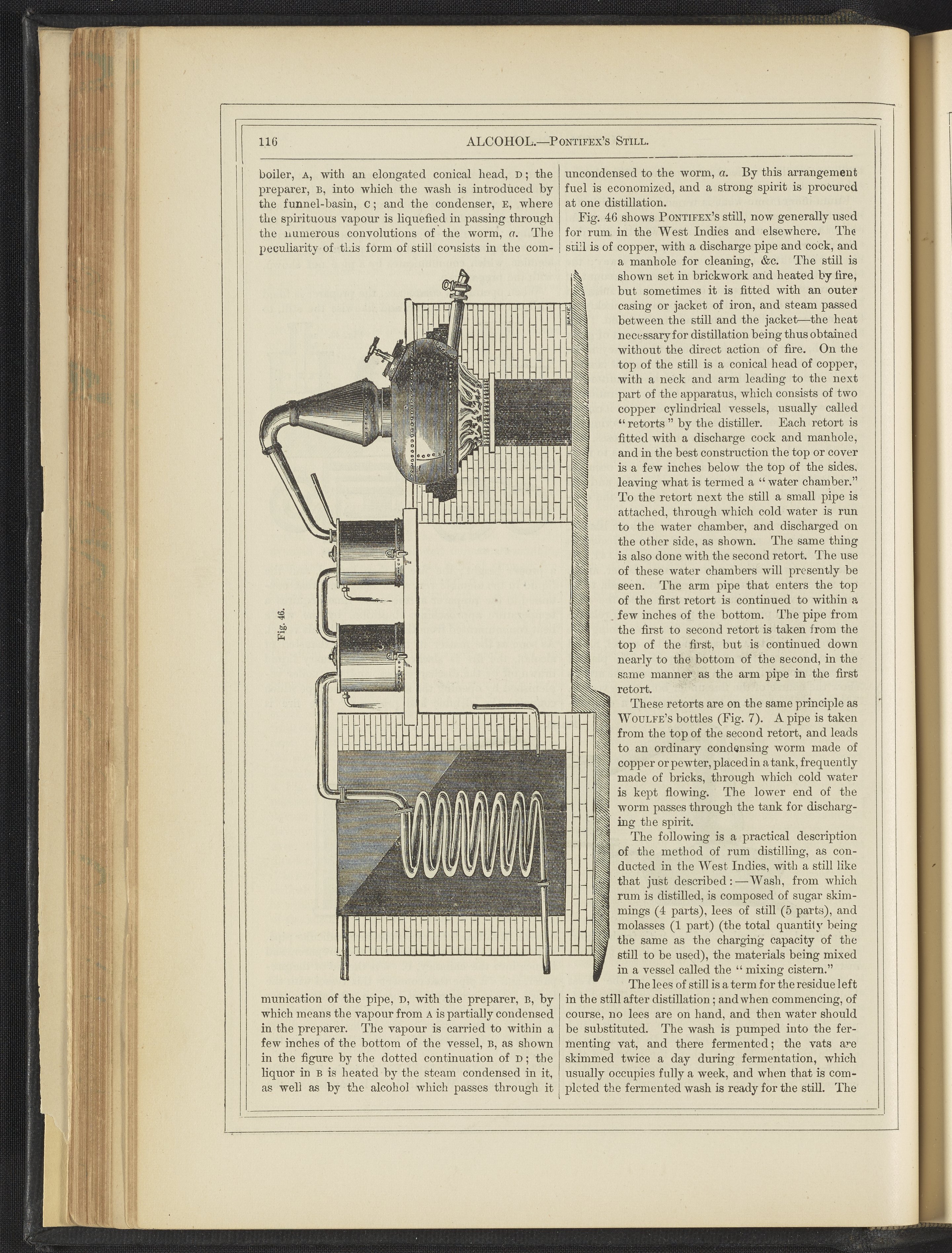 “Pontifex's Still for the Distillation of Alcohol.” In Encyclopædia of Chemistry, Theoretical, Practical, and Analytical, as Applied to the Arts and Manufacturers, Vol. I and II. Philadelphia, Pennsylvania: J.B. Lippincott & Co., 1877. https://digital.sciencehistory.org/works/qf85nb36v.