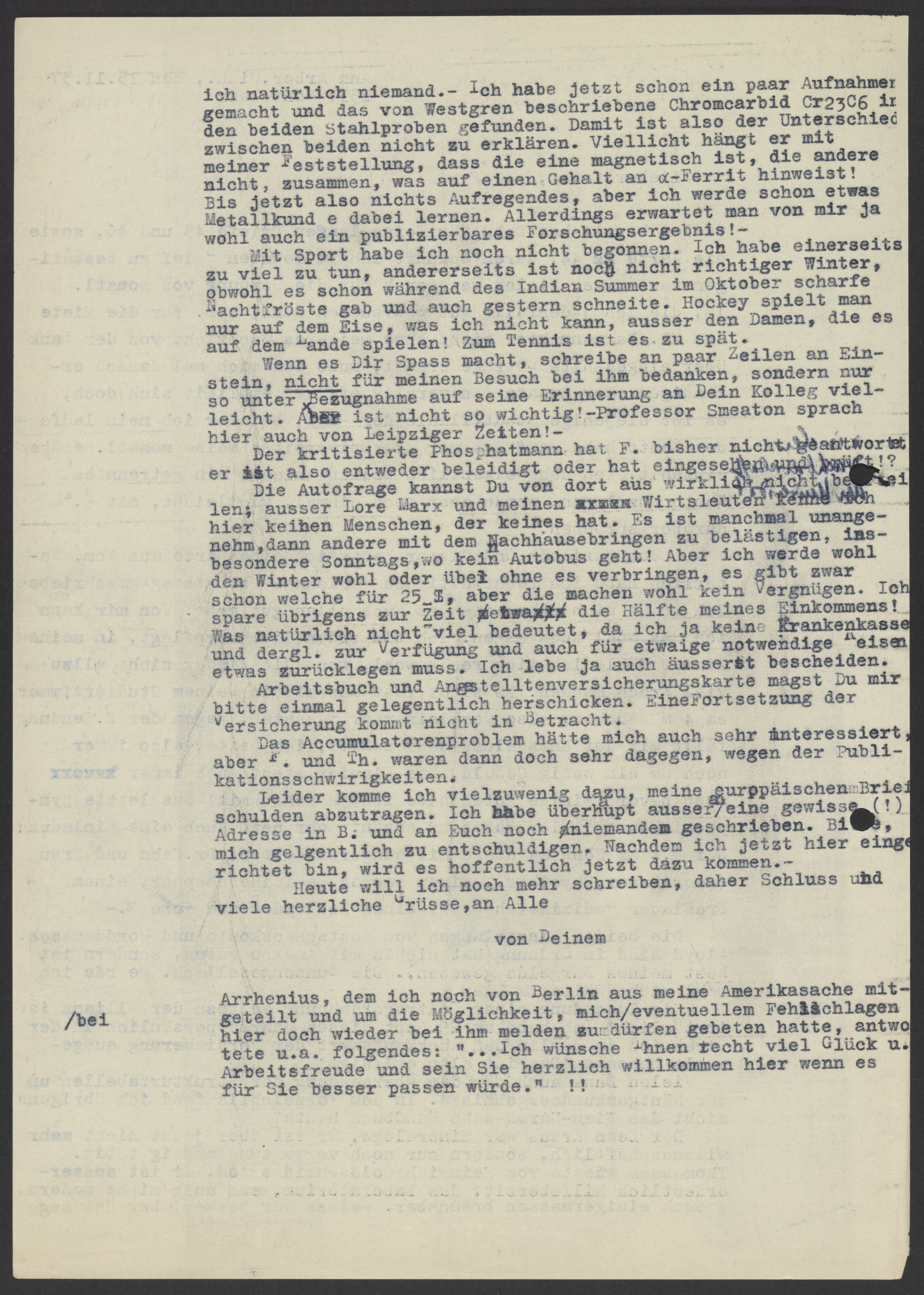 Arrhenius, dem ich noch von Berlin aus meine Amerikasache mitgeteilt und um die Möglichkeit, mich bei eventuellem Fehlschlagen hier doch wieder bei ihm melden zu dürfen gebeten hatte, antwortete u.a. folgendes: “... Ich wünsche Ihnen recht viel Glück u. Arbeitsfreude und sein Sie herzlich willkommen hier wenn es für Sie besser passen würde.”