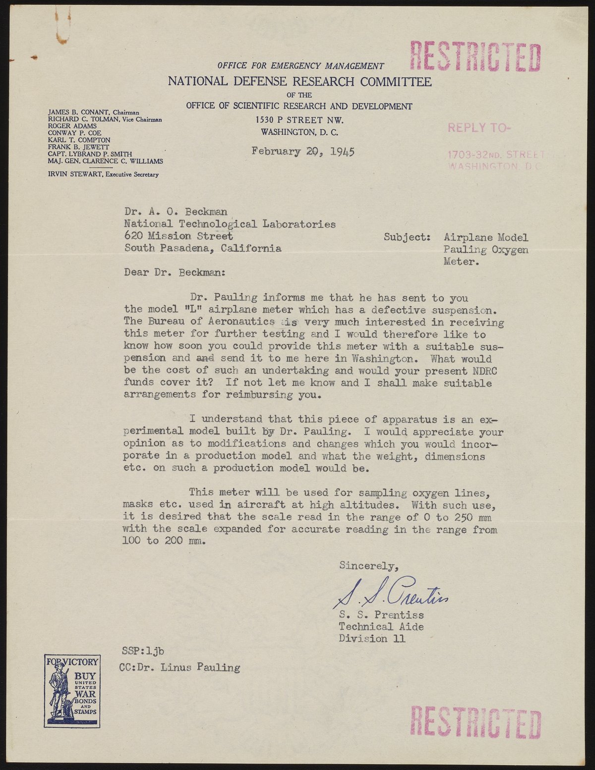 Prentiss, Spencer S. “Letter from S. S. Prentiss to Arnold O. Beckman,” February 20, 1945. Beckman Historical Collection, Box 19, Folder 9. Science History Institute. Philadelphia. https://digital.sciencehistory.org/works/qj72p717w.