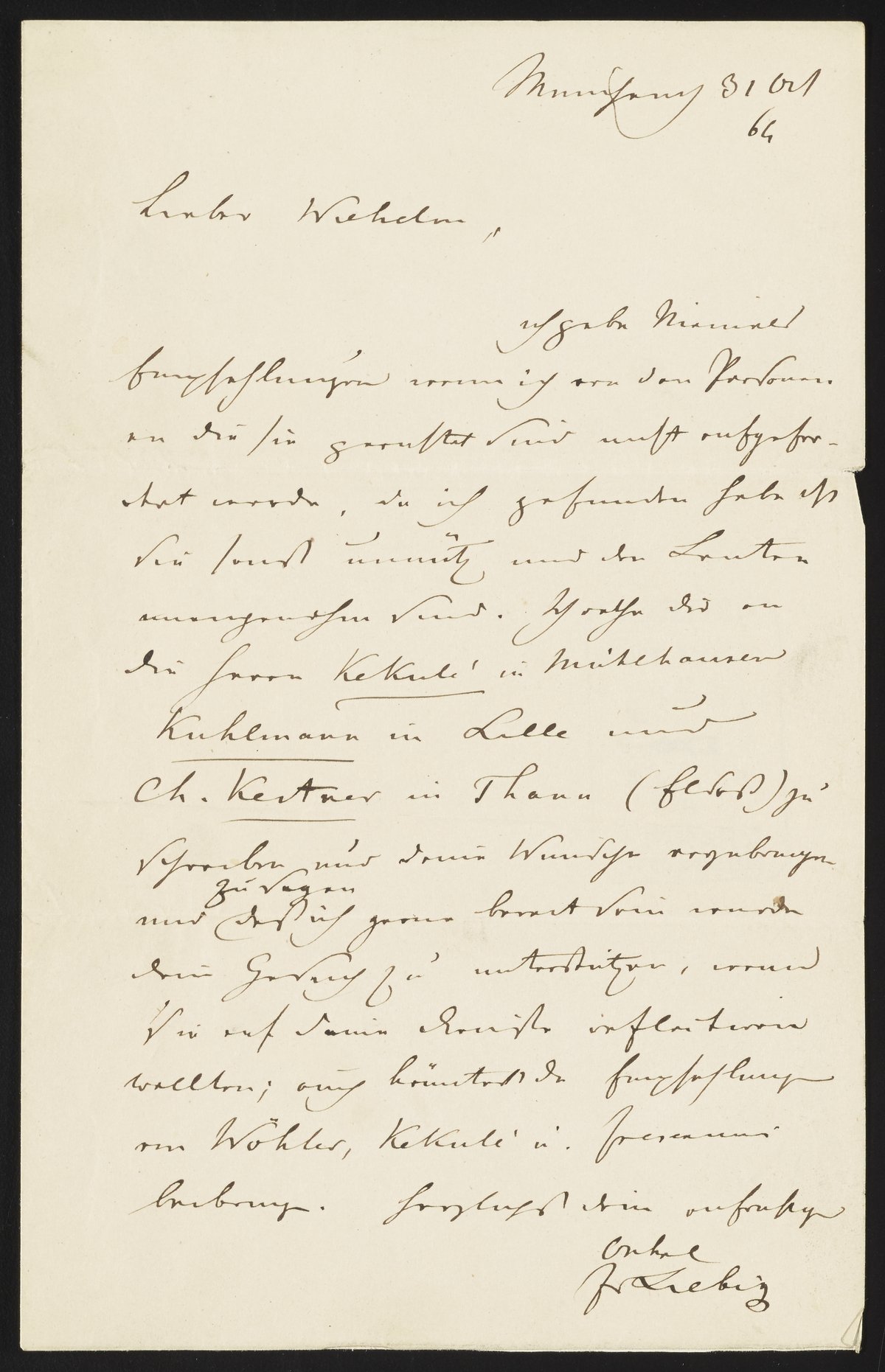 Contains advice to his nephew on requesting recommendations. Text specifically mentions Friedrich Wohler and August Kekule.