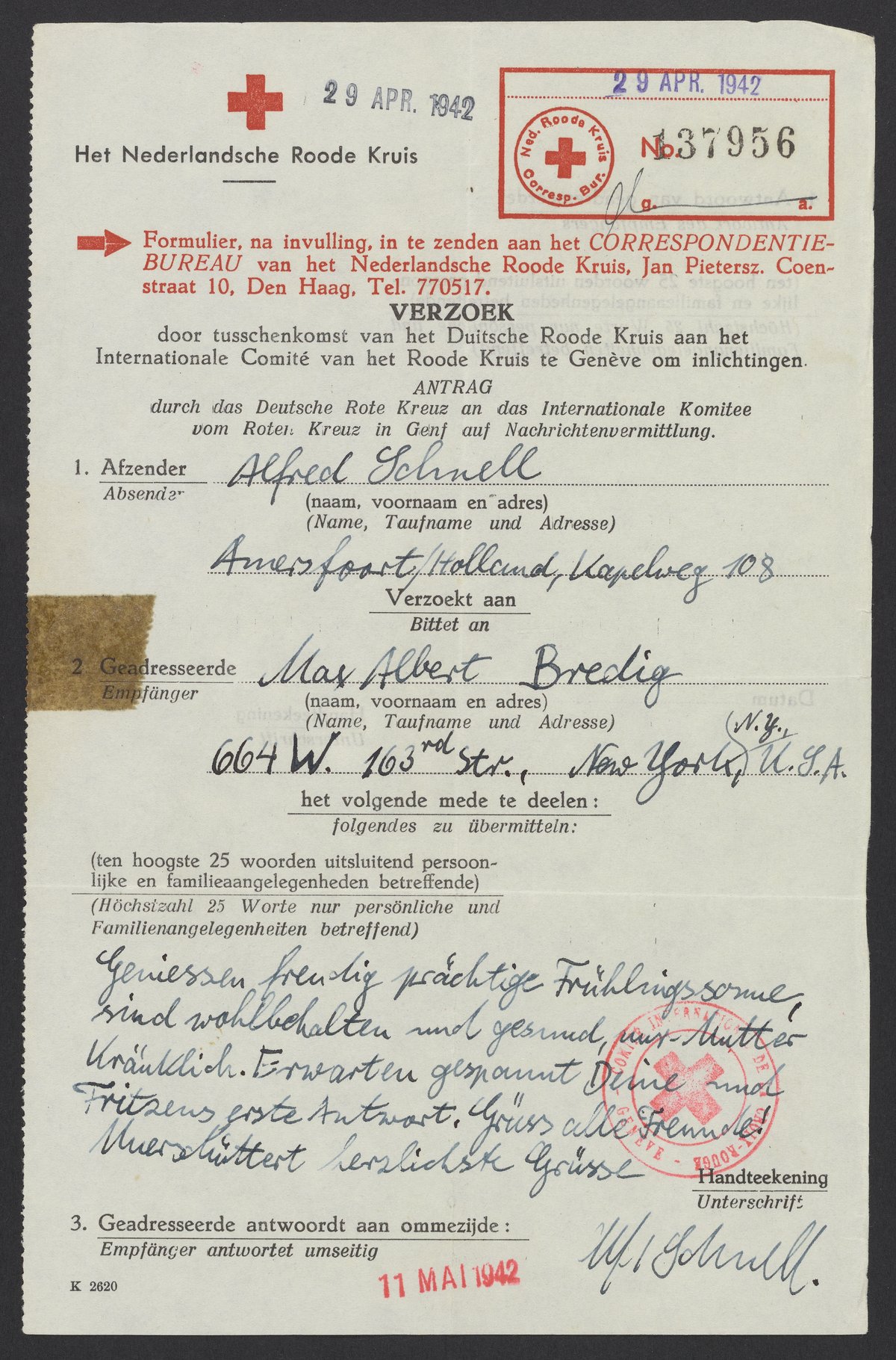 Message from Alfred Schnell to Max Bredig, April 29, 1942