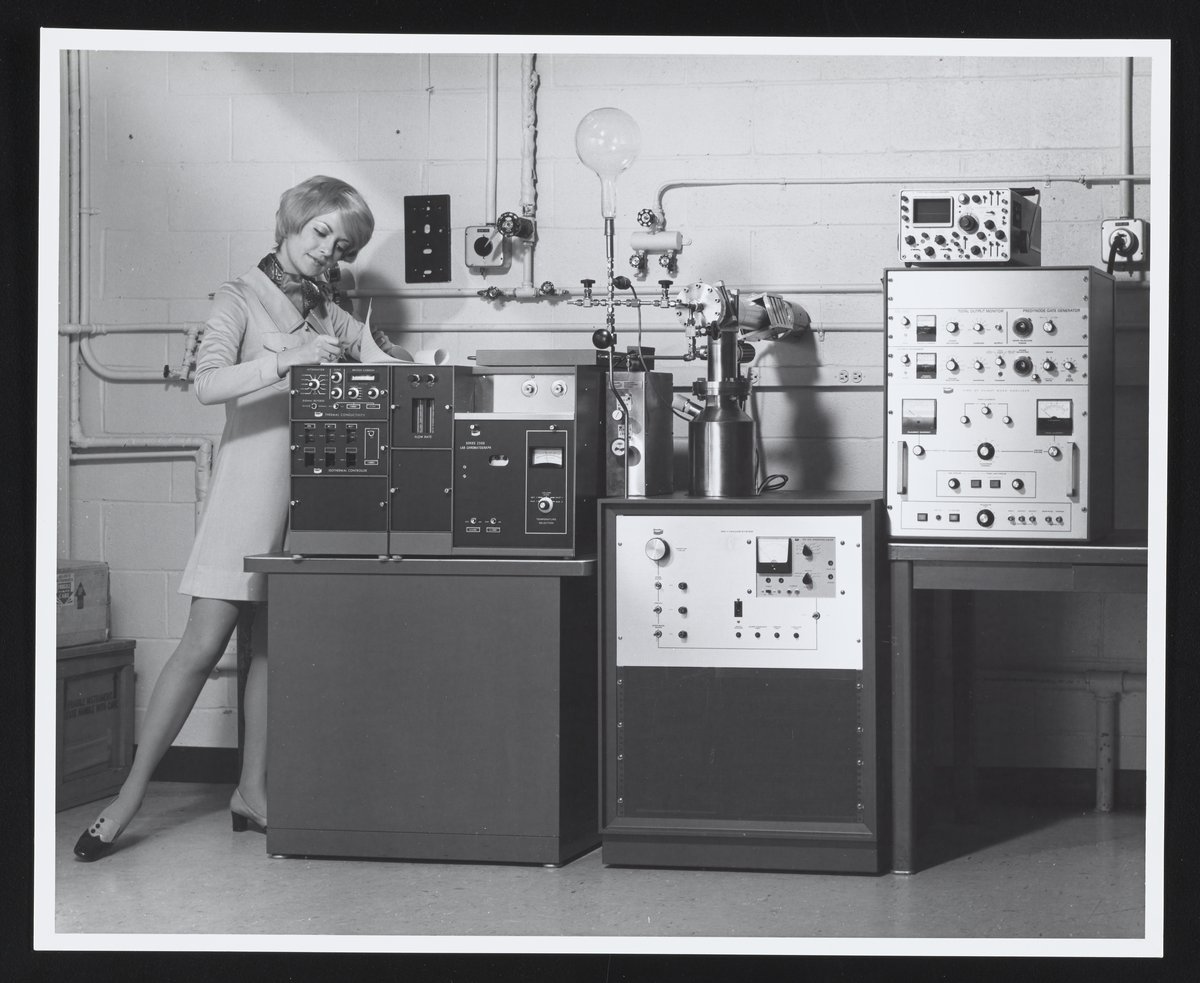 Small JPG1200 x 983px — 161 KBLarge JPG2880 x 2360px — 711 KBFull-sized JPG4378 x 3588px — 1.4 MBOriginal fileTIFF — 4378 x 3588px — 45.0 MBSeries of photographs depicting the Bendix MA-3 Gas Chromatograph system with a female model. Component parts visible in the photographs include a total output monitor, predynode gate generator, MA-1 Vacuum System, and Time-of-Flight Mass Analyzer.