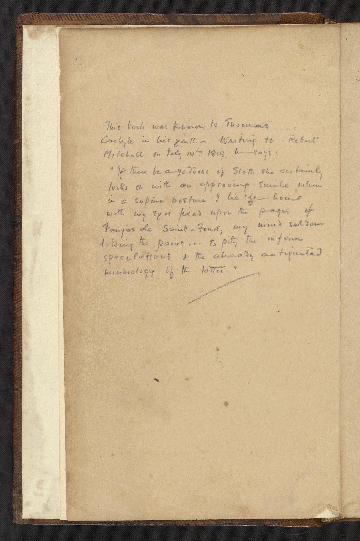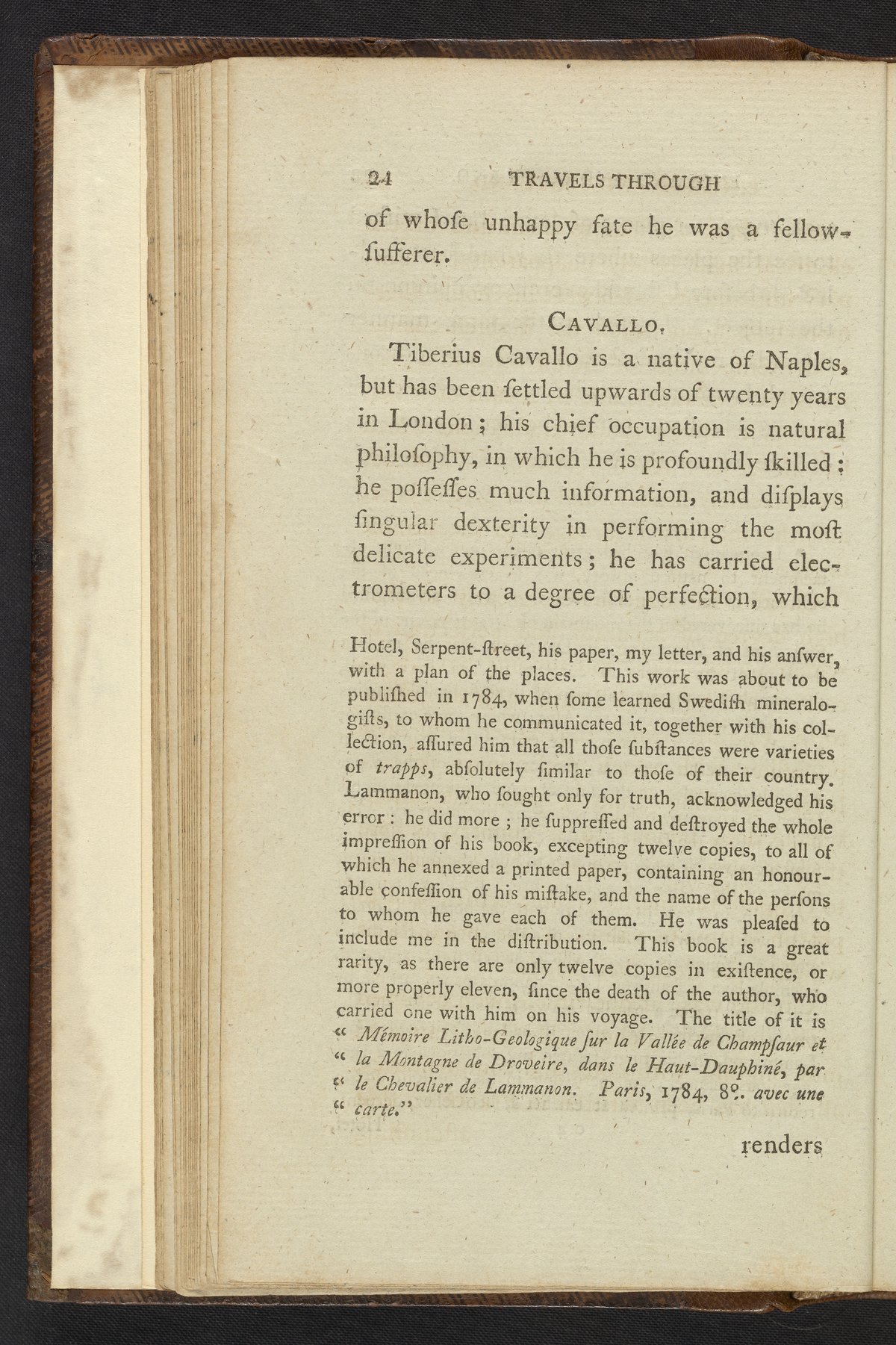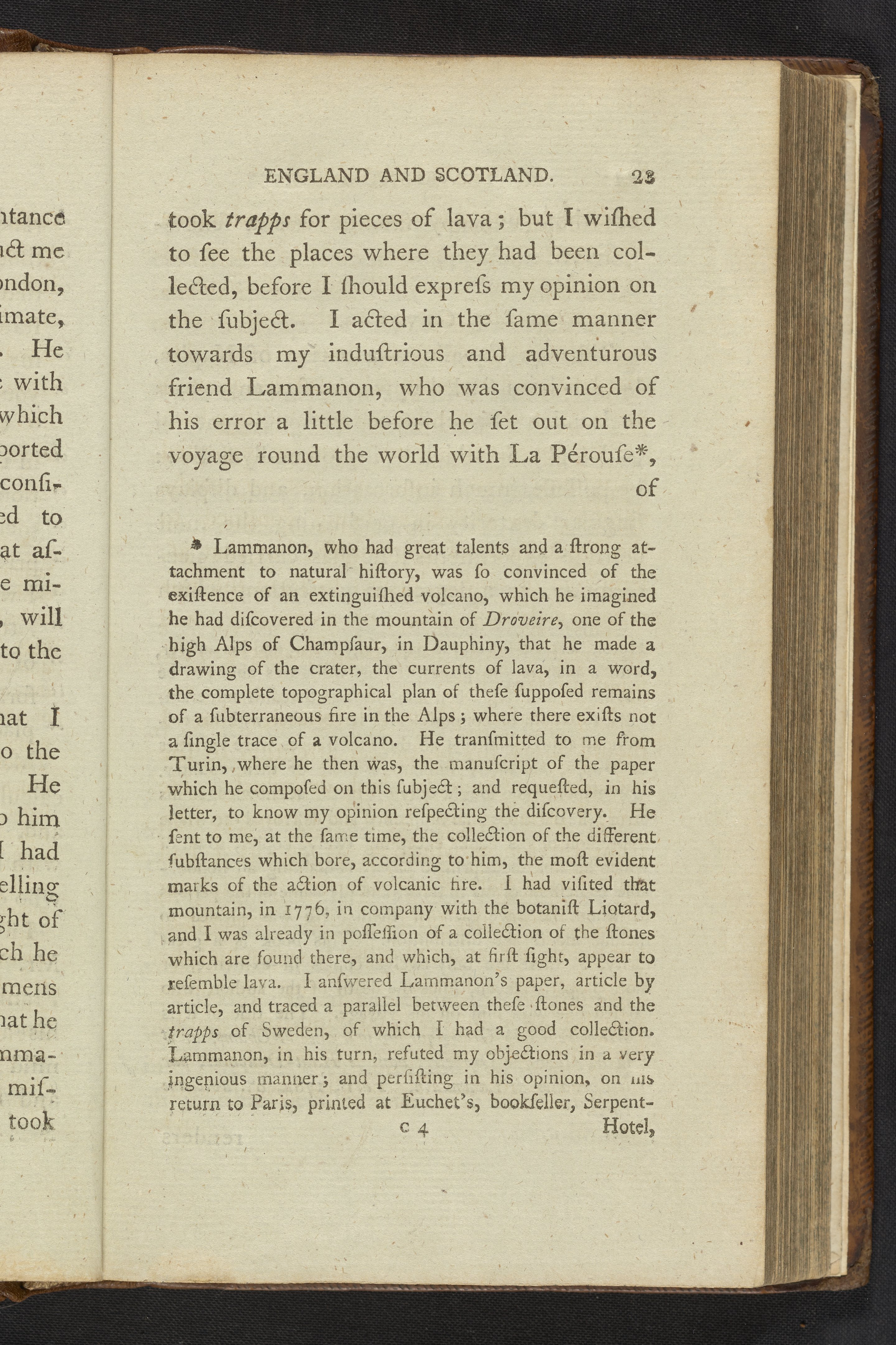 The entire volume has been digitized, along with both volumes of the first English translation, published in 1797. This book contains several plates illustrating different places de-St.-Fond visited and notable specimens or artifacts he saw. Selected pages and plates contain additional information relating to that page.