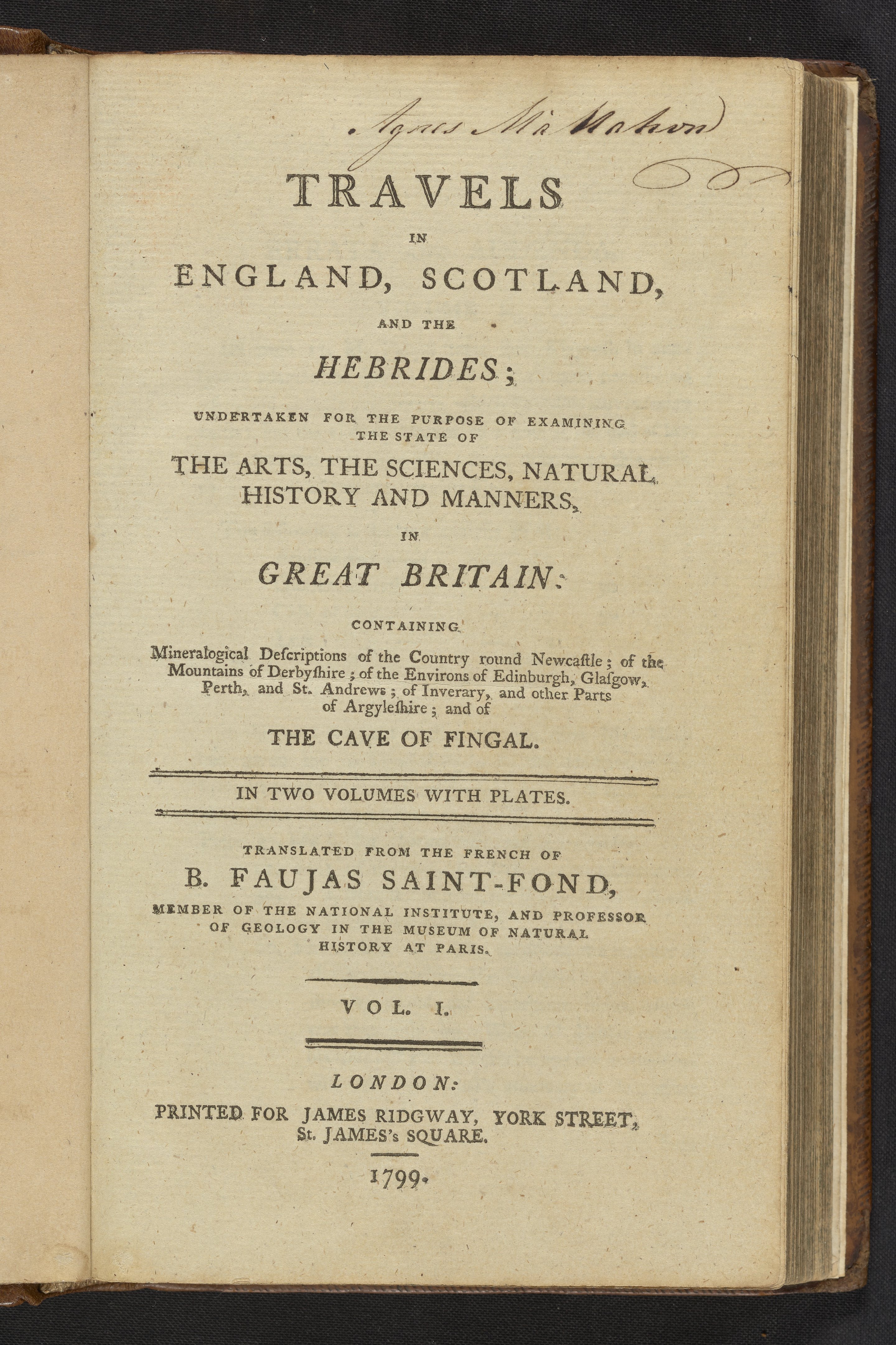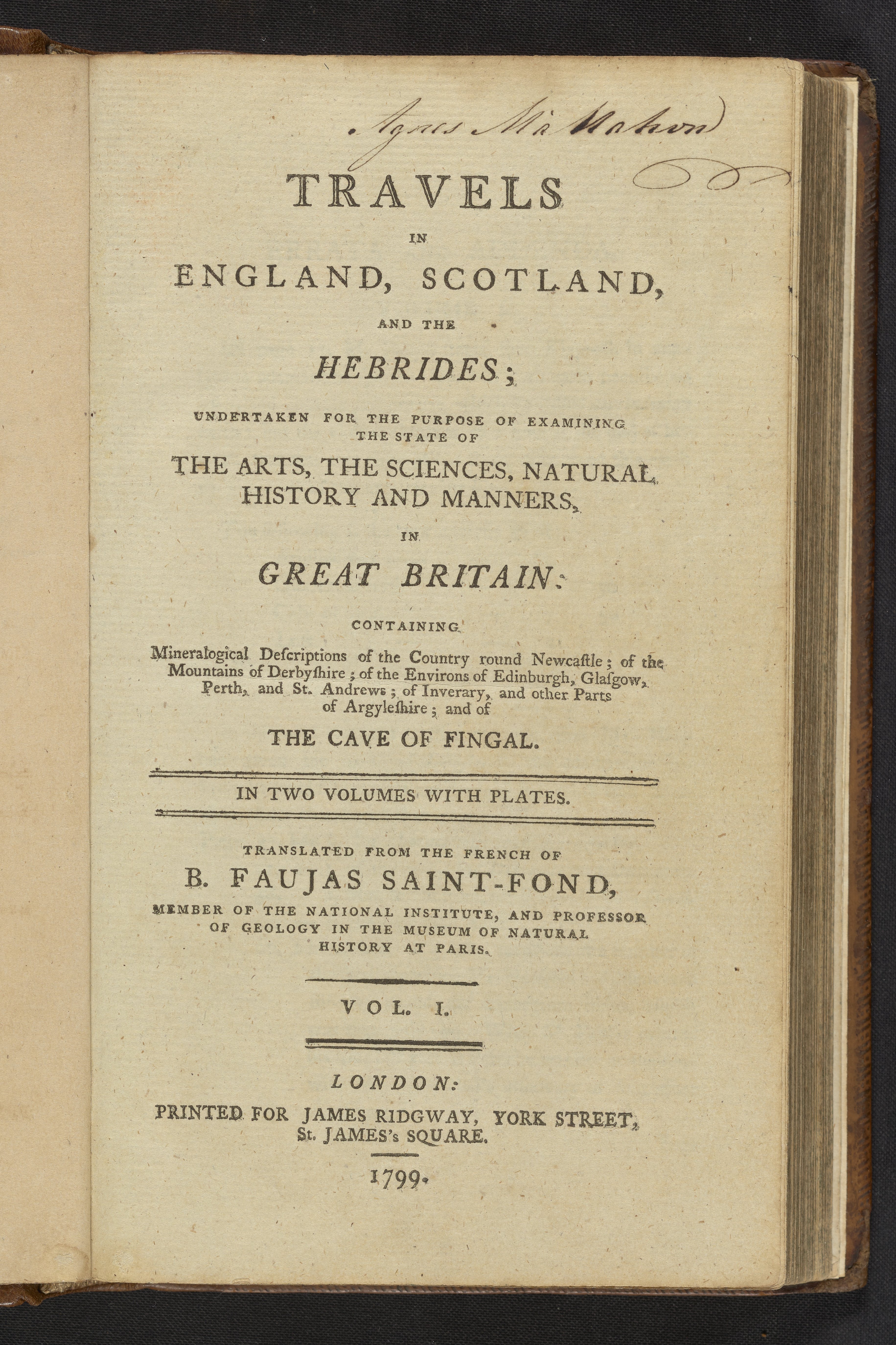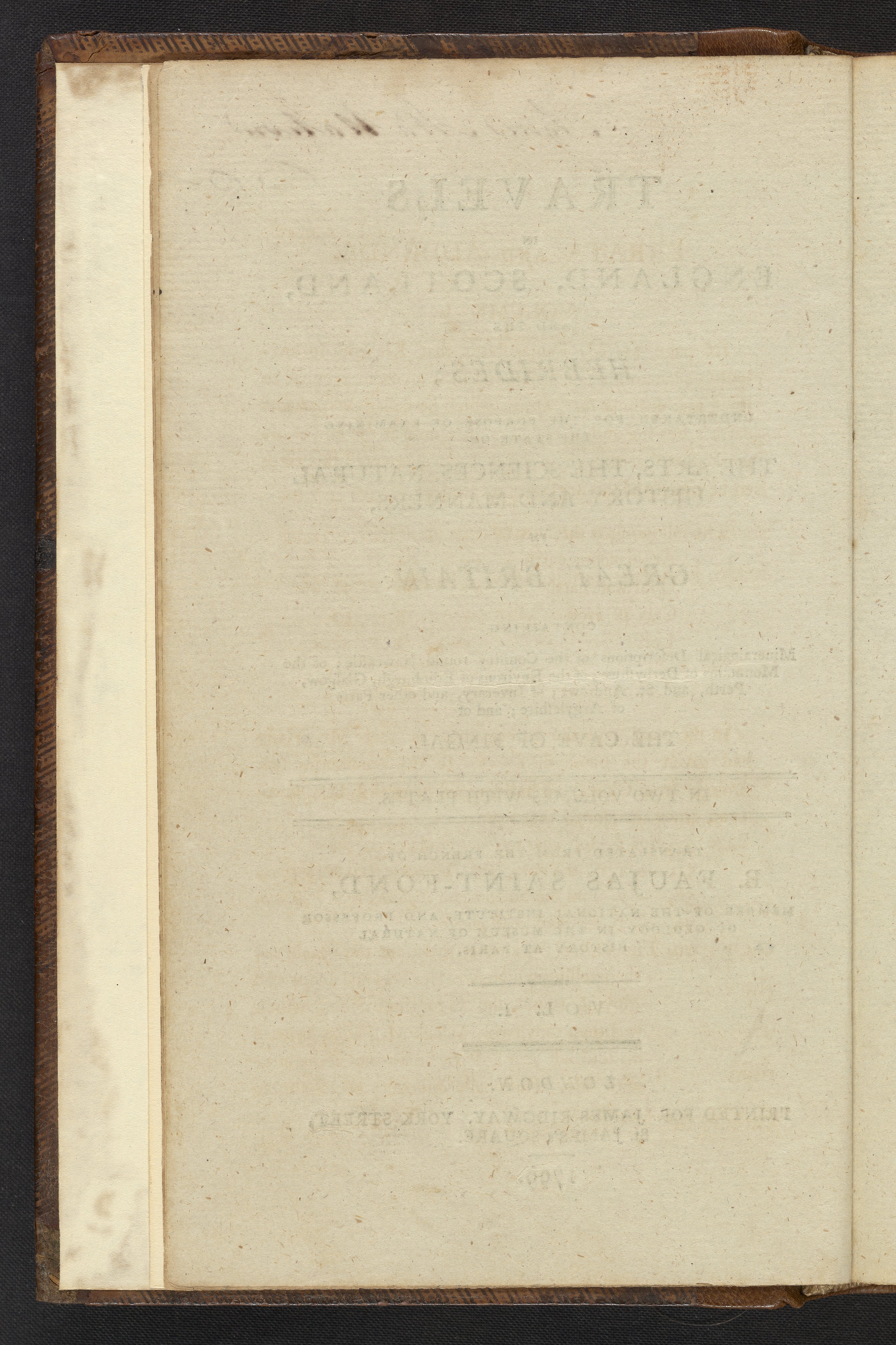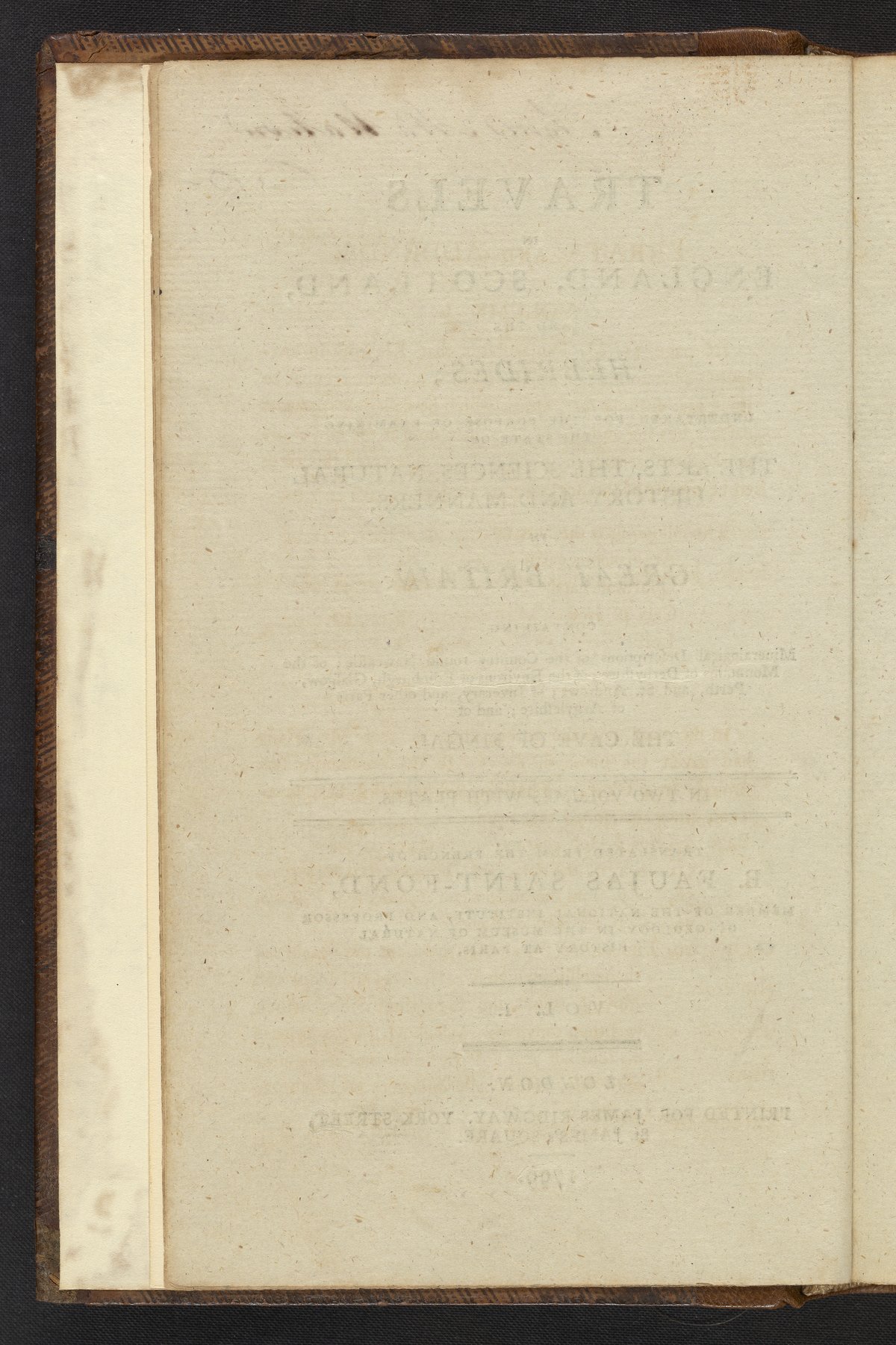 Small JPG1200 x 1801px — 416 KBLarge JPG2880 x 4322px — 2.4 MBFull-sized JPG3662 x 5495px — 3.7 MBOriginal fileTIFF — 3662 x 5495px — 57.6 MBThis book is volume 1 of 2 the first English translation of two books written by French geologist Faujas-de-St.-Fond (1741-1819), done in 1799, two years after the original French was published. In 1784 de-St.-Fond traveled throughout England, Scotland, and the Hebrides. While the original publication is written in French, de-St.-Fond did speak and understand English. A valuable skill during his travels, as he did not need the aid of a translator, which led to easy conversations with locals. Early naturalists considered these conversations vital to their research, as the local people were considered part of the environment. Locals lived in a sort of symbiosis with their environment, with their culture affecting the environment and their environment affecting their culture. These volumes contain important information on the application of sciences to English industries, as well as the geology of the British Isles. The most notable of the descriptions on the British Isles is that of the geology of the Western Isles of Scotland, which include a plate of Fingal's Cave at the Isle of Staffa.