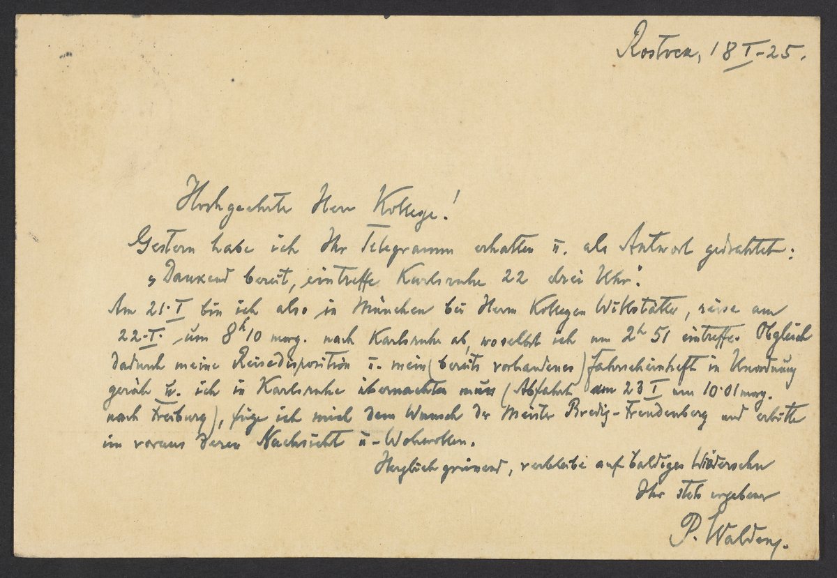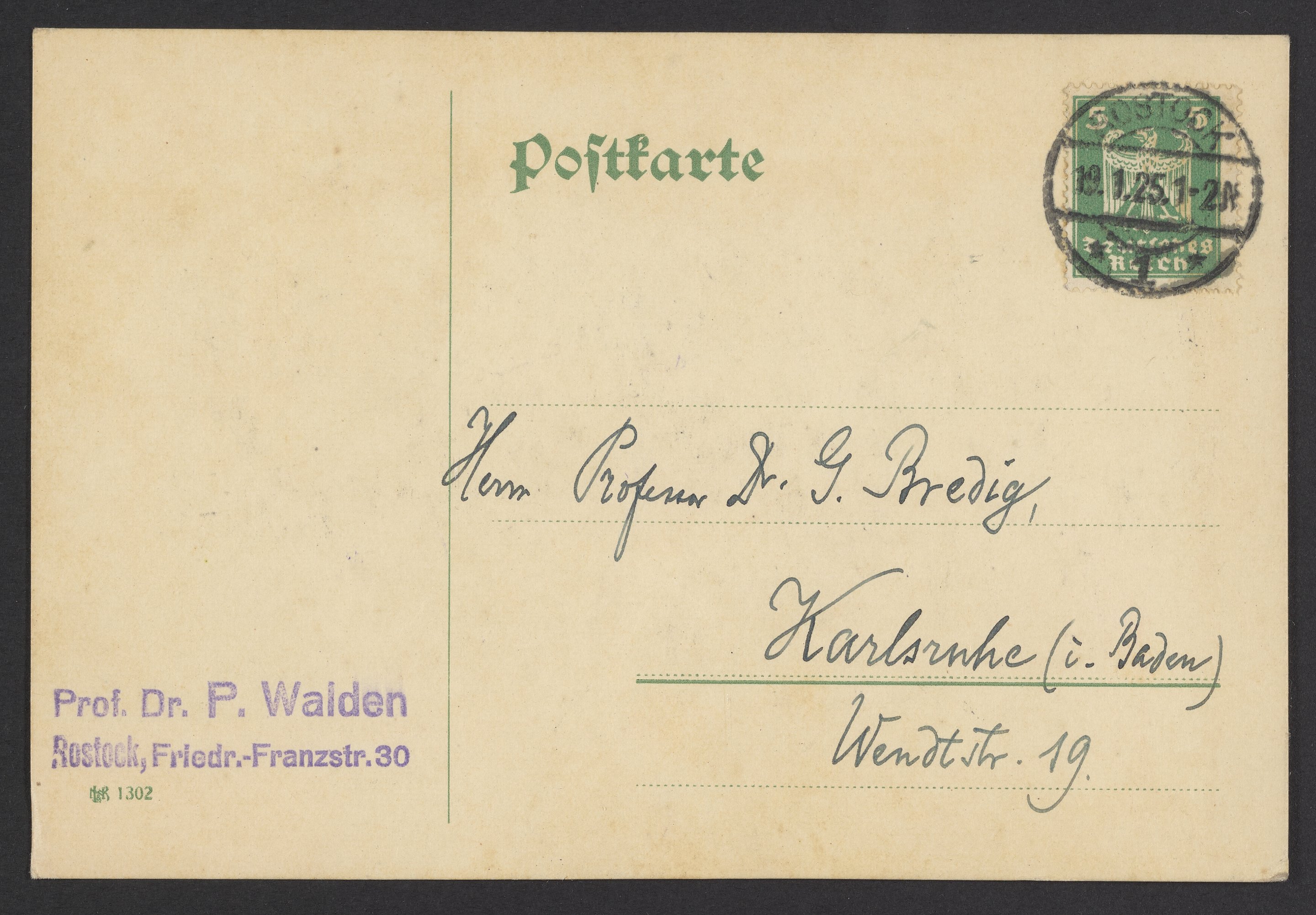 Postcard from Paul Walden to Georg Bredig