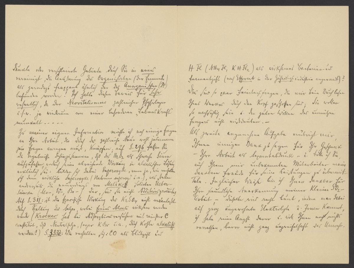Erst das Vergnügen, dann das Geschäftliche! Mit aufrichtiger Freude habe ich Ihre große Arbeit „über anorganische Fermente“ gelesen, richtiger gesagt: studiert, u. kann nicht umhin, Sie zu dem gewählten Arbeitsgebiet u. den geradezu frappierenden Ergebnissen von ganzem Herzen zu beglückwünschen. Ich weiß nicht, woran es liegt, aber Thatsache ist es, daß alle die originellen u. gründlichen Studien, die Sie machen, mich ständig ebenso erfreuen u. mich mit einem Stolz erfüllen, als ob ich sie selbst zu Tage gefördert hätte! Also, im Geiste drücke ich Ihnen voll Freude u. Genugthuung die Hand, – wiederum ist die „chinesische Mauer“, die trotz alledem das Wirken der organischen Natur von dem Schaffen des Chemikers trennt, auf einer wichtigen Bastion gesprengt worden, denn, falls unsere Rück- und Analogieschlüsse überhaupt etwas werth sind, sind zwei