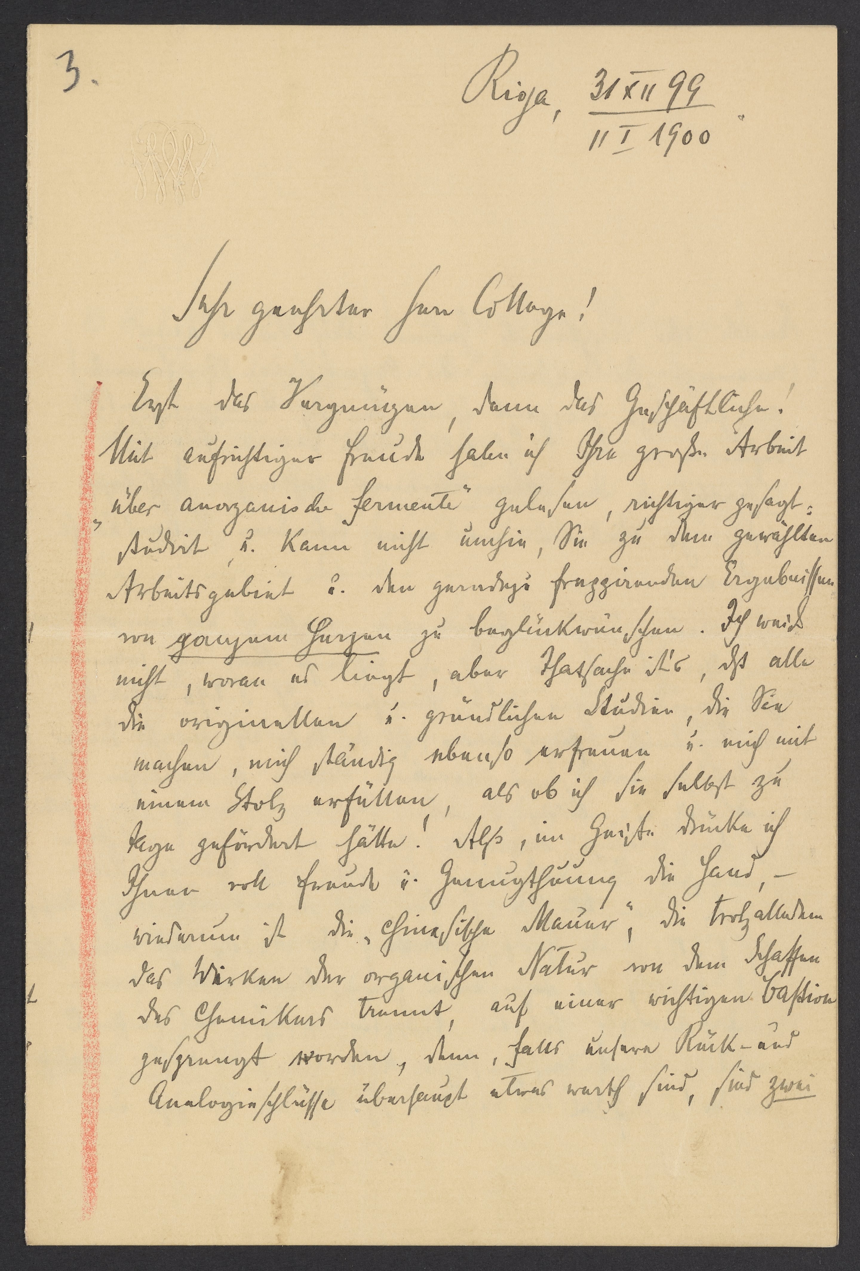 Small JPG1200 x 1773px — 322 KBLarge JPG2880 x 4256px — 1.6 MBFull-sized JPG3014 x 4454px — 1.7 MBOriginal fileTIFF — 3014 x 4454px — 38.5 MBPaul Walden (1863-1957), a German-Latvian chemist known for his work in stereochemistry, thanks Georg Bredig (1868-1944) for sending his treatise "Ueber anorganische Fermente" ("On Inorganic Ferments"). Walden compliments Bredig on the superiority and originality of his work, asks various questions about the research, and wishes Bredig all the best for the New Year.