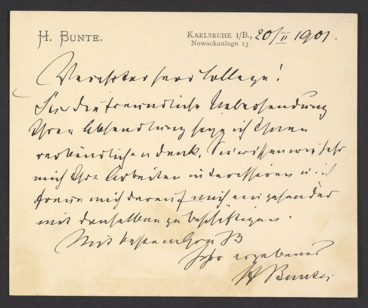 Bunte, Hans. “Letter from Hans Bunte to Georg Bredig, February 1901,” February 20, 1901. Papers of Georg and Max Bredig, Box 1, Folder 25. Science History Institute. Philadelphia. https://digital.sciencehistory.org/works/qq1bu4v.