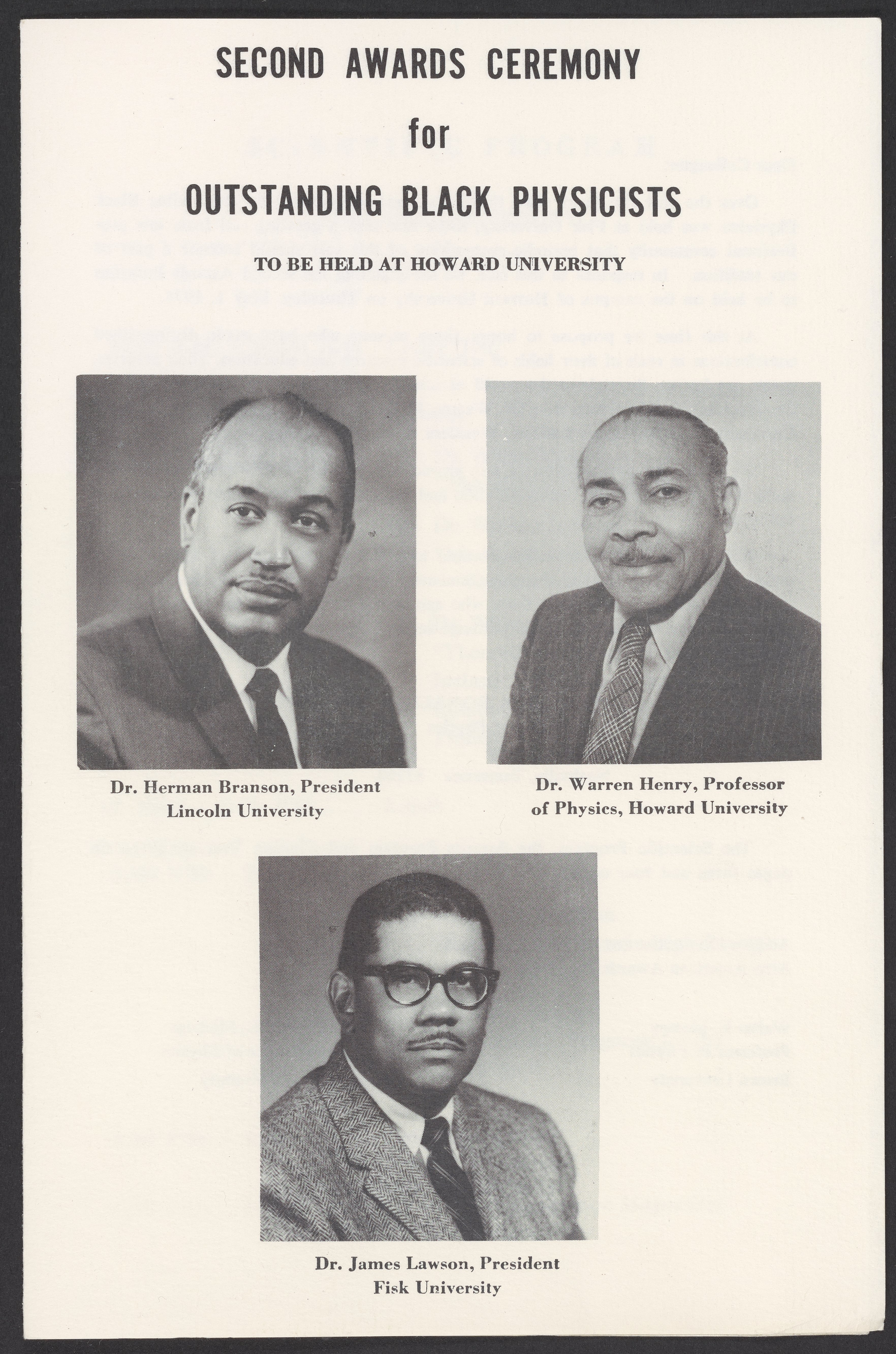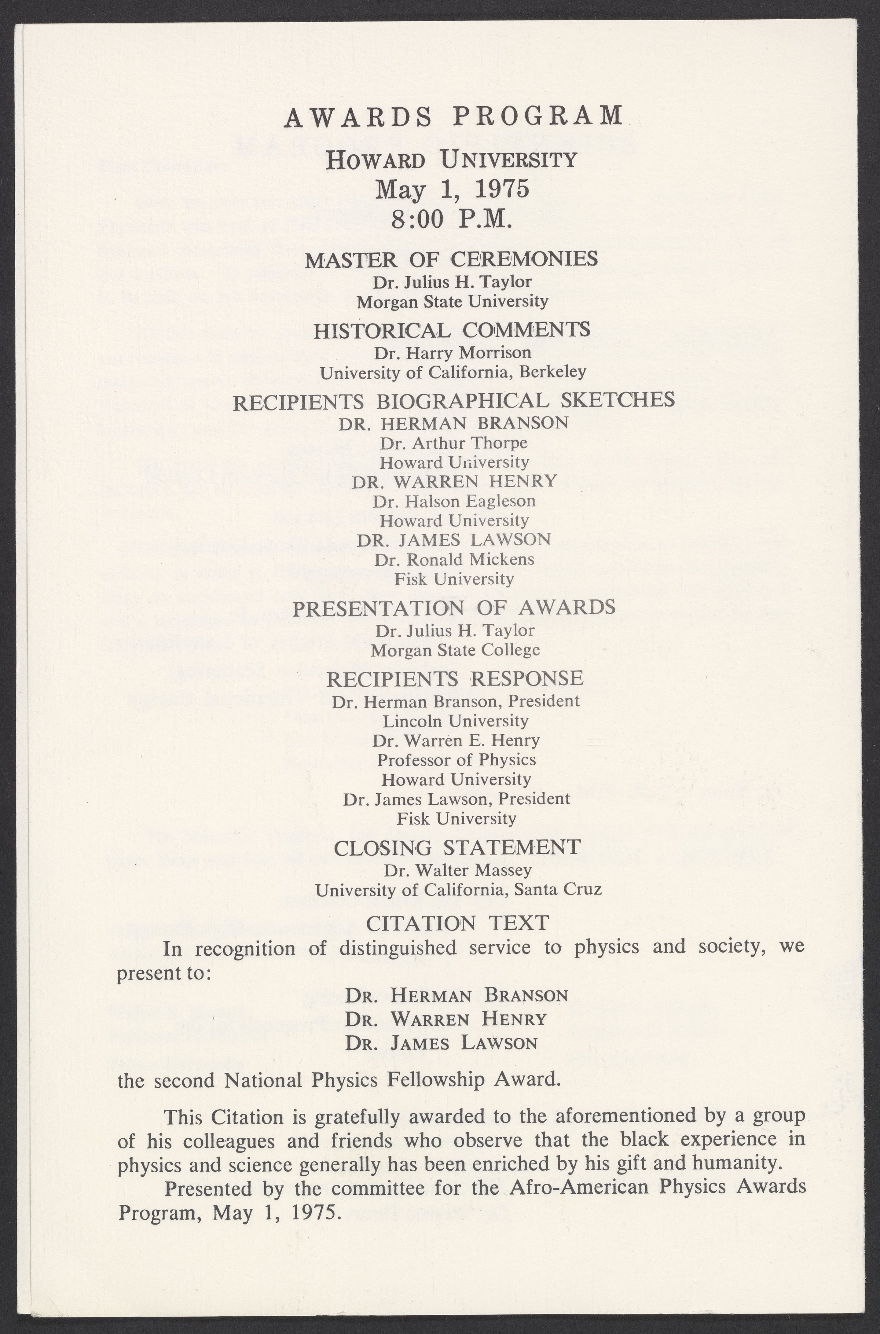 Committee for the Afro-American Physics Awards. “Second Awards Ceremony for Outstanding Black Physicists,” May 1, 1975. William A. Lester, Jr. Papers, Box 5, Folder 7. Science History Institute. Philadelphia. https://digital.sciencehistory.org/works/qqgp1ob.