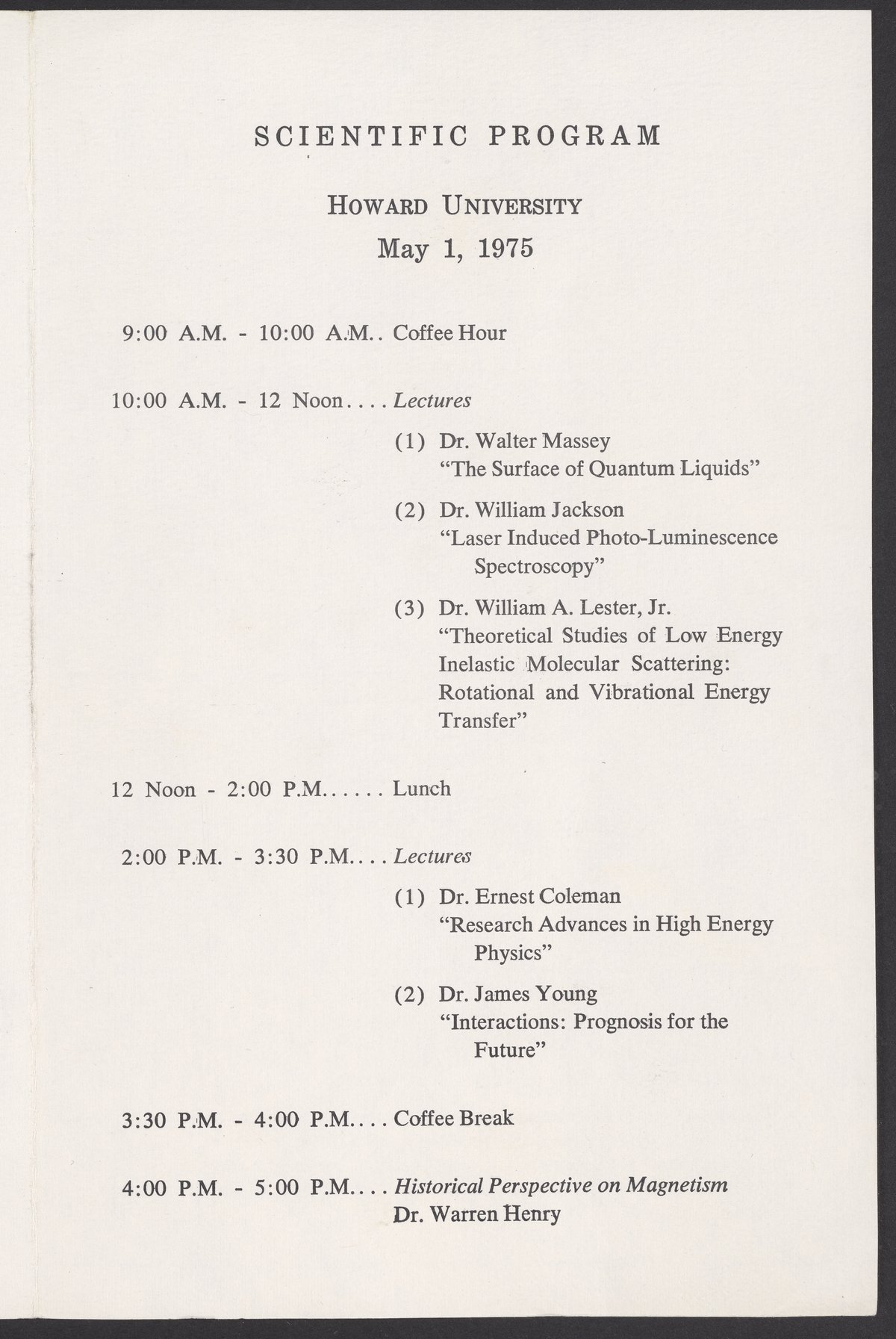 Small JPG1200 x 1813px — 360 KBLarge JPG2880 x 4351px — 2.3 MBFull-sized JPG3527 x 5329px — 3.5 MBOriginal fileTIFF — 3527 x 5329px — 53.8 MBProgram for the second Awards Ceremony for Outstanding Black Physicists, held at Howard University on May 1, 1975. The award ceremony honored Herman Branson (1914-1995), Warren E. Henry (1909-2001), and James R. Lawson (1915-1996). The event included a "Scientific Program," with lectures by Walter E. Massey (1938-), William M. Jackson (1936-), William A. Lester, Jr. (1937-), Ernest Coleman (1943-1990), James E. Young, and Warren E. Henry.