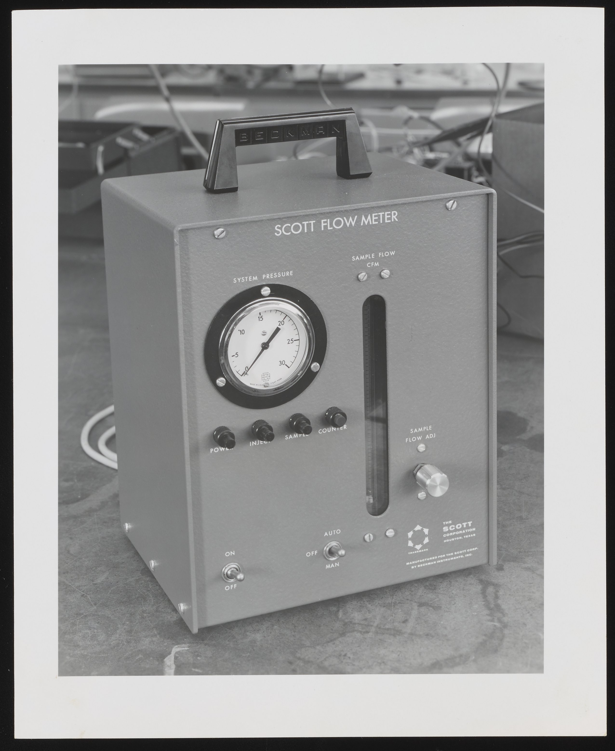 The gas flow meter was manufactured for Scott Corporation by Beckman Instruments.