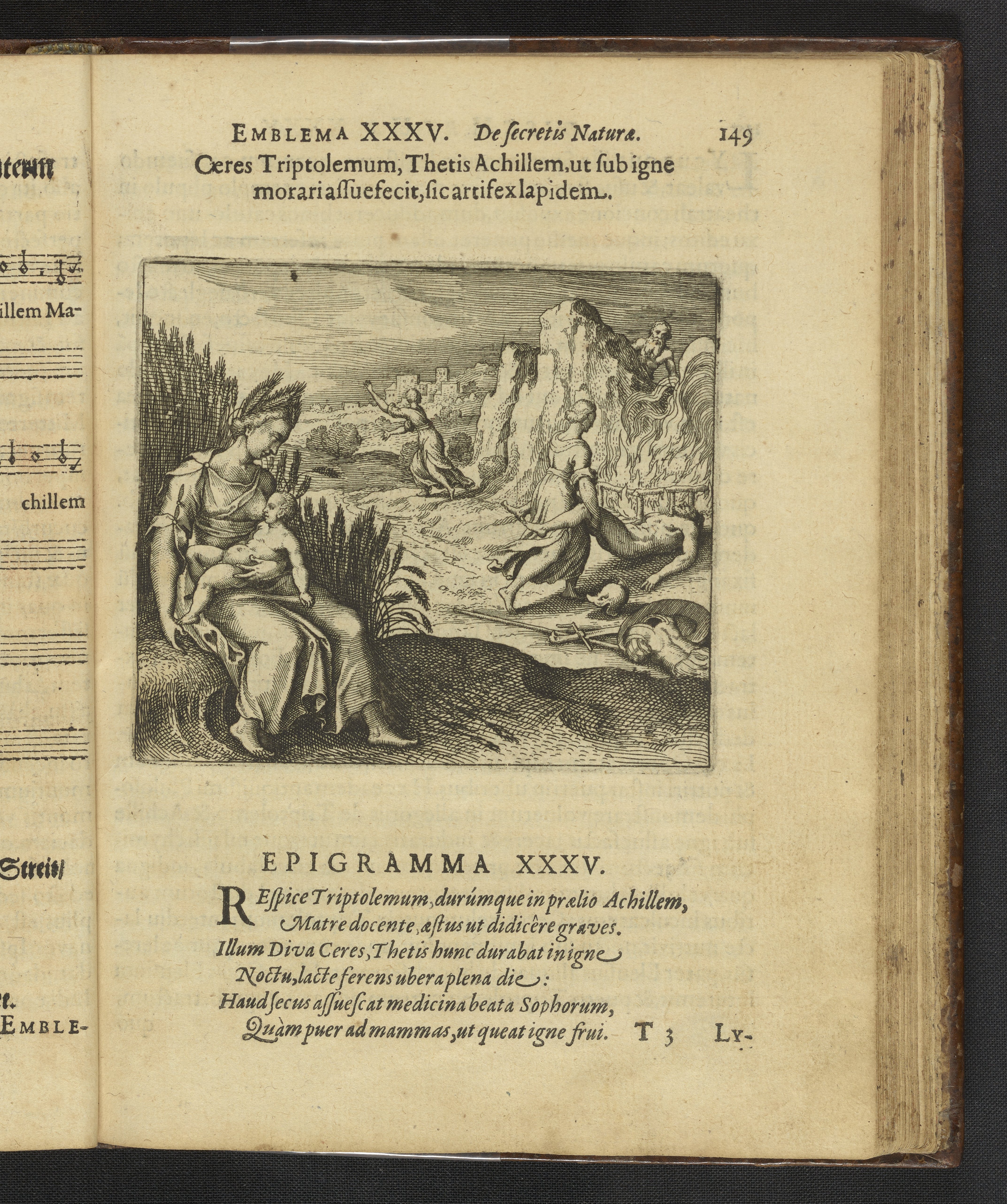 Emblema XXXV. Ceres Triptolemum, Thetis Achillem, ut sub igne morari assuefecit, sic artifex lapidem.