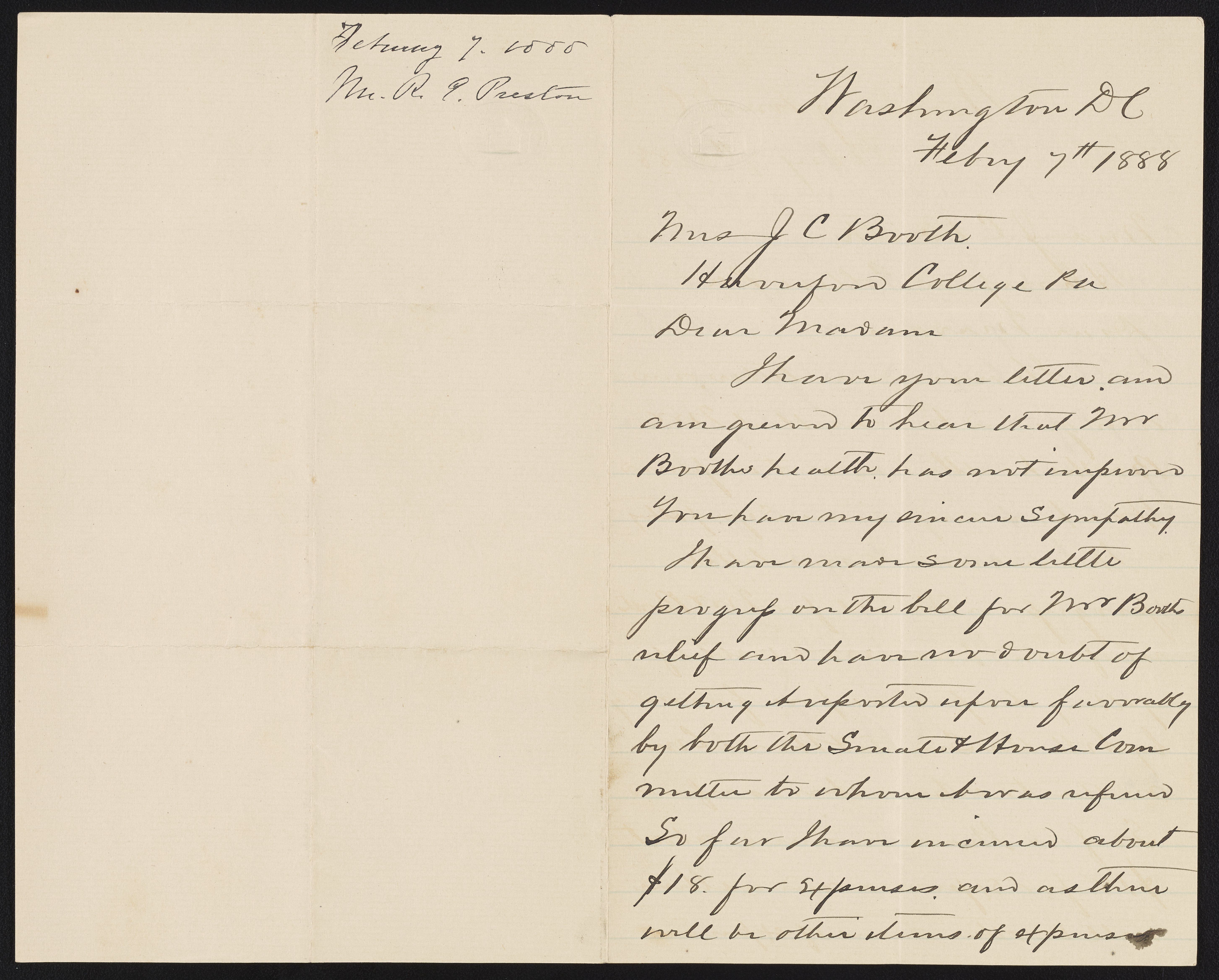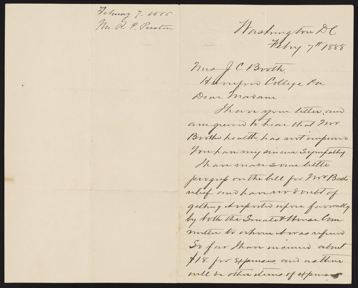 Letter from R.E. Preston to Margaret M. Booth, February 7, 1888