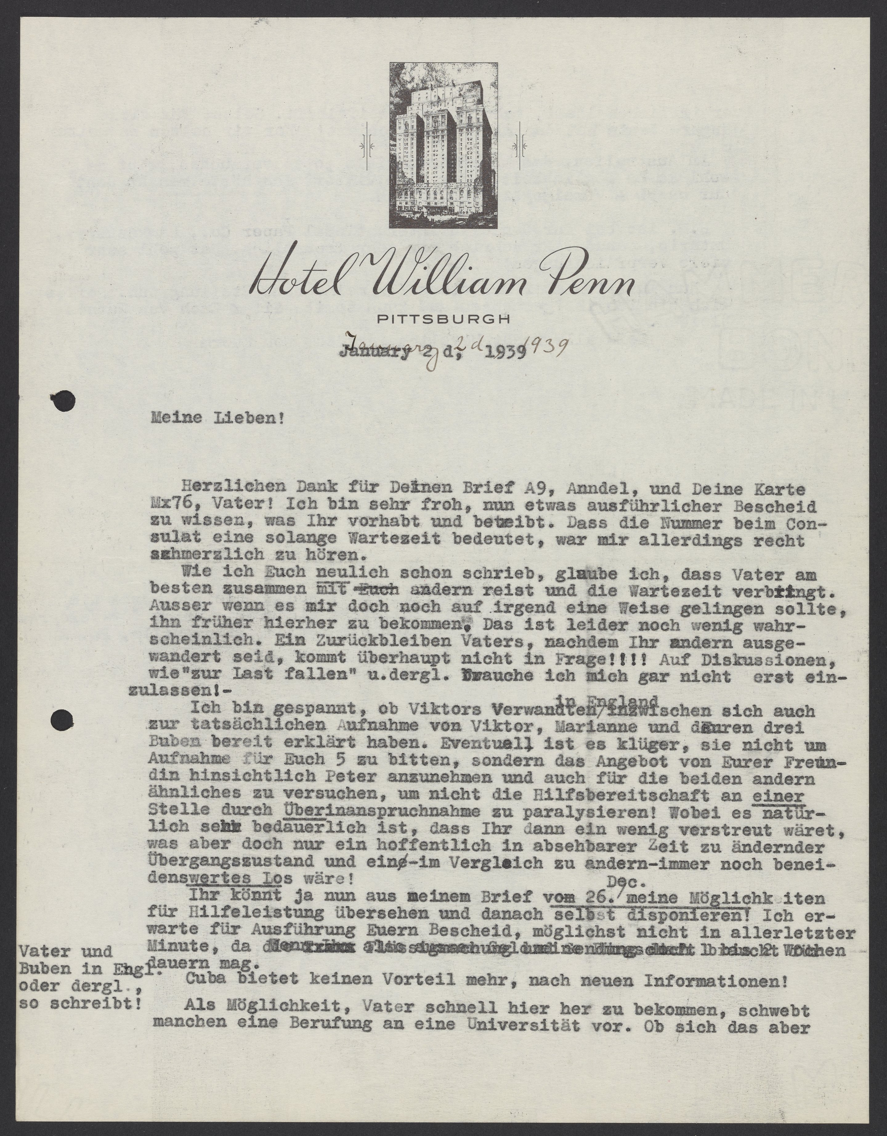 Wie ich Euch neulich schon schrieb, glaube ich, dass Vater am besten zusammen mit andern reist und die Wartezeit verbringt. Ausser wenn es mir doch noch auf irgend eine Weise gelingen sollte, ihn früher hierher zu bekommen. Das ist leider noch wenig wahrscheinlich. Ein Zurückbleiben Vaters, nachdem Ihr andern ausgewandert seid, kommt überhaupt nicht in Frage!!!! Auf Diskussionen, wie zur Last fallen u. dergl. brauche ich mich gar nicht erst einzulassen! –
