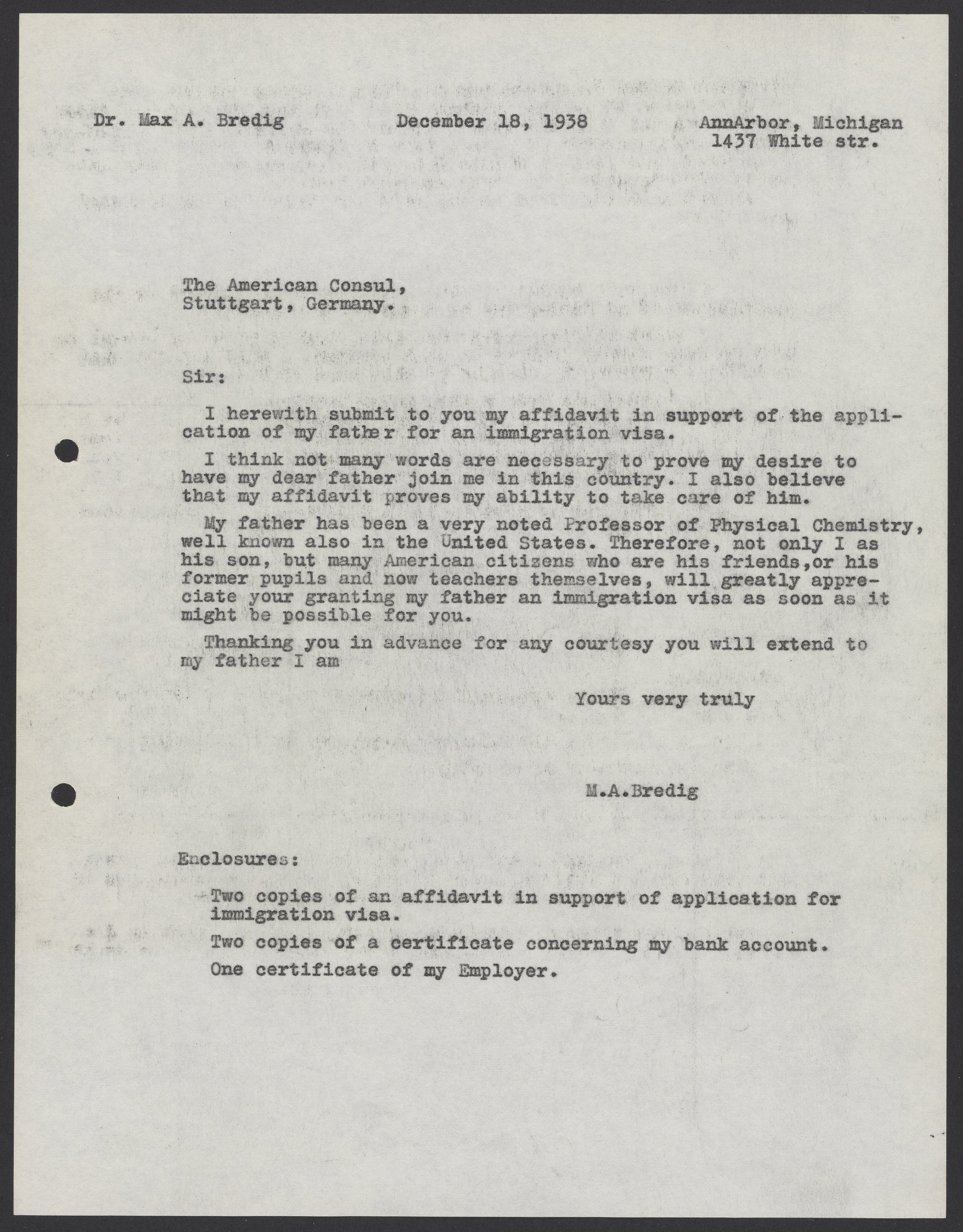 Bredig, Max Albert. “Letter from Max Bredig to the American Consul, Stuttgart, December 18, 1938,” December 18, 1938. Papers of Georg and Max Bredig, Box 7, Folder 19. Science History Institute. Philadelphia. https://digital.sciencehistory.org/works/qumgbop.