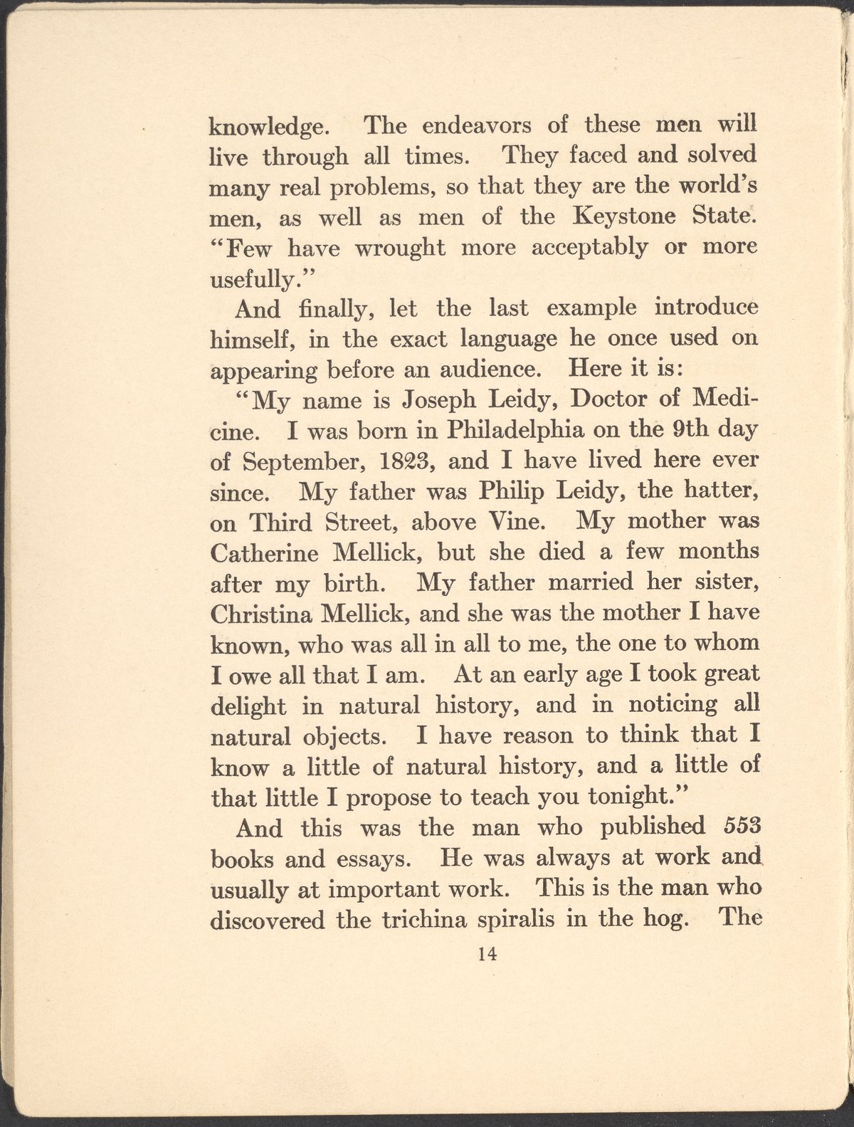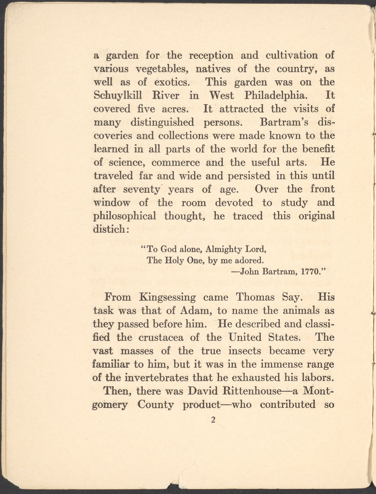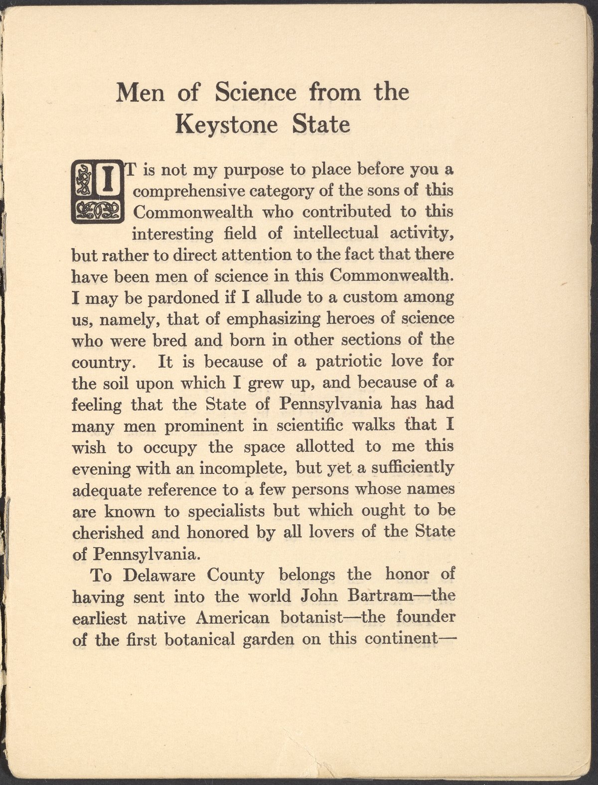 Small JPG1200 x 1562px — 341 KBLarge JPG2880 x 3748px — 1.9 MBFull-sized JPG2886 x 3756px — 1.9 MBOriginal fileTIFF — 2886 x 3756px — 31.0 MBEdgar Fahs Smith (1854-1928) was an American electrochemist known for his interest in the history of chemistry; he founded the American Chemical Society's Division for the History of Chemistry in 1922. Smith's résumé also included over 180 publications, leadership in several academic and professional organizations including as president of the American Chemical Society, and several honors for his work including the Priestly Medal in 1926. Smith was well-regarded as a public speaker. This speech was one of his many talks celebrating Pennsylvanian scientists such as John Bartram (1699-1777), David Rittenhouse (1732-1796), Benjamin Smith Barton (1766-1815), and Joseph Leidy (1823-1891).