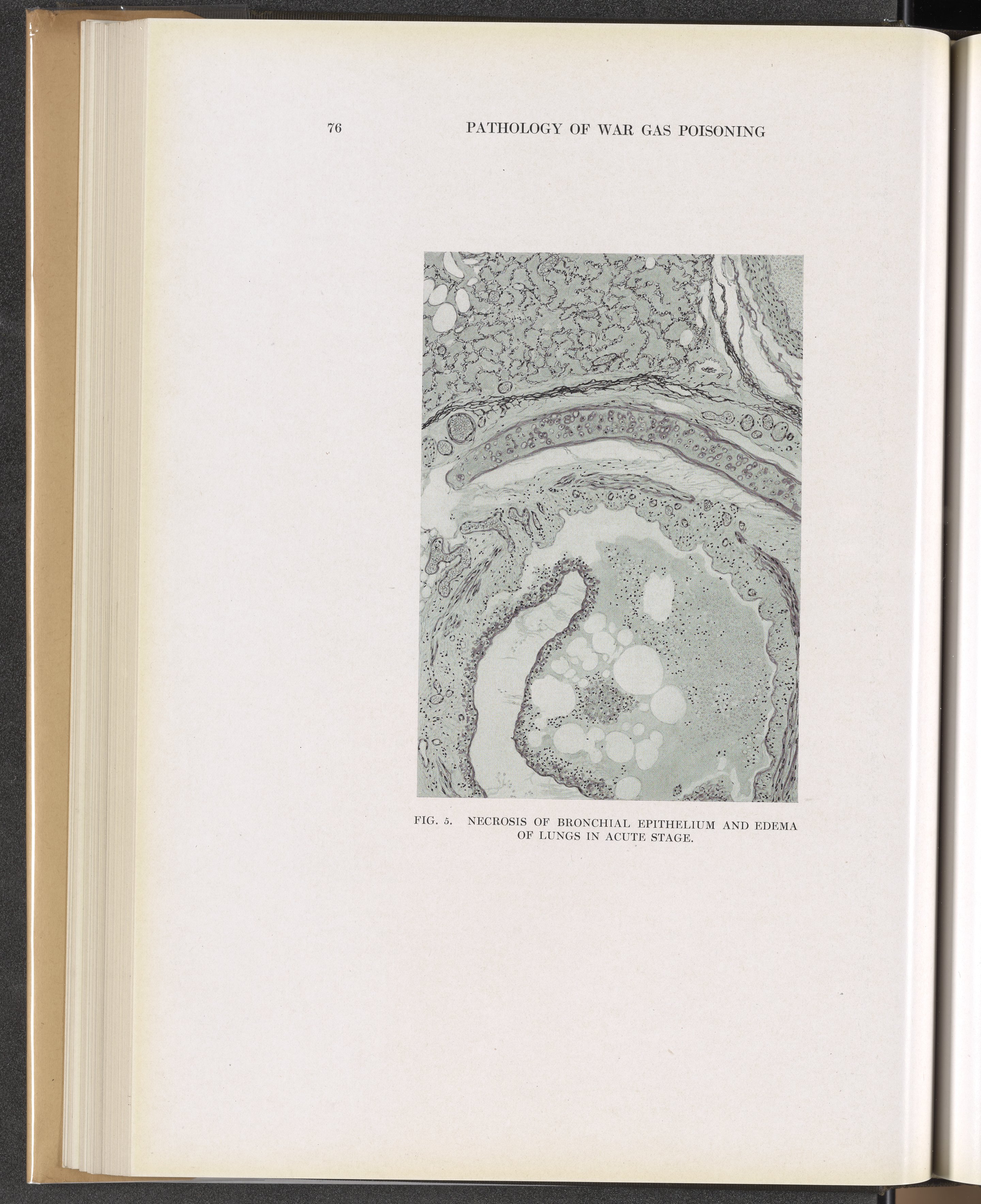 Winternitz, M. C. (Milton C.). “Fig. 5: Necrosis of Bronchial Epithelium and Edema of Lungs in Acute Stage.” Collected Studies on the Pathology of War Gas Poisoning. New Haven, Connecticut: Yale University Press, 1920. https://digital.sciencehistory.org/works/qv33rw787.
