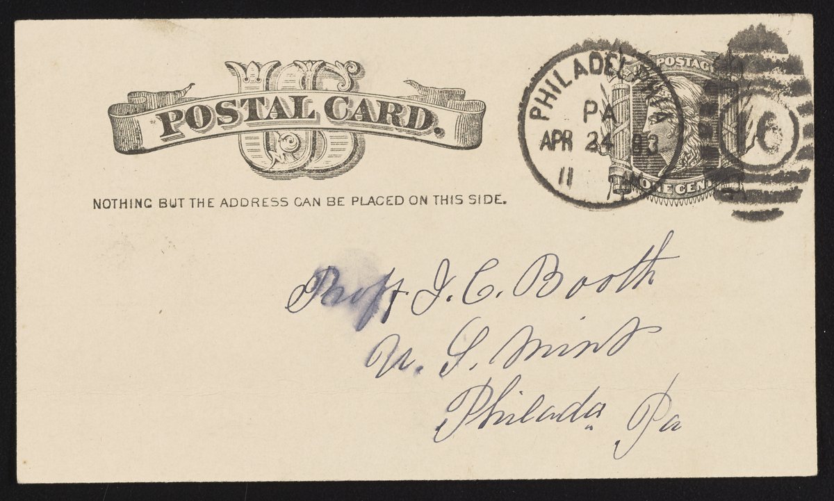 Postcard from J.W. Thomas to James Curtis Booth, April 23, 1883