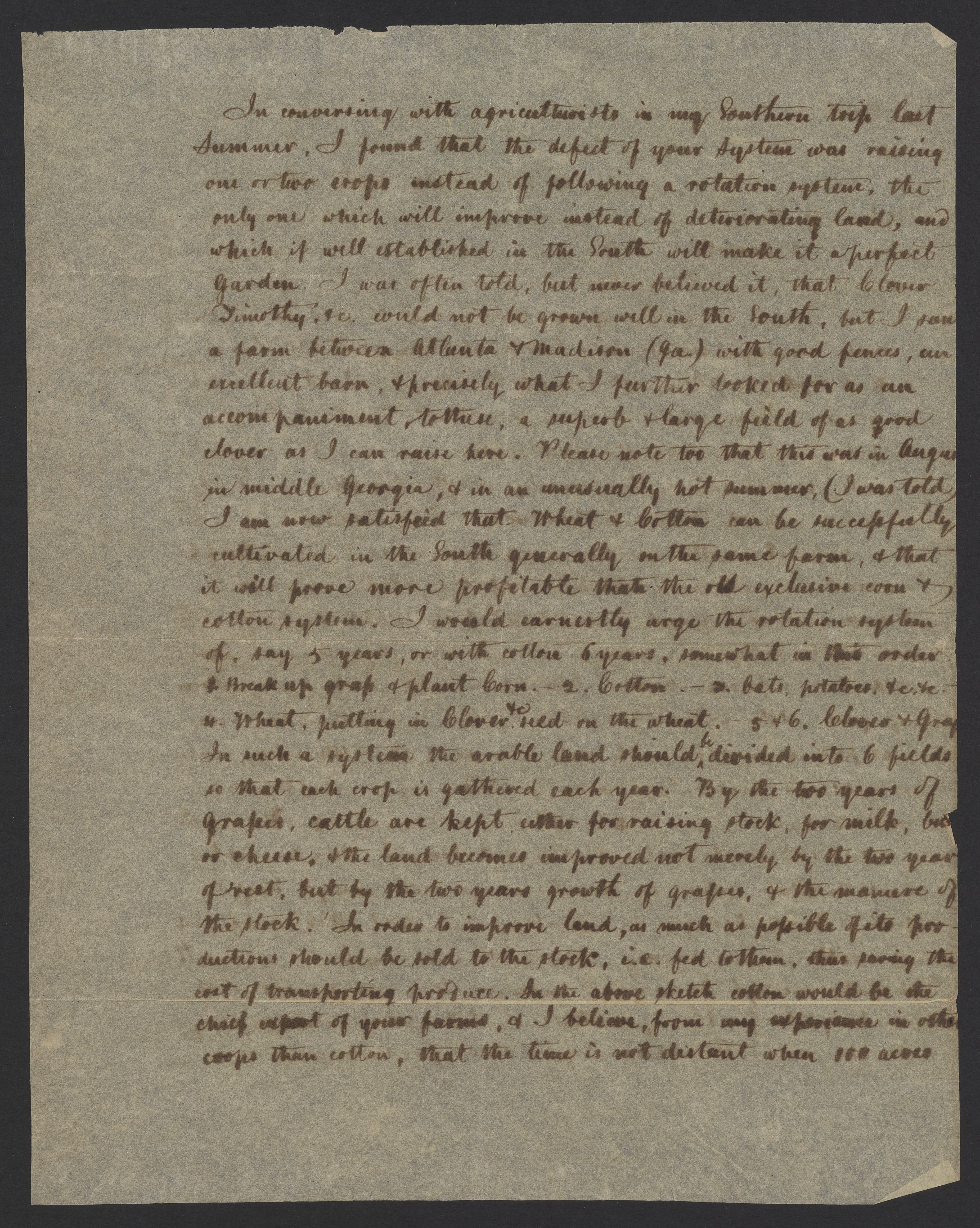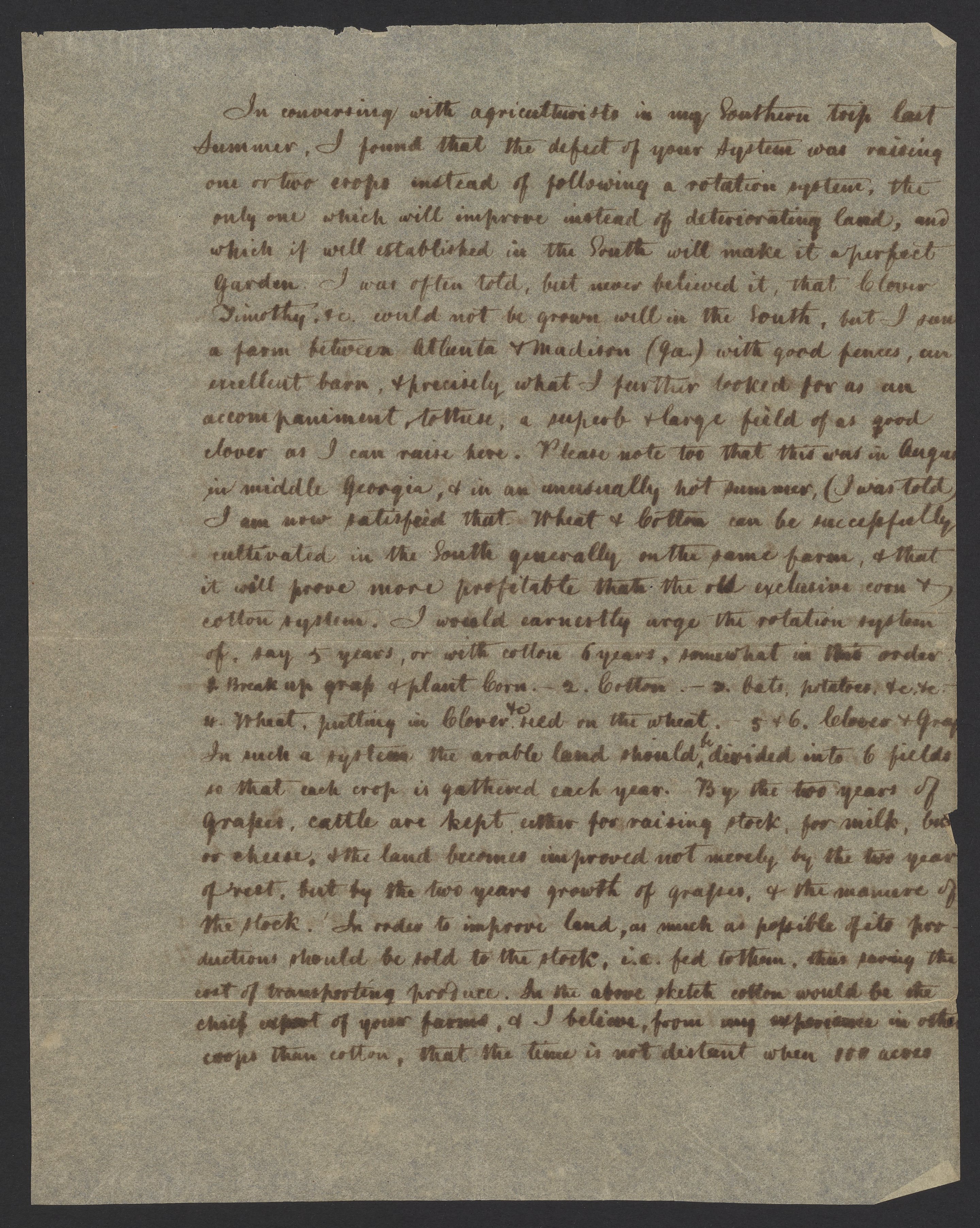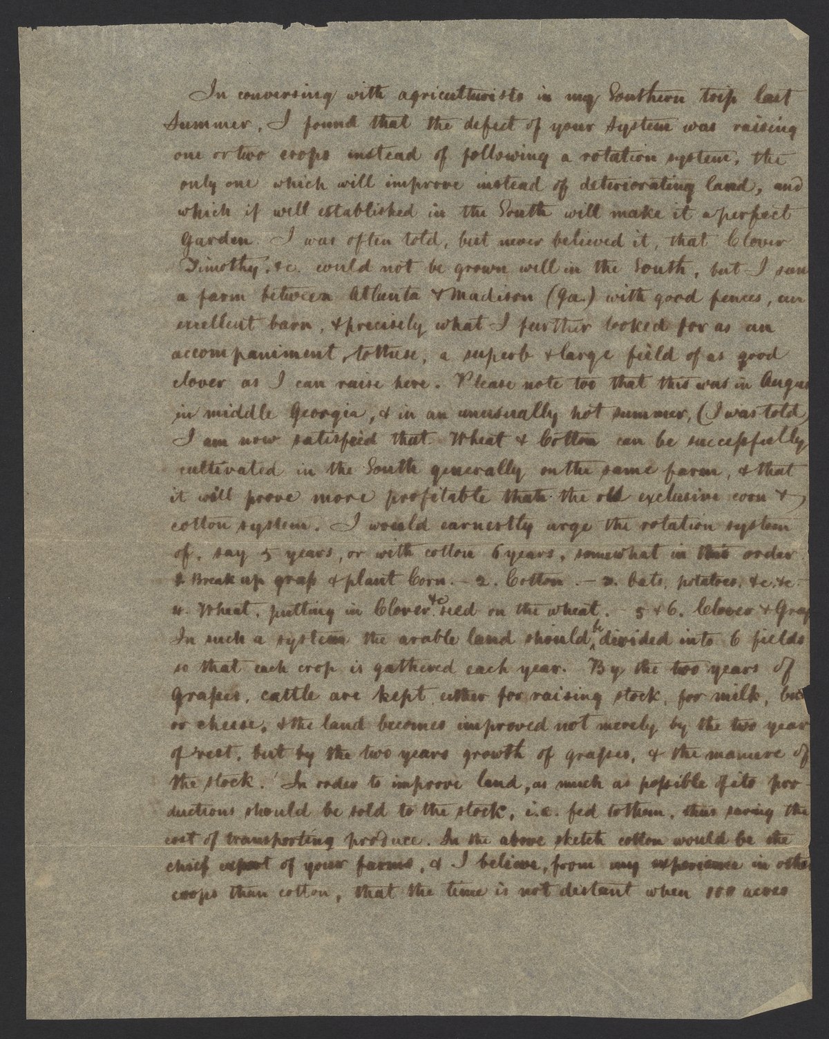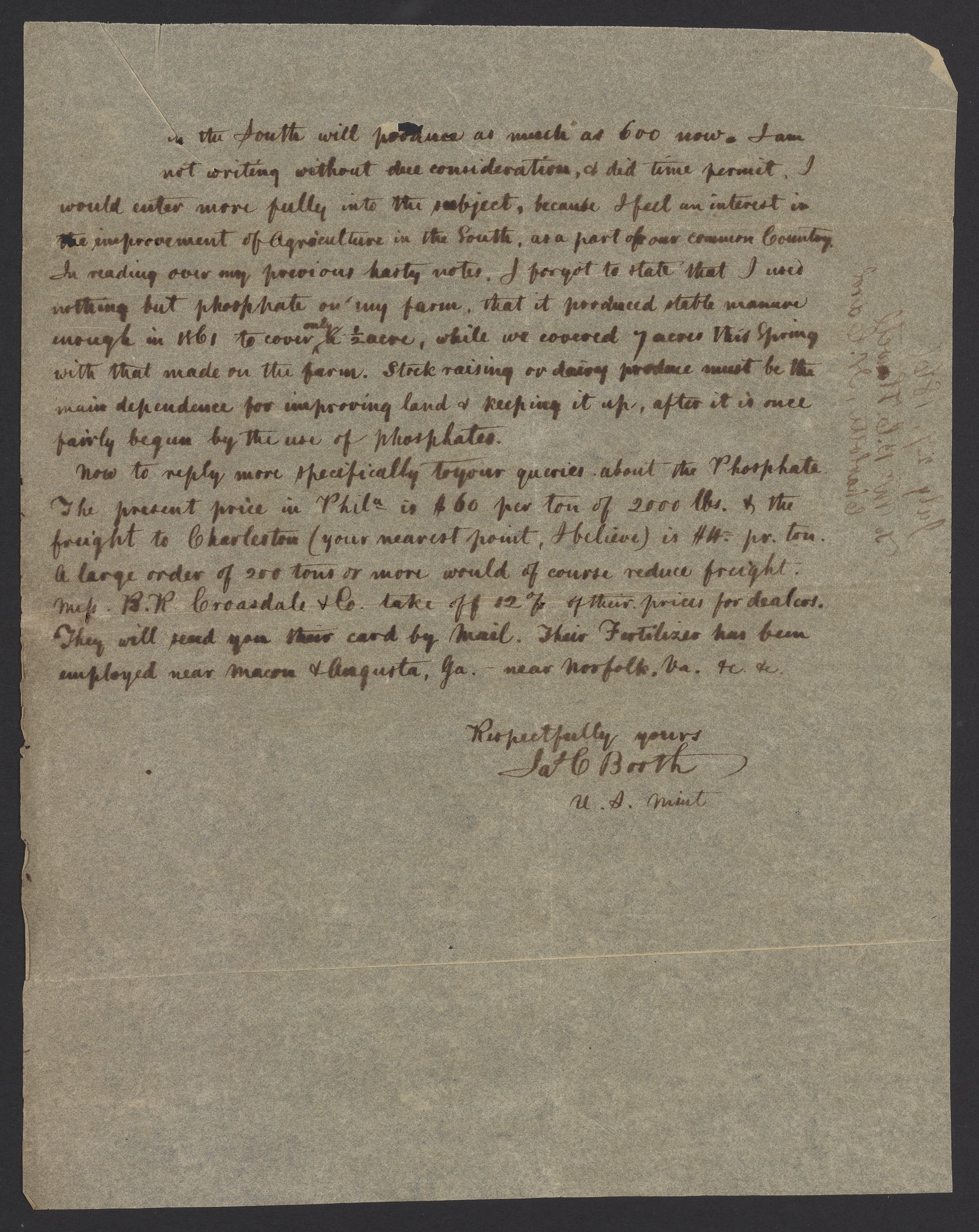 Small JPG1200 x 1515px — 406 KBLarge JPG2880 x 3636px — 2.5 MBFull-sized JPG3702 x 4674px — 3.8 MBOriginal fileTIFF — 3702 x 4674px — 49.6 MBJames Curtis Booth (1810-1888) writes to a Mr. S. M. Howell of Charlotte, North Carolina to suggest that Howell follow a rotation system for planting crops.