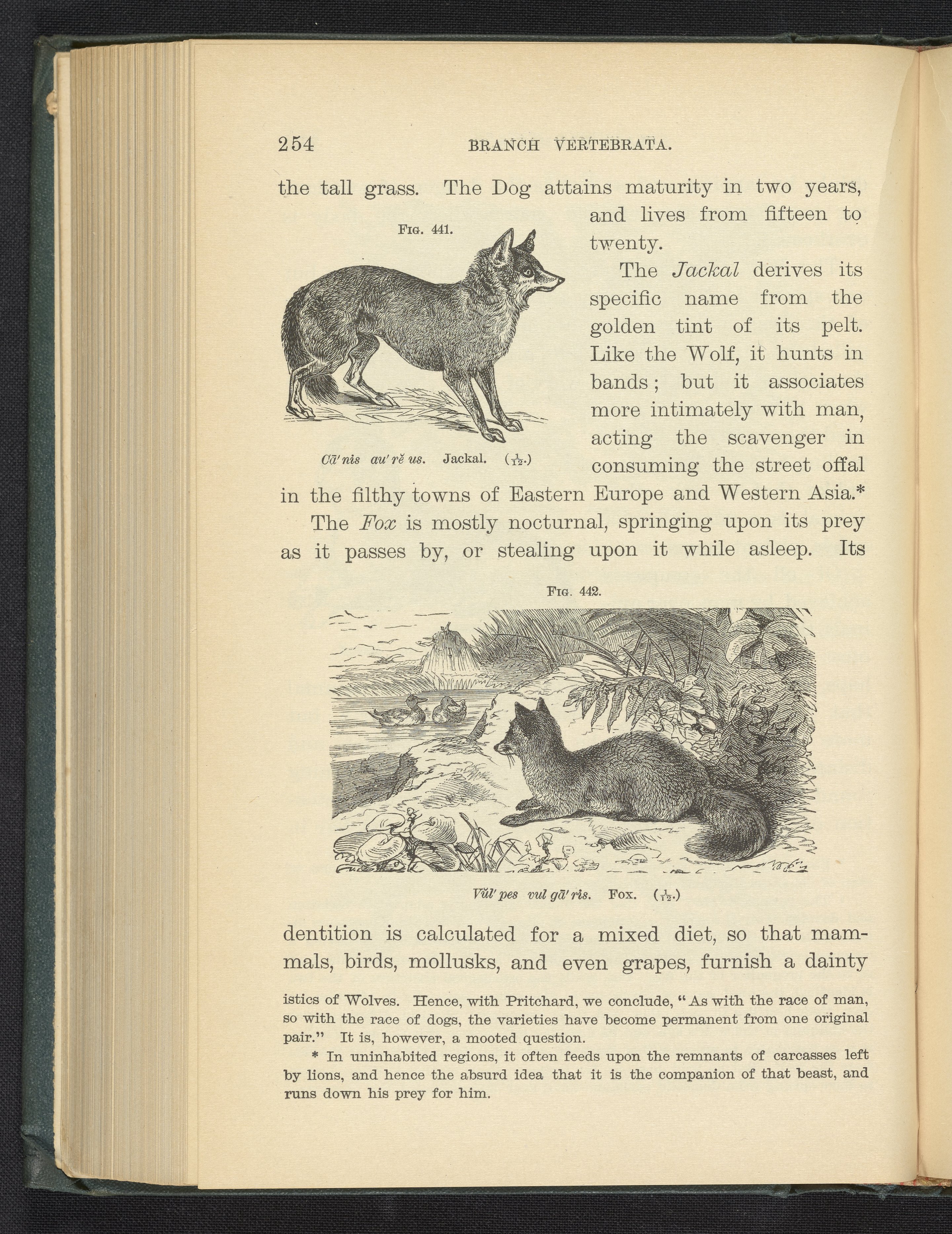 Steele, Joel Dorman, and Jenks, J. W. P. (John Whipple Potter). “Figure 441. Jackal. Figure 442. Fox.” Popular Zoology. New York, New York: Chautauqua Press, 1887. https://digital.sciencehistory.org/works/qwdndsi.