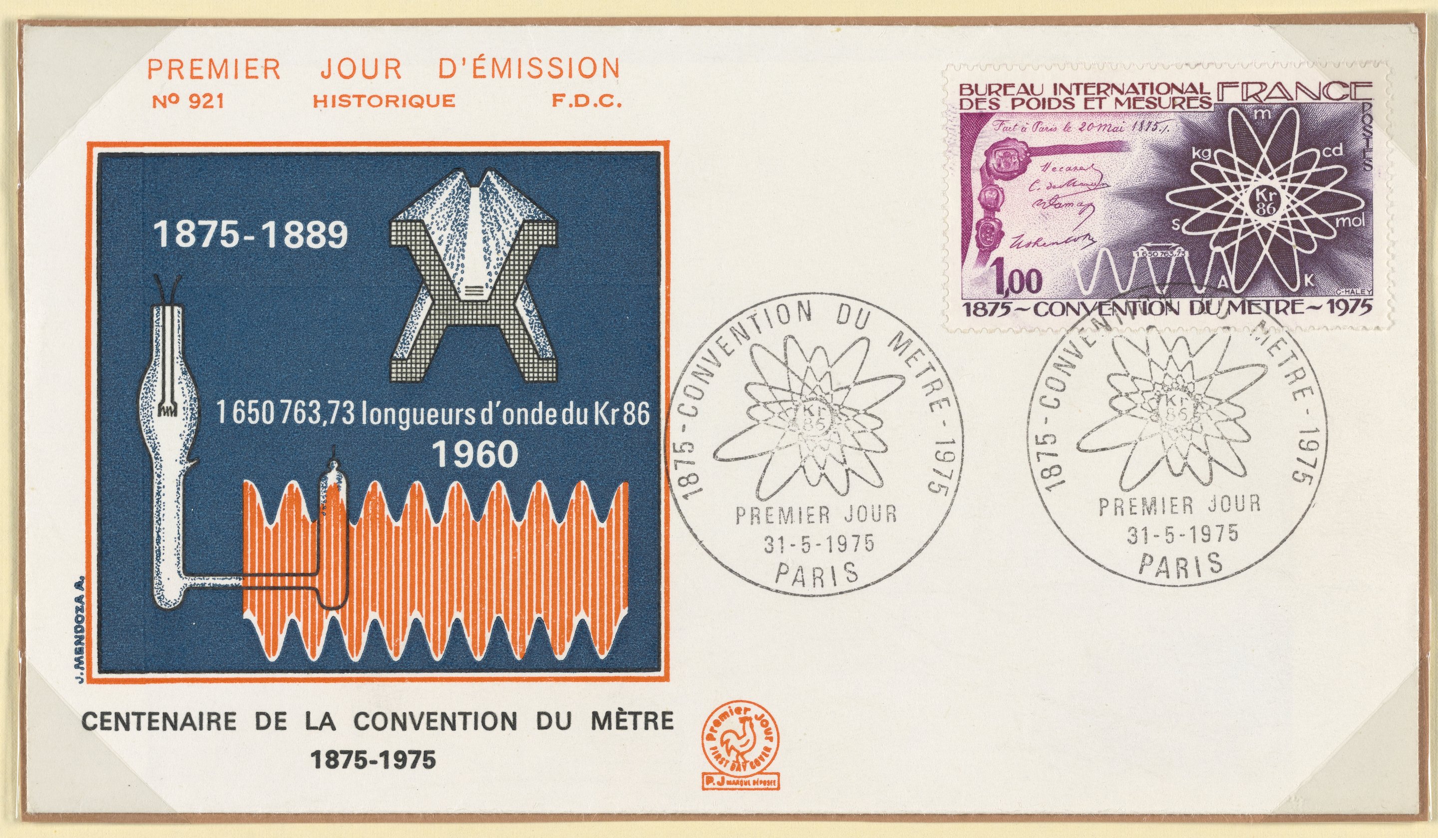 Mendoza, J. “First Day Cover Commemorating the Centenary of the Convention Du Mètre (Treaty of the Meter).” France, 1975. Witco Stamp Collection, Box 1. Science History Institute. Philadelphia. https://digital.sciencehistory.org/works/qz20ss53m.