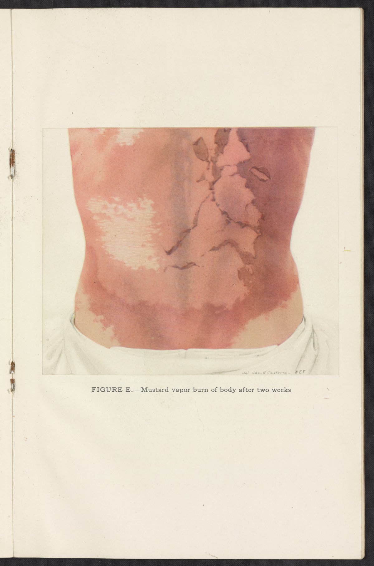 United States. Office of Civilian Defense. “Figure E.—Mustard Vapor Burn of Body after Two Weeks.” First Aid in the Prevention and Treatment of Chemical Casualties. Washington (D.C.): United States. Office of Civilian Defense, 1941. https://digital.sciencehistory.org/works/qz20st46d.