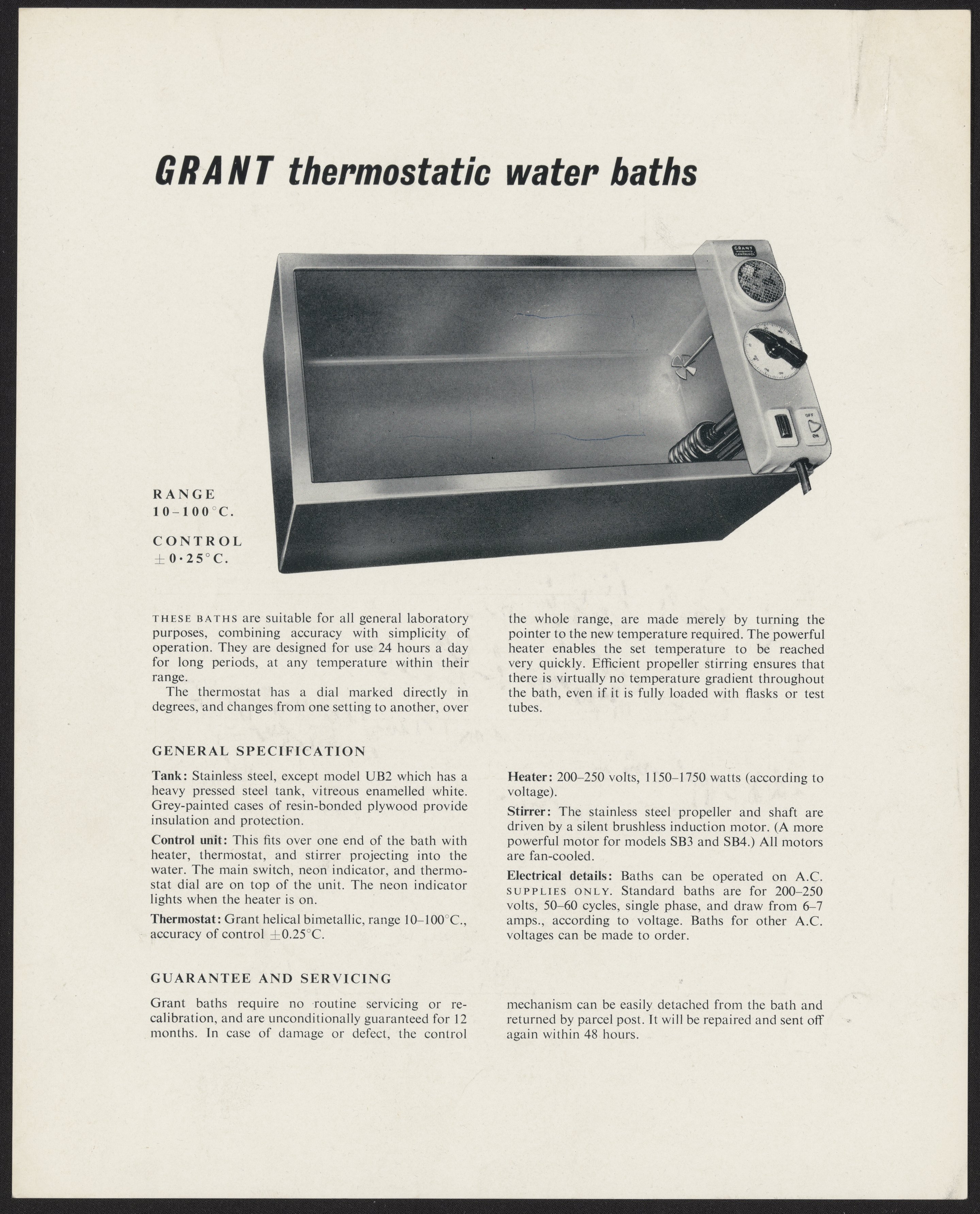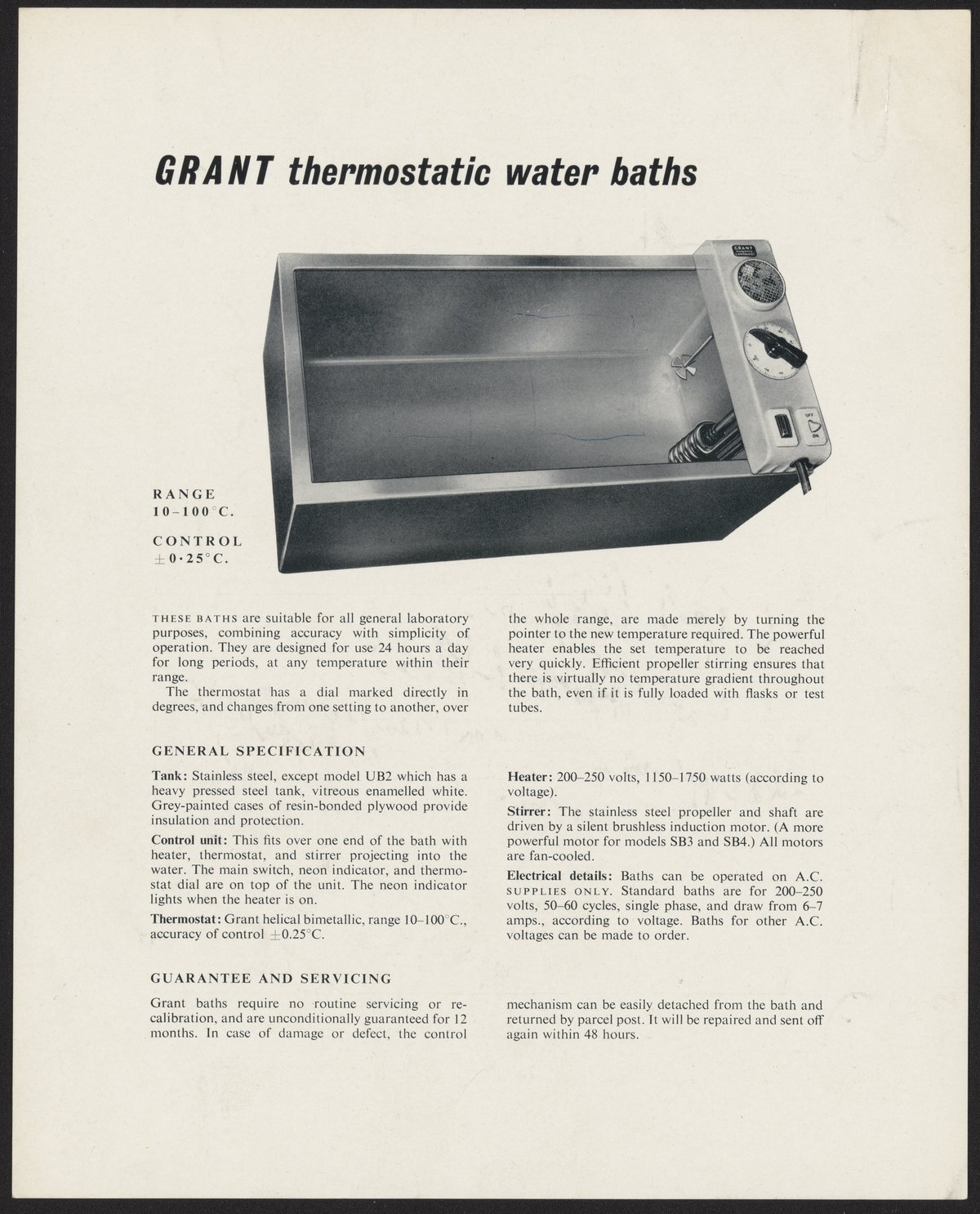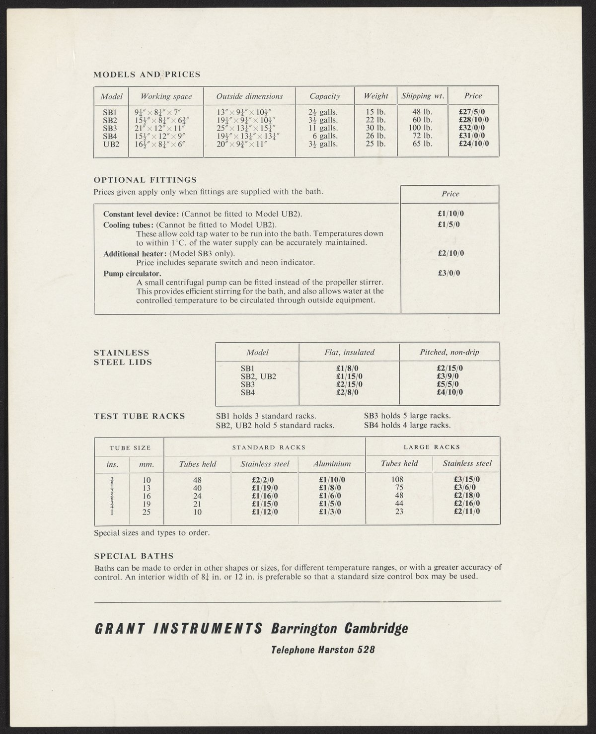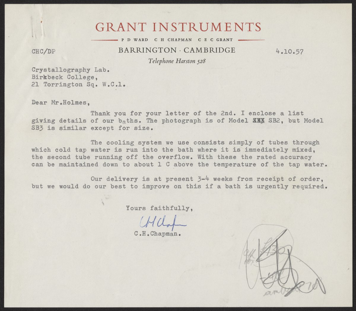 Letter from Grant Instruments to the Crystallography Lab at Birkbeck College. The letter includes information on models of thermostatic water baths.