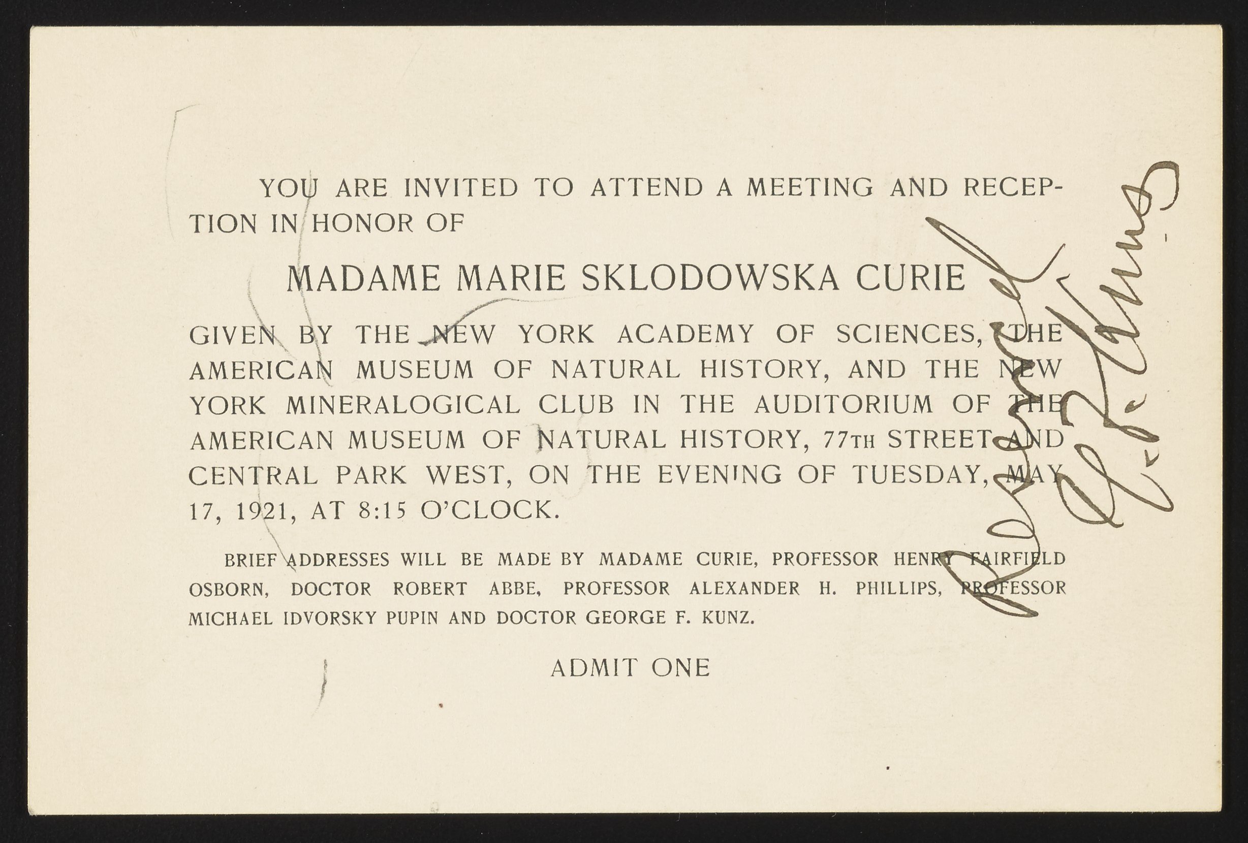 New York Mineralogical Club, American Museum of Natural History, and New York Academy of Sciences. “Reservation Card for Reception in Honor of Marie Sklodowska Curie by the New York Academy of Sciences, the Museum of Natural History and the New York Mineralogical Club,” n.d. Szymanowitz Autographed Letter Collection, Box 1. Science History Institute. Philadelphia. https://digital.sciencehistory.org/works/r207tp382.